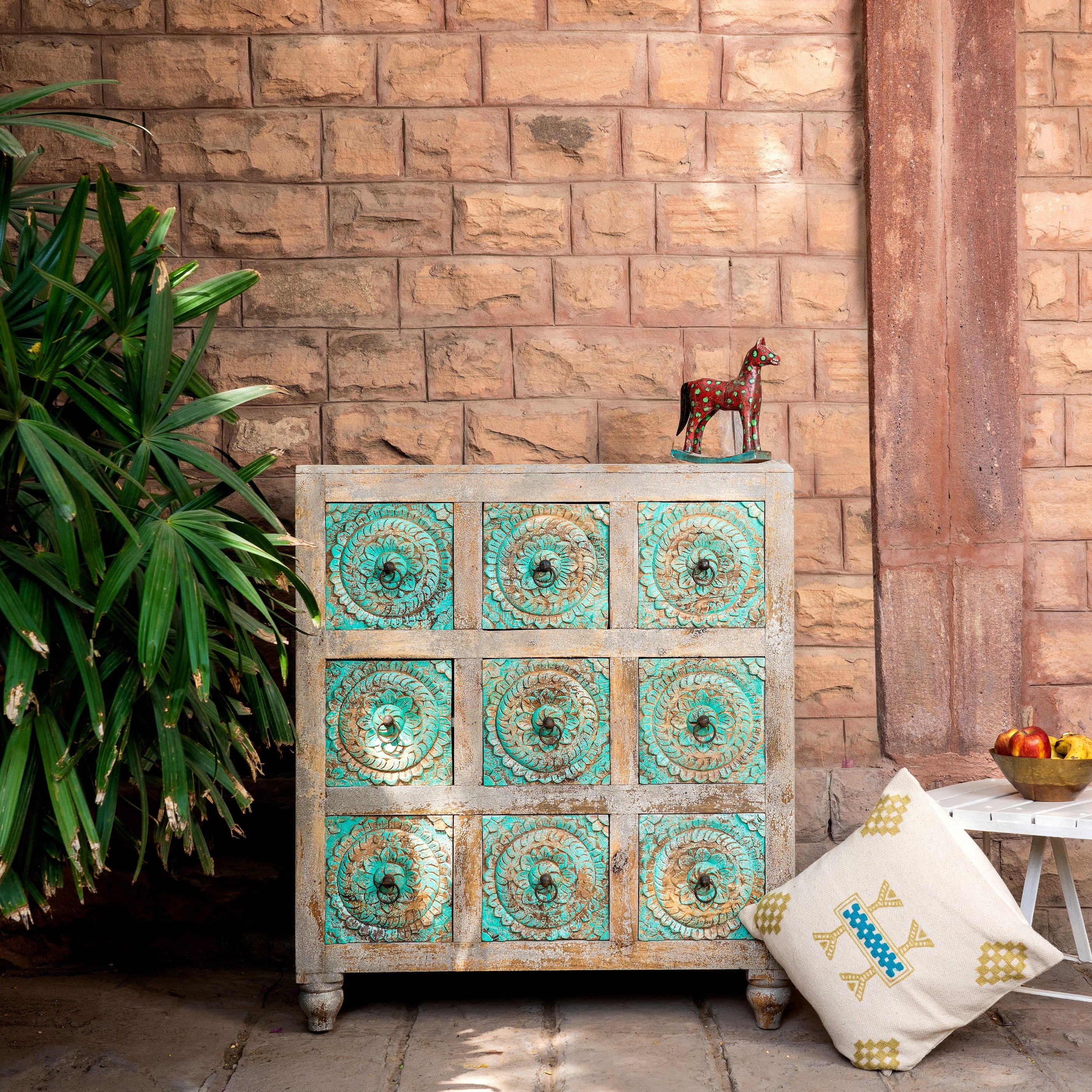 Indische Handwerkskunst zeigt sich in der Herstellung unserer Massivholzmöbel. Die aufwendig verzierten Schrankfronten sind handbemalt und überraschen durch ihr Farbspiel. Aufwendige Blumenmotive zieren die gesamte Oberfläche einzelner Schränke und sorgen dafür, dass Ihre Massivholzmöbel sehen aus wie Schränke. Doch das ist nicht alles: Die einzigartige Kombination aus robustem Holz und zarter Lackierung sorgt für einen besonderen Kontrast. Verstauen Sie Ihre Habseligkeiten in edlen Massivholzmöbeln und kreieren Sie mit unseren Angeboten Ihren ganz eigenen Stil.