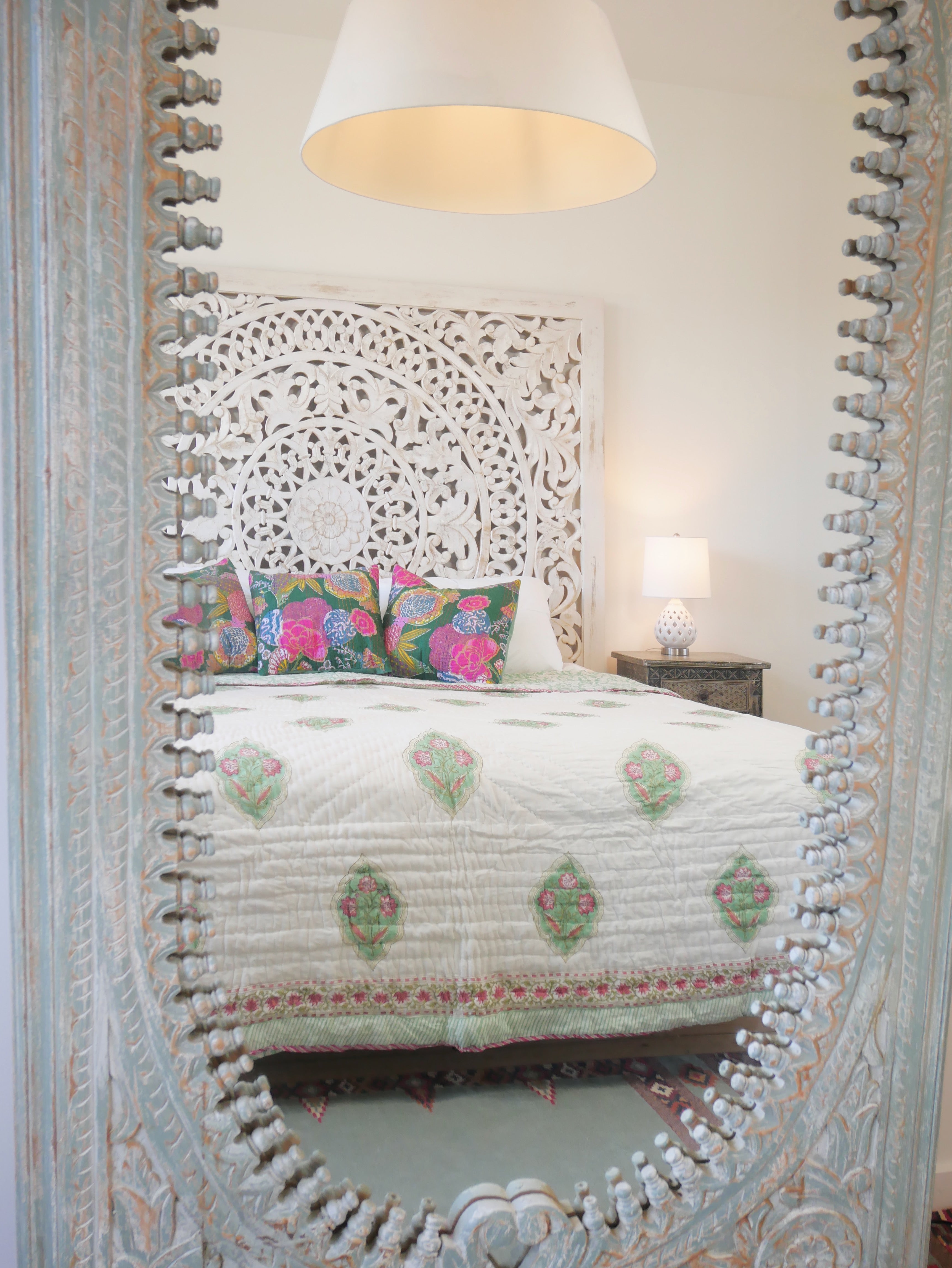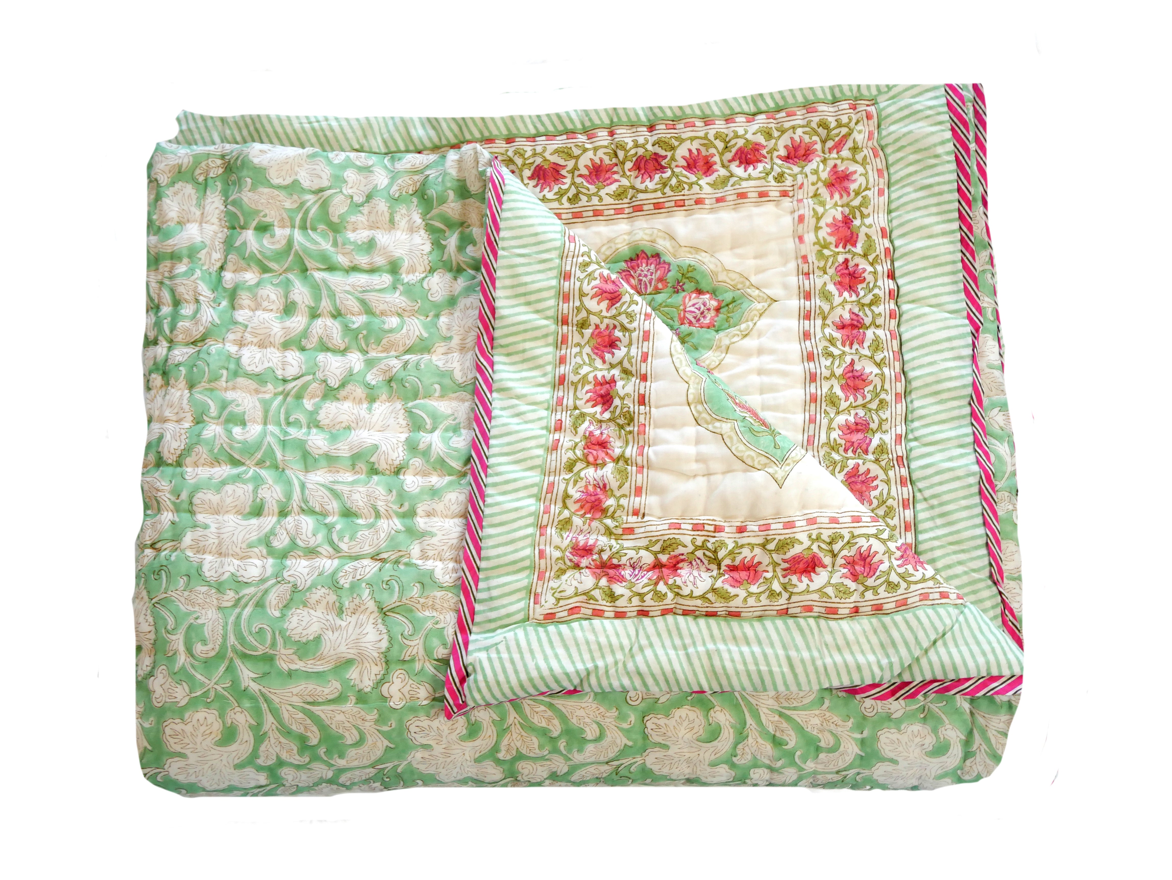 Der Quilt ist aufwendig von beiden Seiten mit verschiedenen Mustern in typischen Designs aus Rajasthan von Hand bedruckt und kann daher wie auf unseren Fotos gezeigt gedreht werden.