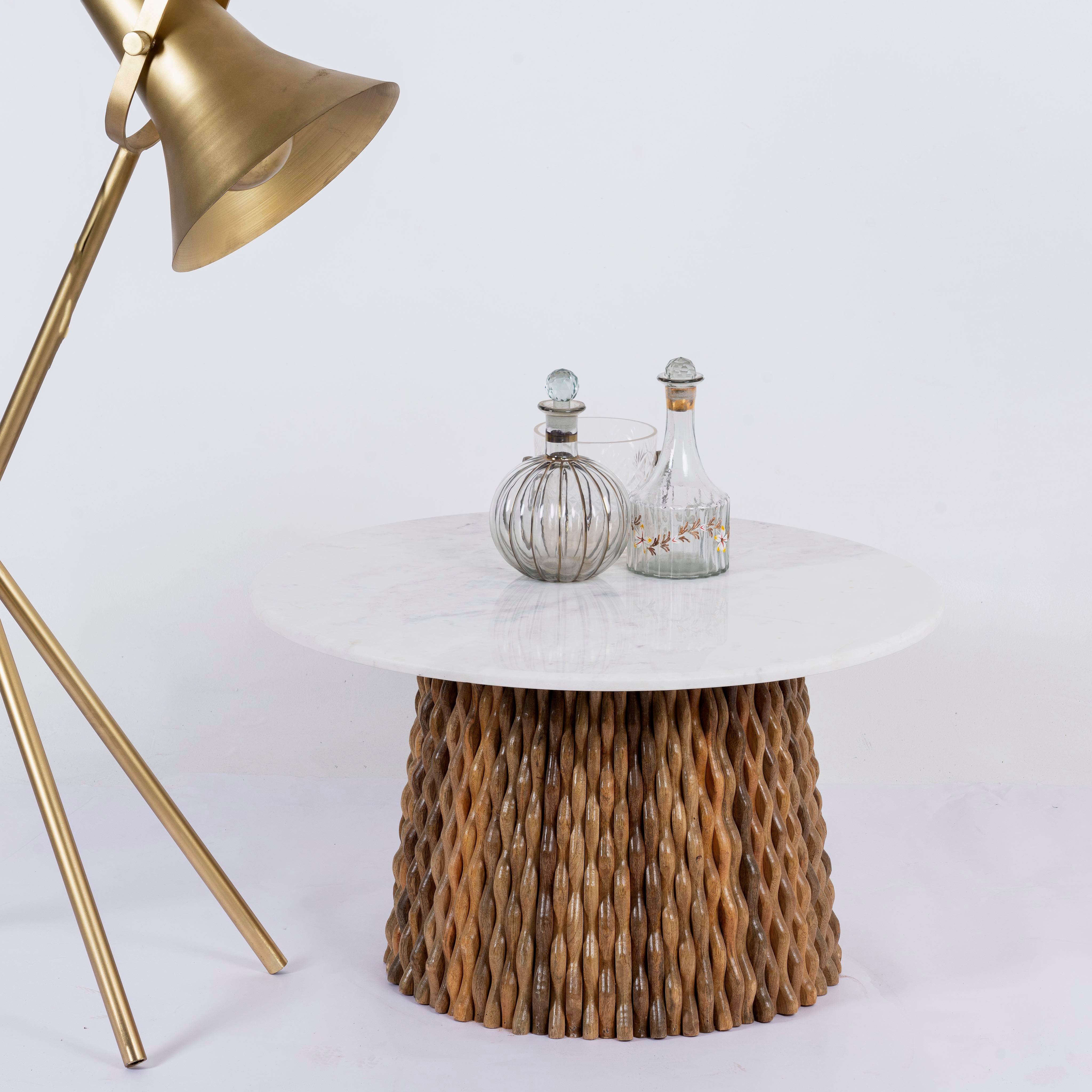 Lernen Sie unseren außergewöhnlichen Couchtisch Sureshi aus Holz kennen, ein Meisterwerk der Handwerkskunst und des Designs, das verspricht, zum Mittelpunkt Ihres Essbereichs zu werden. Dieser schöne Tisch verfügt über eine luxuriöse, naturweiße Marmorplatte und bietet eine glatte und elegante Oberfläche, die Raffinesse ausstrahlt. Der kühle, polierte Marmor kontrastiert wunderbar mit den warmen Tönen des Mangoholzsockels und sorgt so für einen harmonischen Materialmix.
