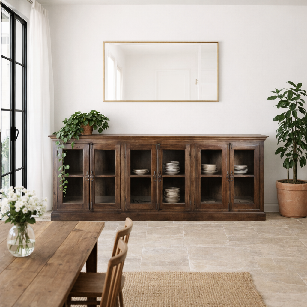 - Mediterraner StilDer mediterrane Wohnstil zeichnet sich durch natürliche Eleganz und entspannte Atmosphäre aus. Ein Sideboard aus orientalischem Mangoholz kann hier als zentraler Blickfang dienen. In Kombination mit Terrakottafliesen, sandfarbenen Wänden und maritimer Dekoration wirken die warmen Holztöne besonders effektvoll.