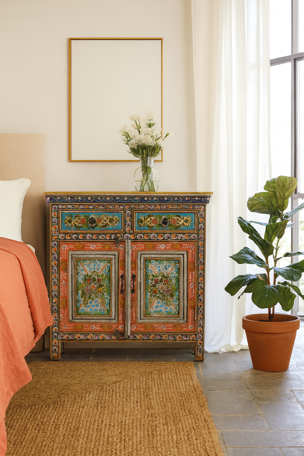Ethno Style: Kommoden mit kräftigen Farben und exotischen Mustern unterstreichen den Ethno-Stil. Sie passen hervorragend zu tiefen Brauntönen, dekorativen Vasen und Laternen, die ein kulturell vielfältiges Ambiente schaffen.
