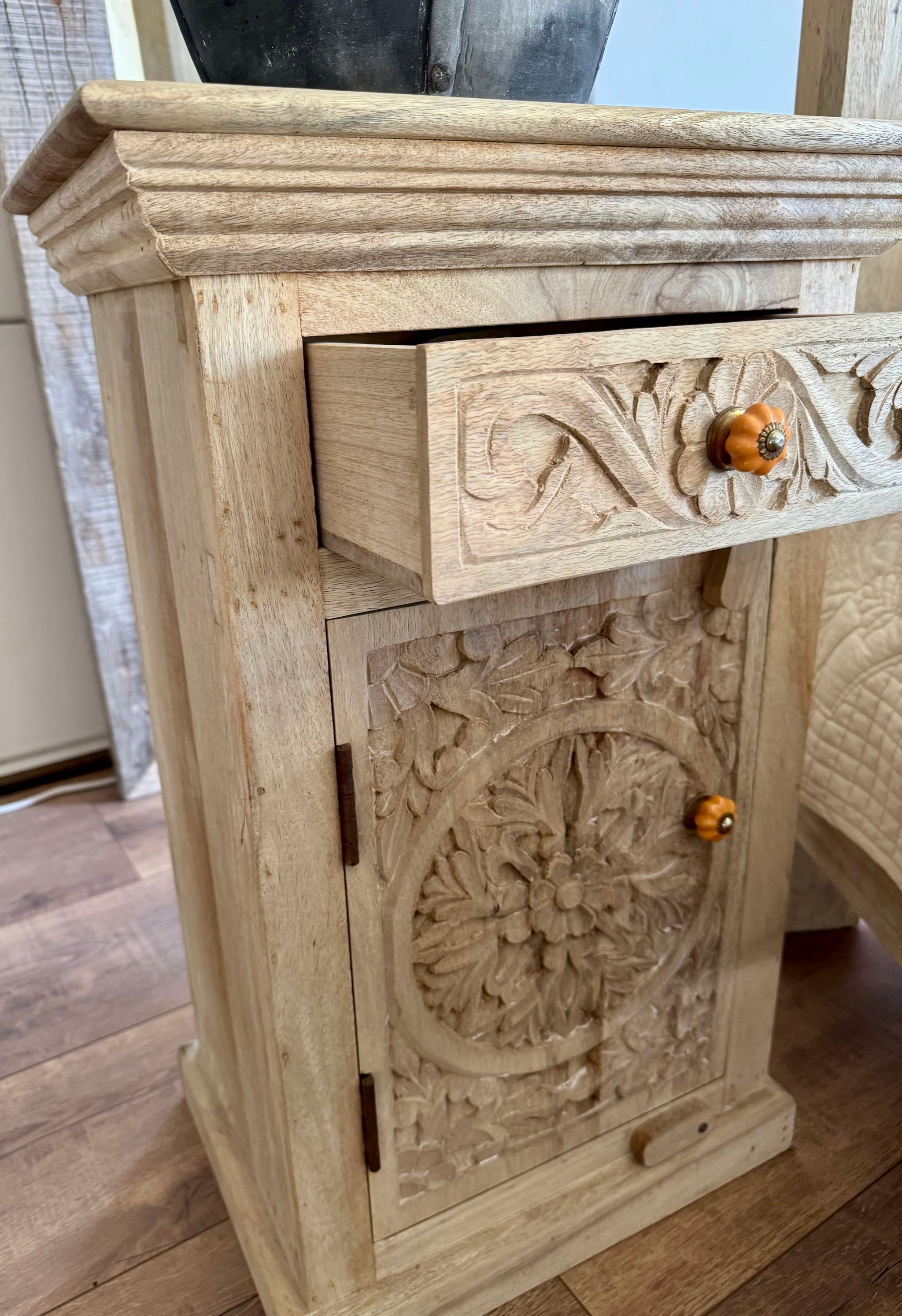 Introducing our bedside tables Hriday, a stunning carved pair made from sandblasted mango wood, designed to bring Mediterranean elegance and natural warmth to your bedroom. With intricate floral carvings and a soft-toned finish, these tables offer both detailed artistry and everyday practicality.
