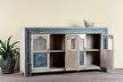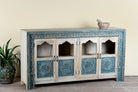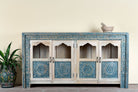 Introducing our hand-carved showcase Ahaana, a standout piece of vintage furniture that brings colour, craftsmanship, and character into your living space. Made from solid mango wood, Ahaana features four arched glass-panel doors with striking blue floral medallions—expertly hand-carved and painted to celebrate the richness of Indian design.