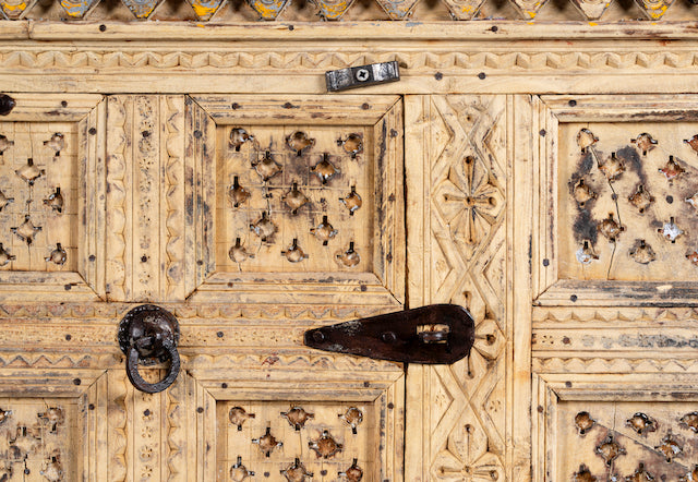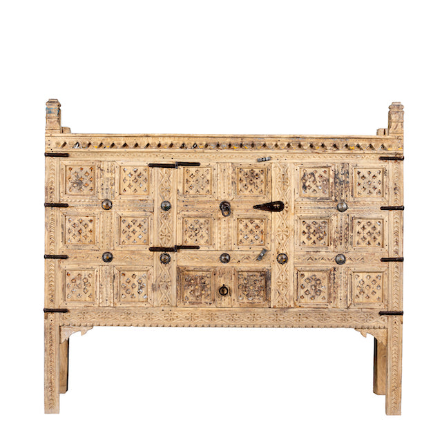 Werten Sie Ihr Interieur mit dieser atemberaubenden sandgestrahlten antiken indischen Schatztruhe auf, einem wahren Meisterwerk der Handwerkskunst. Diese handgeschnitzte Truhe aus massivem Teakholz weist komplizierte Details und Eisenapplikationen auf und verkörpert eine perfekte Mischung aus Tradition und Ibiza-inspiriertem Stil.