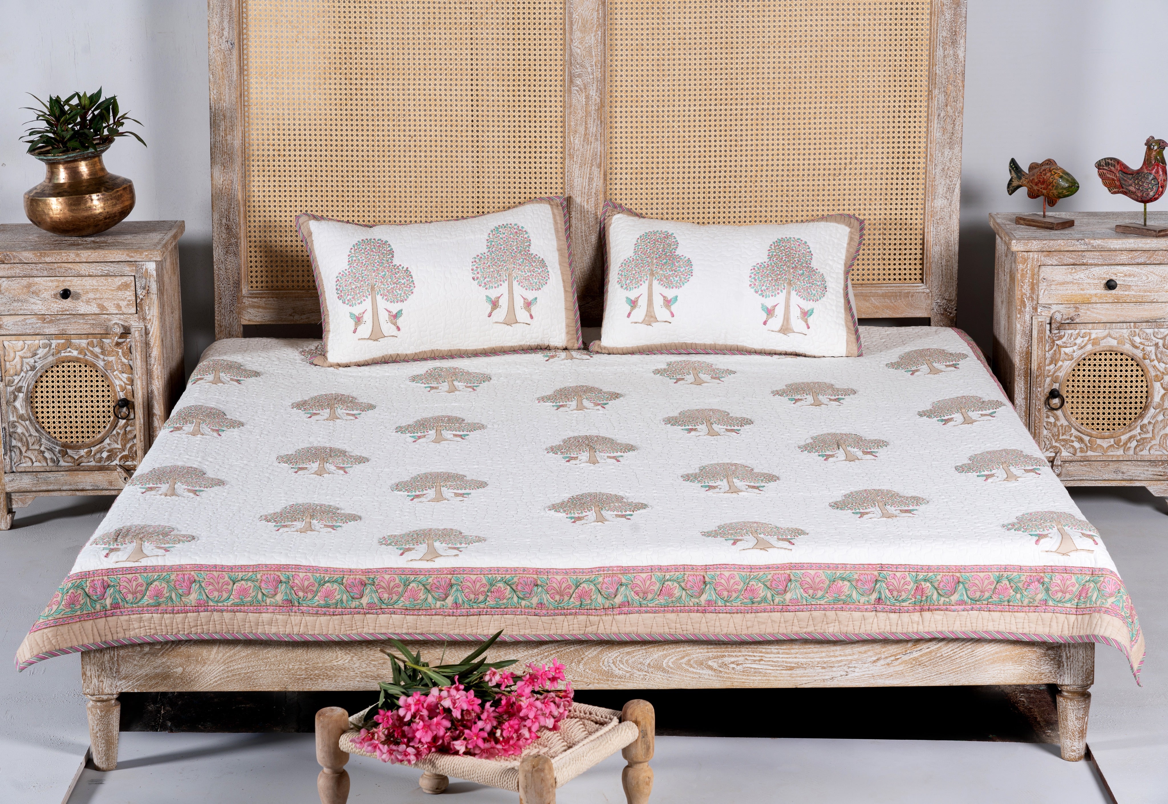 Diese wunderschöne handgefertigte Tagesdecke mit Blockdruck im Format 220 x 250 cm ist auf beiden Seiten bedruckt und kann in zwei verschiedene Musterkombinationen gedreht werden.