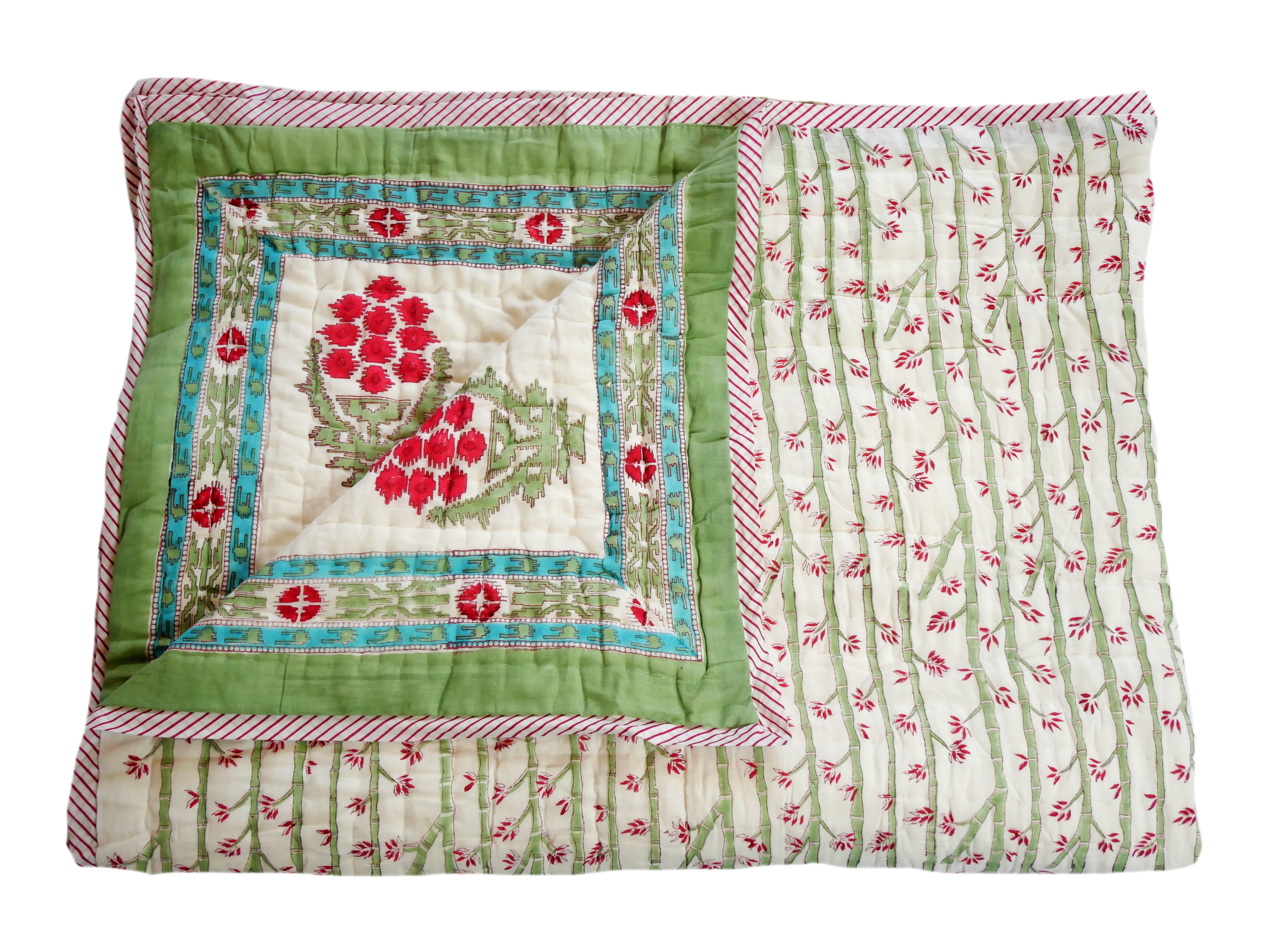 Es ist handgenäht und weist aufwendige handgemachte Blockdrucke aus Rajasthan auf.