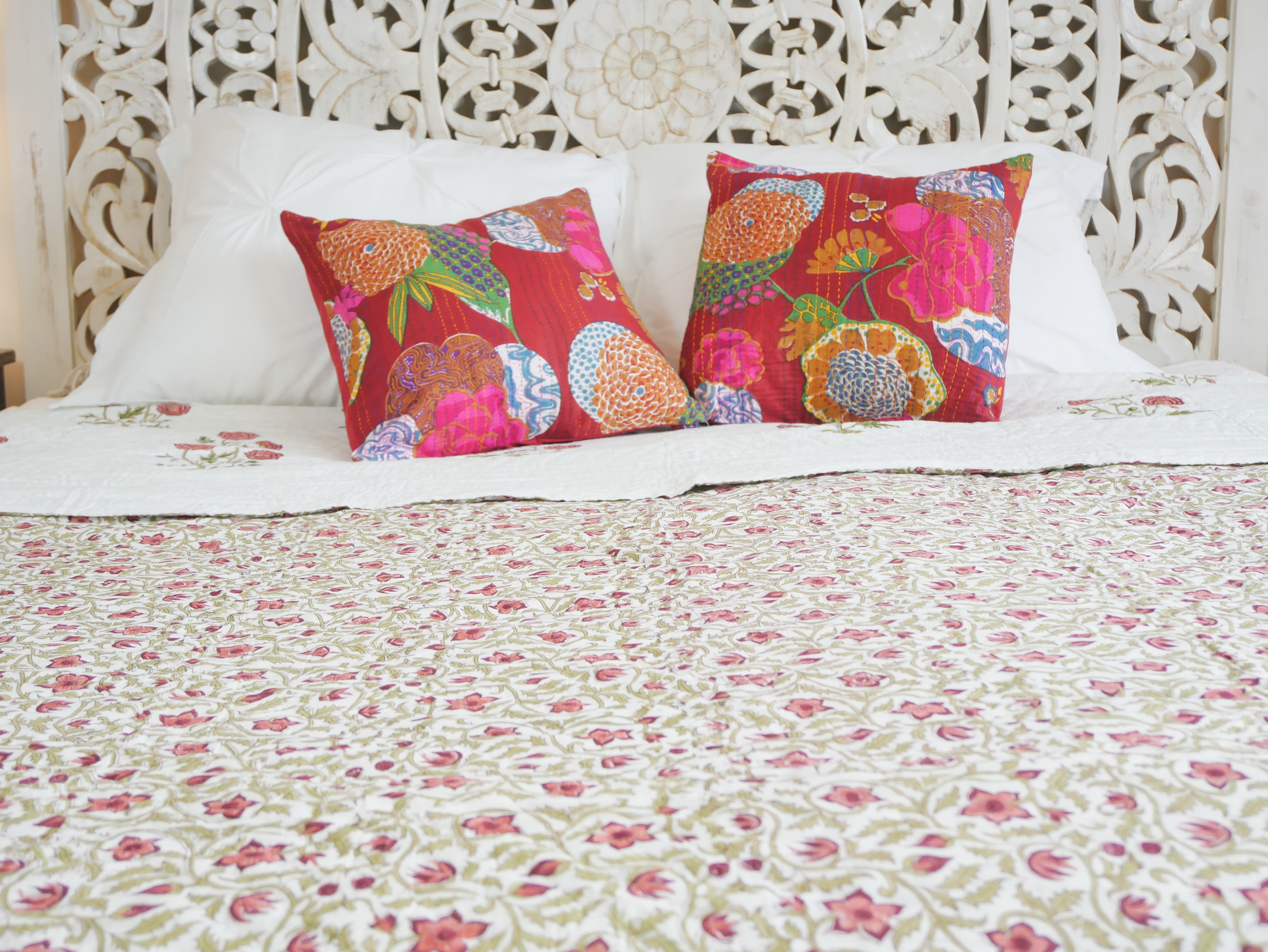 Diese Decke ist ein Luxus purer Handarbeit: Von Hand bestickt und genäht und die typischen Blumenmotive von Rajasthan werden im Blockdruck von Hand auf beide Seiten der Decke aufgebracht.