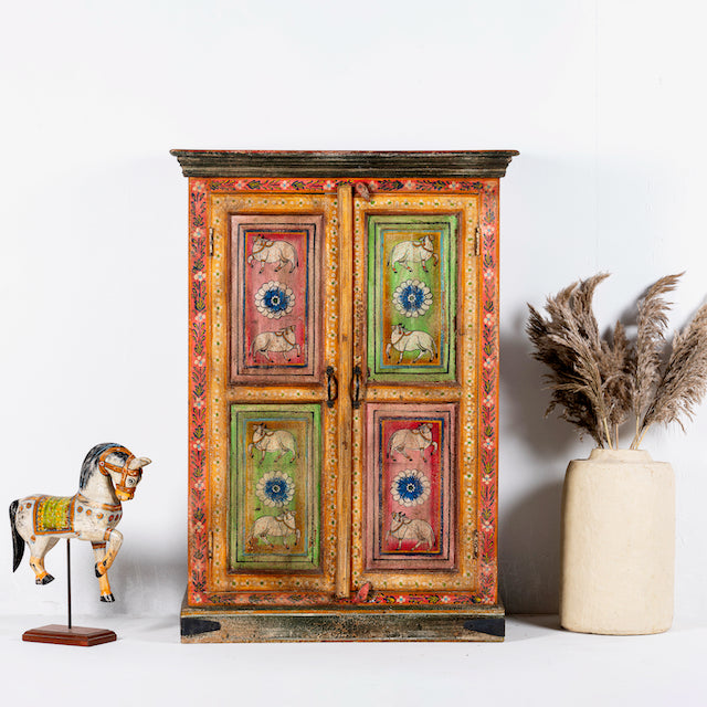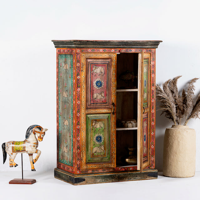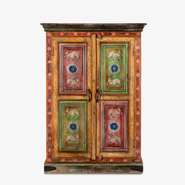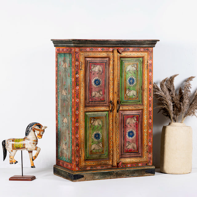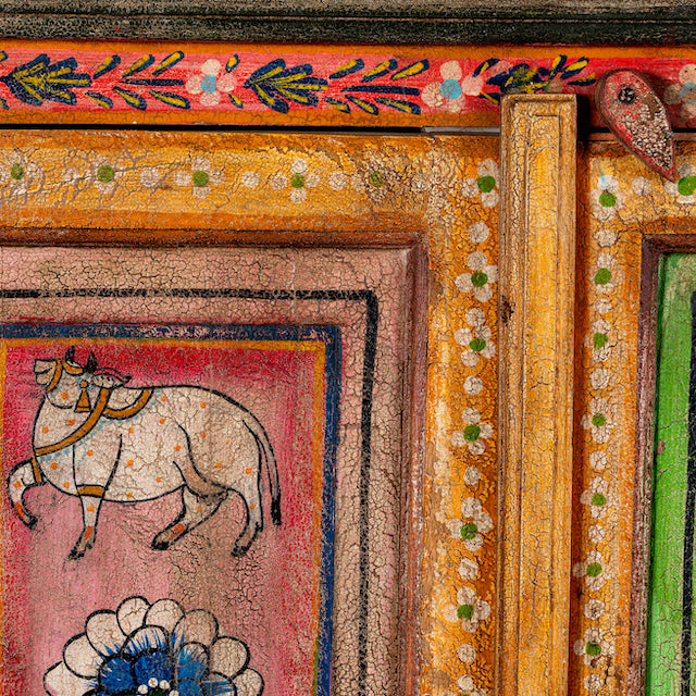 Leinenkasten Ghatal ist aus recyceltem Holz gefertigt und aufwendig mit indianischen Göttermotiven handbemalt.