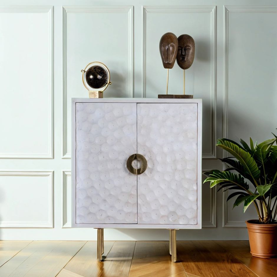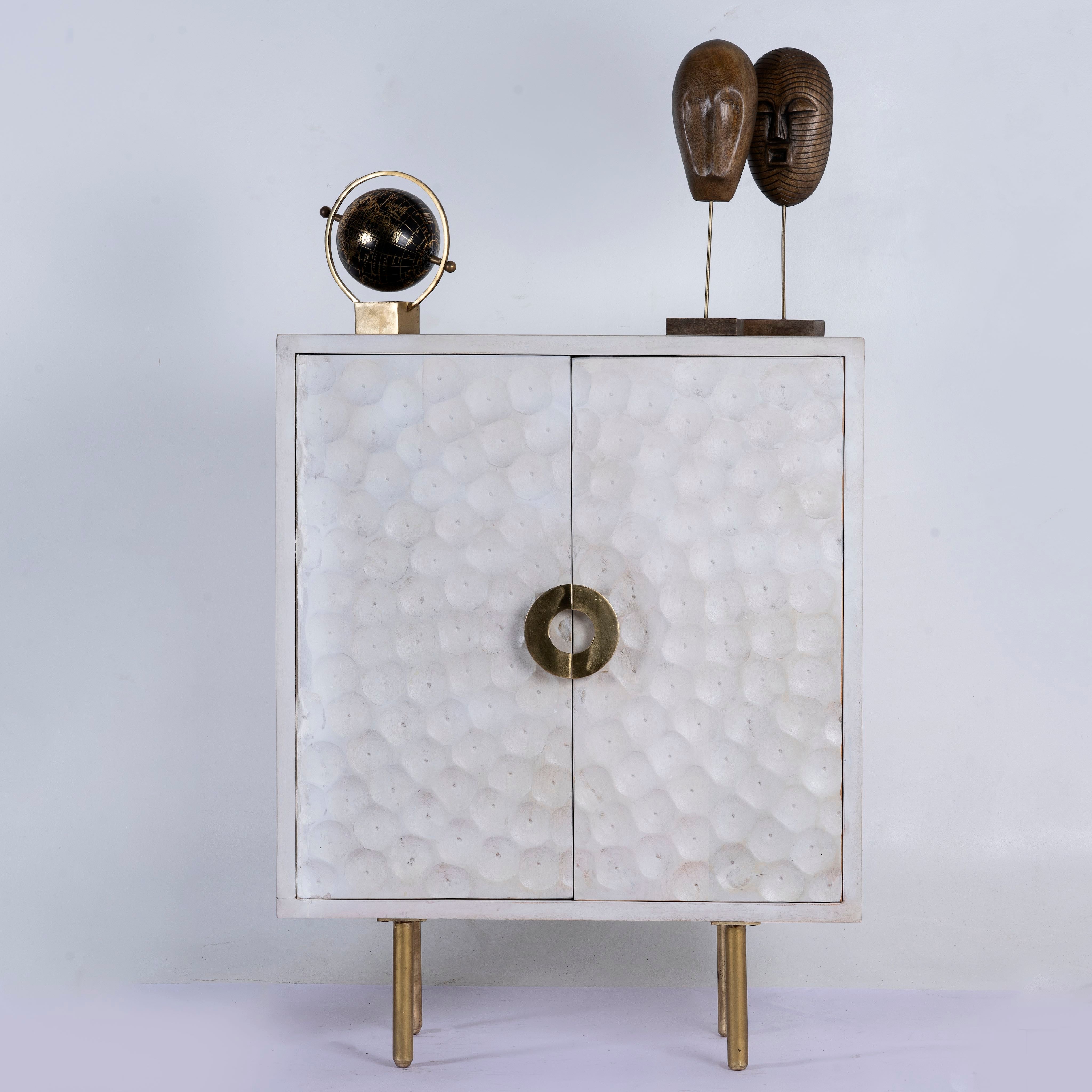 Dieser Schrank aus Mangoholz im weißen gehämmerten Design mit einem Ständer aus messingbeschichtetem Metall ist mehr als nur eine Aufbewahrungslösung; er ist ein Statement-Stück, das Ihrem Zuhause Eleganz, Funktionalität und einen Hauch von Luxus verleiht. Ob im Wohnzimmer, Essbereich oder Schlafzimmer, er ist garantiert eine bezaubernde Ergänzung Ihrer Einrichtung.
