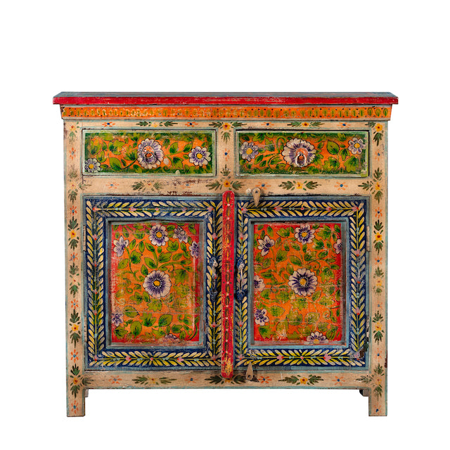 Wir stellen Ihnen unseren exquisit handbemalten Schrank Nahan aus recyceltem Holz vor. Die gesamte Oberfläche des Schranks ist mit aufwendigen Blumenmustern verziert, die sorgfältig von Hand aufgetragen wurden.