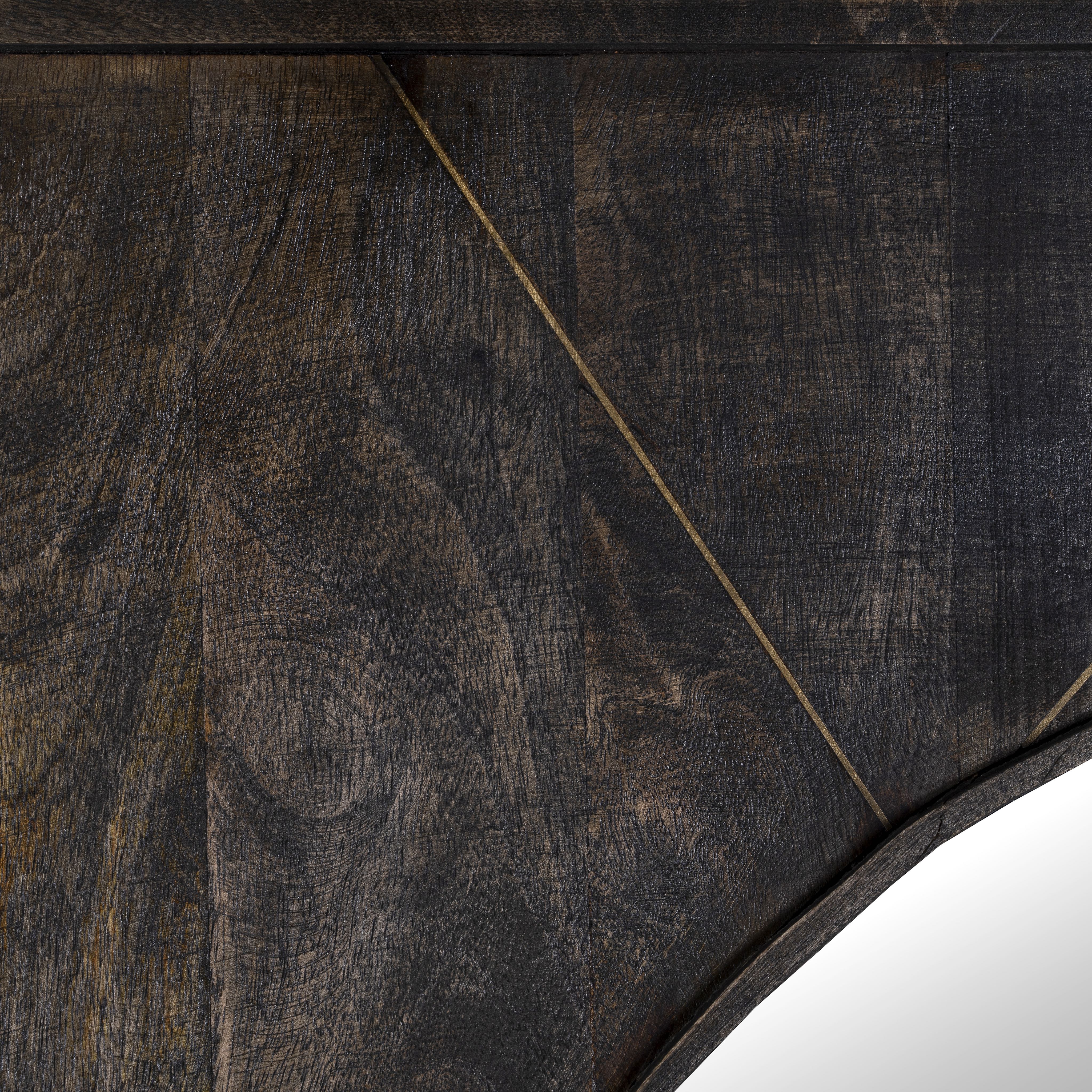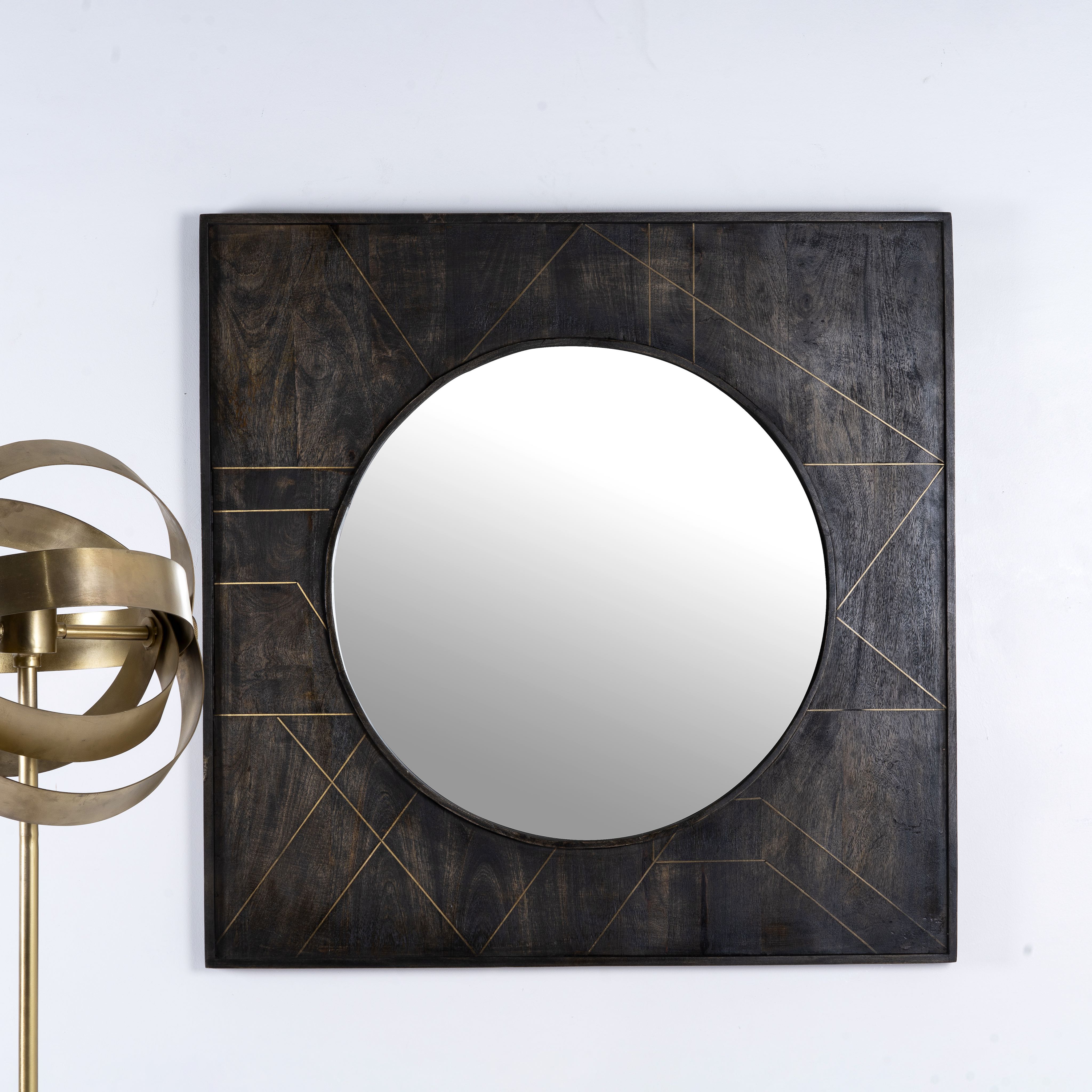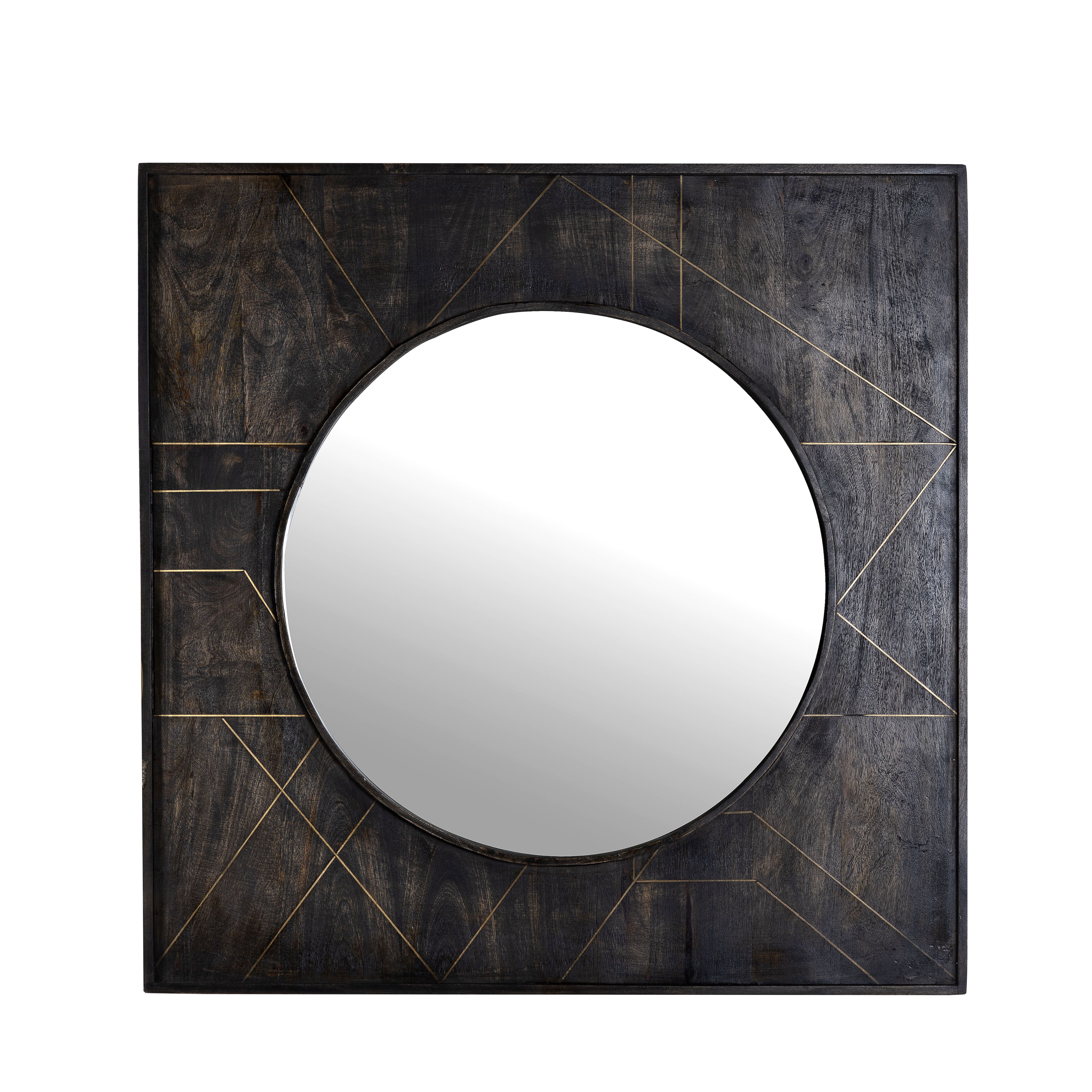 Dieser quadratische Holzspiegel mit Messingeinlagen setzt einen markanten Akzent in Ihrem Interieur. Handgefertigt aus natürlichem Mangoholz und schwarz lackiert, strahlt er Eleganz und Raffinesse aus.