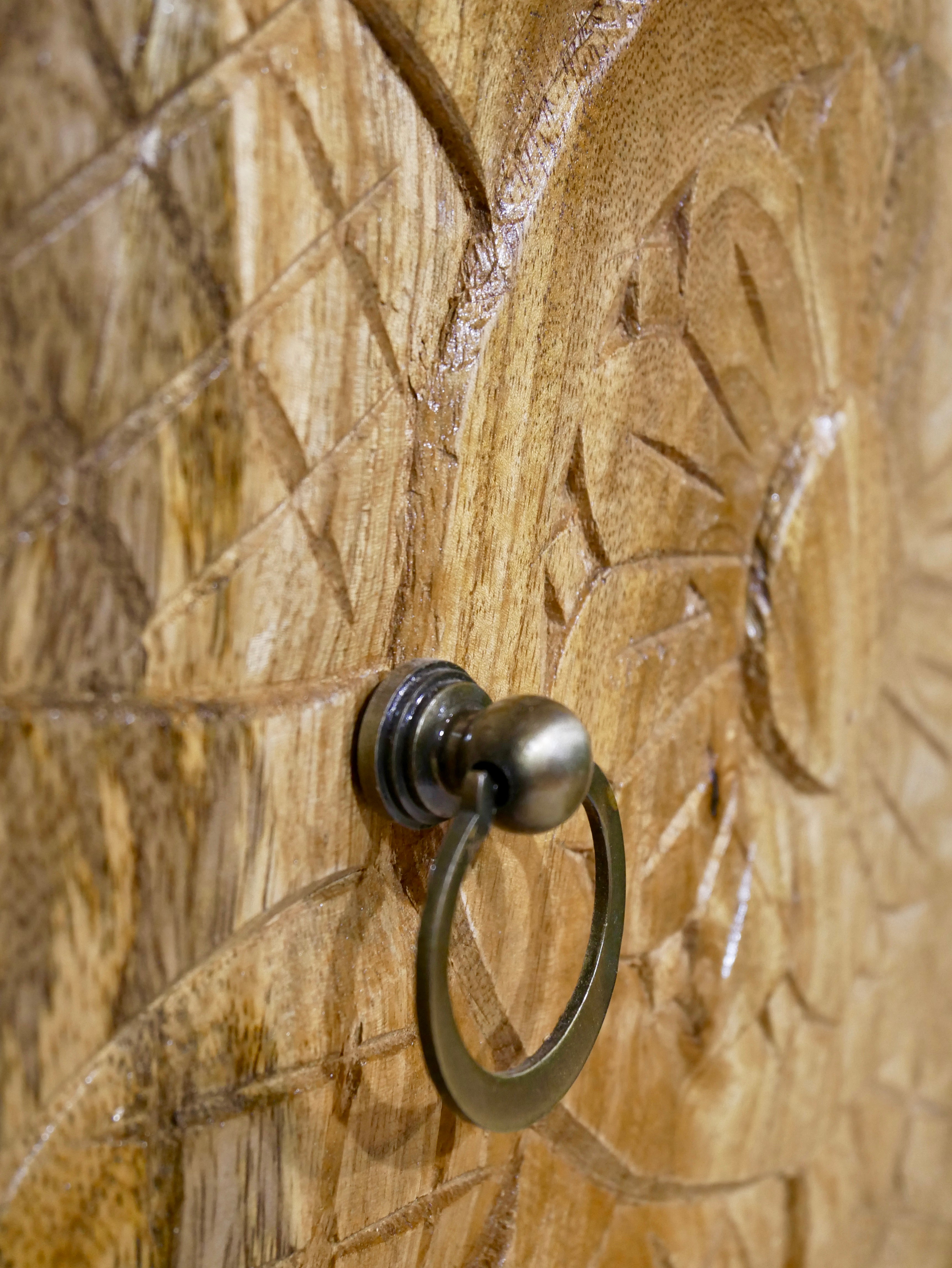 Unser Srinagar-Schrank im mediterranen Stil wird ein Blickfang in Ihrem Wohnzimmer, Schlafzimmer oder Badezimmer sein. Es bietet mit seinen 2 großen Fächern viel Stauraum. Die Türen sind reich mit floralen handgefertigten Schnitzereien verziert.