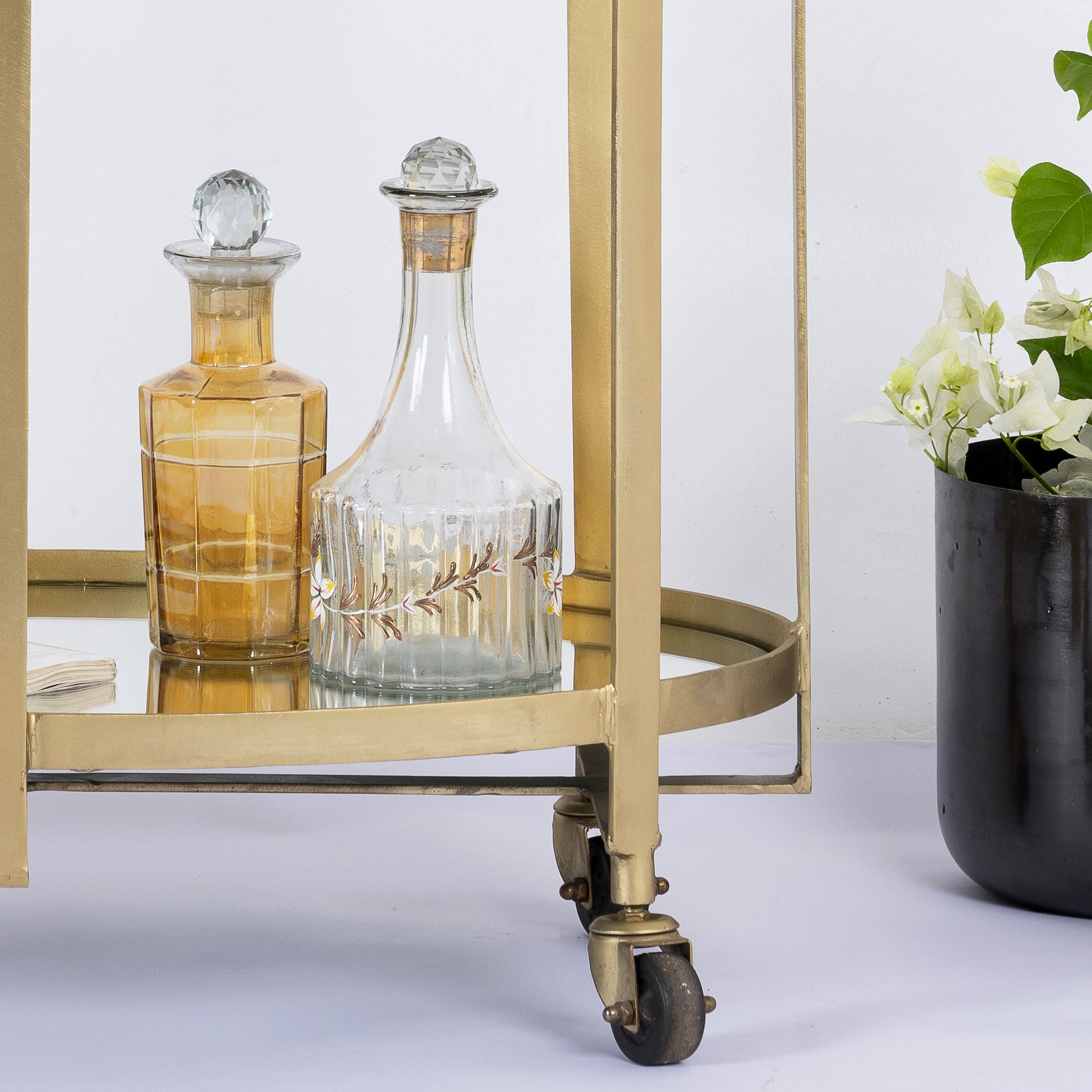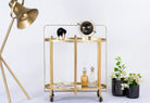 Der Eisenrahmen mit messingbeschichteter Oberfläche verleiht dem Wagen ein robustes und dennoch elegantes Aussehen. Er bildet die ideale Grundlage für die Glas- und Spiegelflächen, die dem Wagen sein edles Aussehen verleihen. Die Glasflächen sind nicht nur stilvoll, sondern auch praktisch, da sie leicht zu reinigen sind und gleichzeitig eine perfekte Präsentationsfläche für Ihre Getränke und Accessoires bieten.