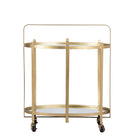 Entdecken Sie unseren einzigartigen ovalen Servierwagen Ameya mit messingbeschichtetem Eisen- und Glasrahmen und Spiegelflächen. Dieser elegante Barwagen vereint Funktionalität und Ästhetik perfekt und bereichert Ihren Raum.