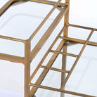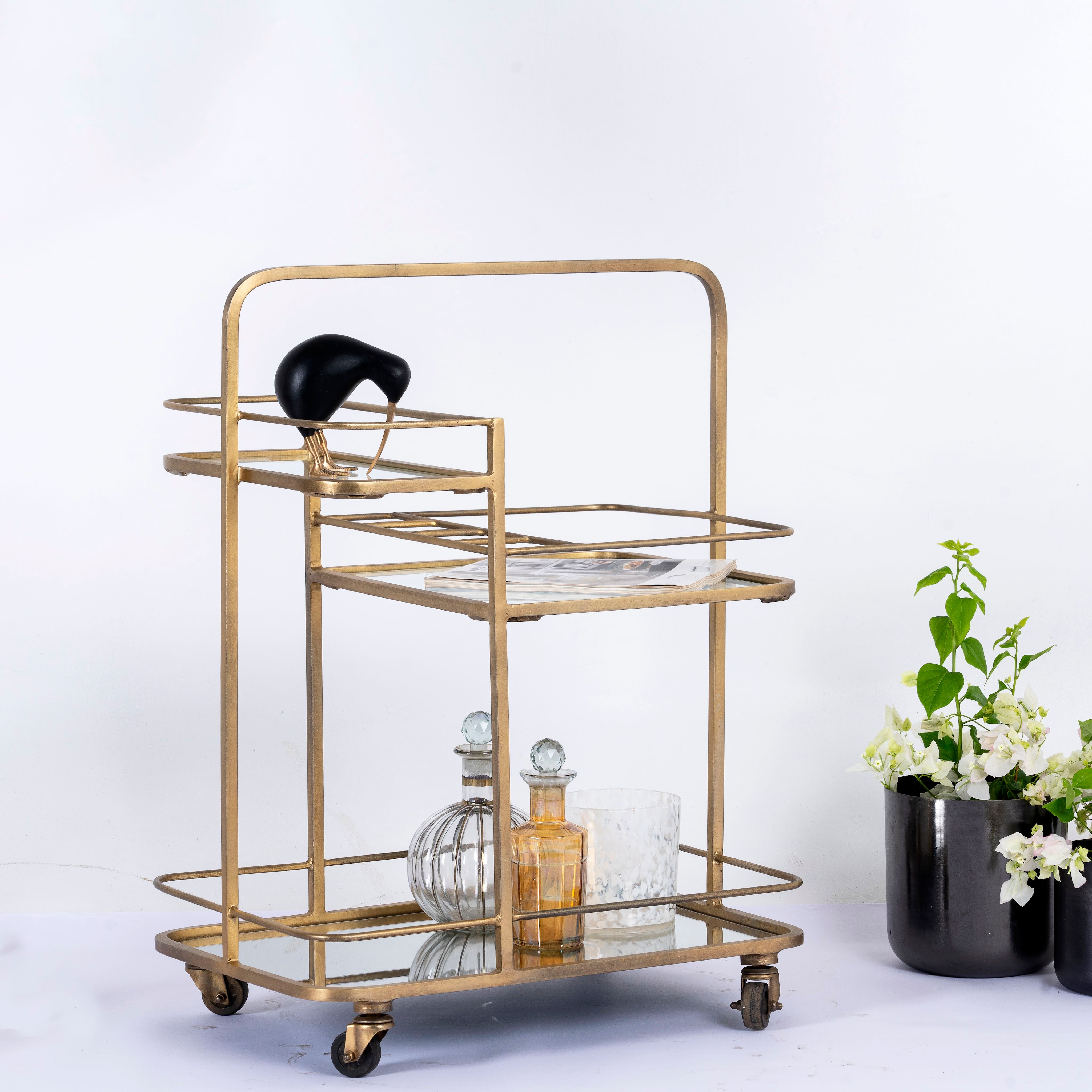 Entdecken Sie den einzigartigen Servierwagen Tarun mit einem Gestell aus messingbeschichtetem Eisen und Glas- und Spiegeloberflächen. Dieser elegante Barwagen vereint Funktionalität und Ästhetik perfekt und bereichert Ihren Raum.