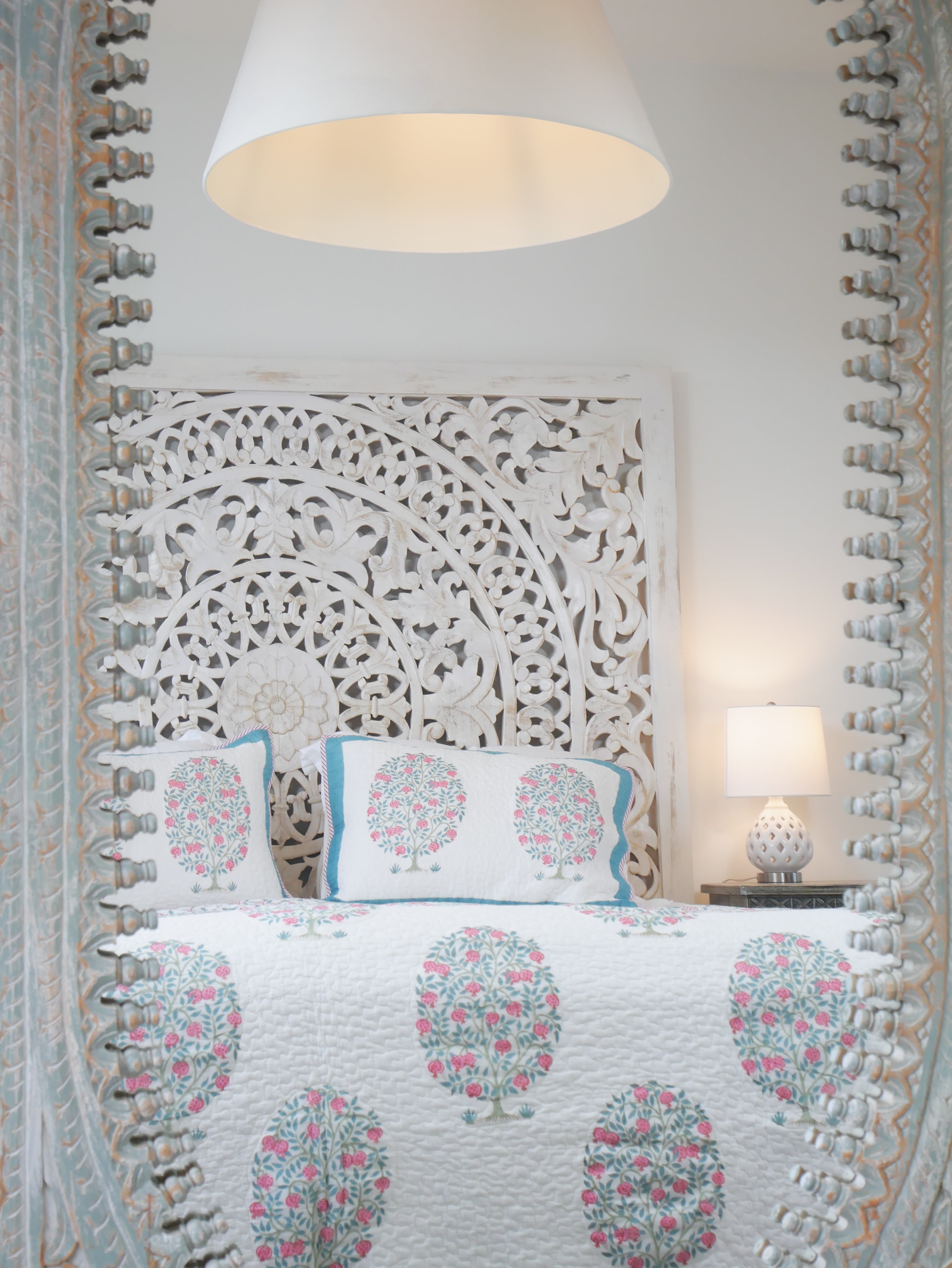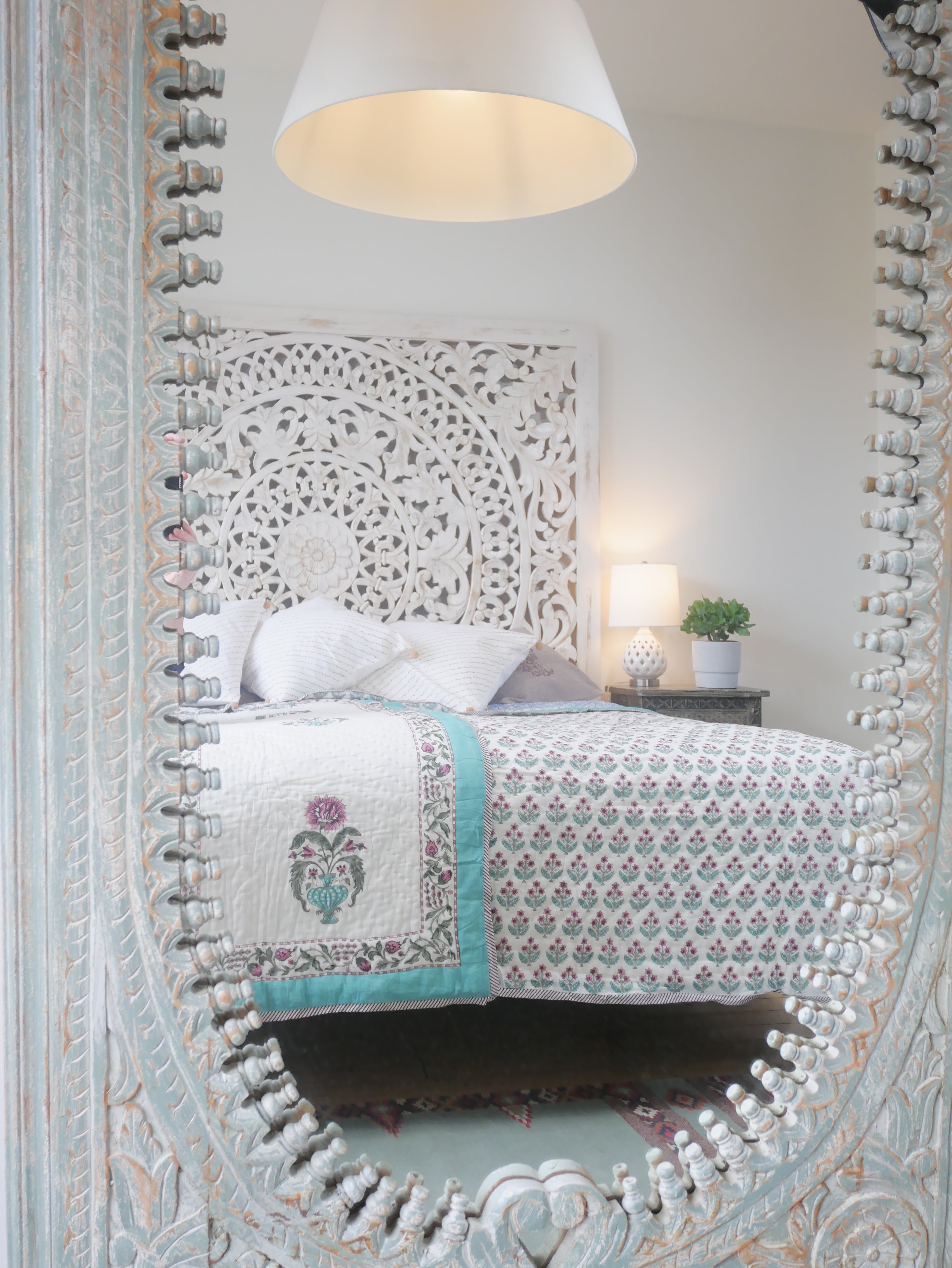 - Shabby ChicOrientalische Bettwäsche und indische Bettdecken passen hervorragend zu einem Schlafzimmer im Shabby-Chic-Stil. Die farbenfrohen Muster und kräftigen Farben harmonieren perfekt mit Möbeln, die Gebrauchsspuren aufweisen – typisch für diesen Einrichtungsstil. Die Textilien passen auch wunderbar zu einem weißen Kleiderschrank oder einer Kommode in Pastell-Türkis, Hellblau, Rosa oder Grün.