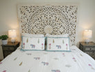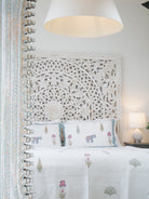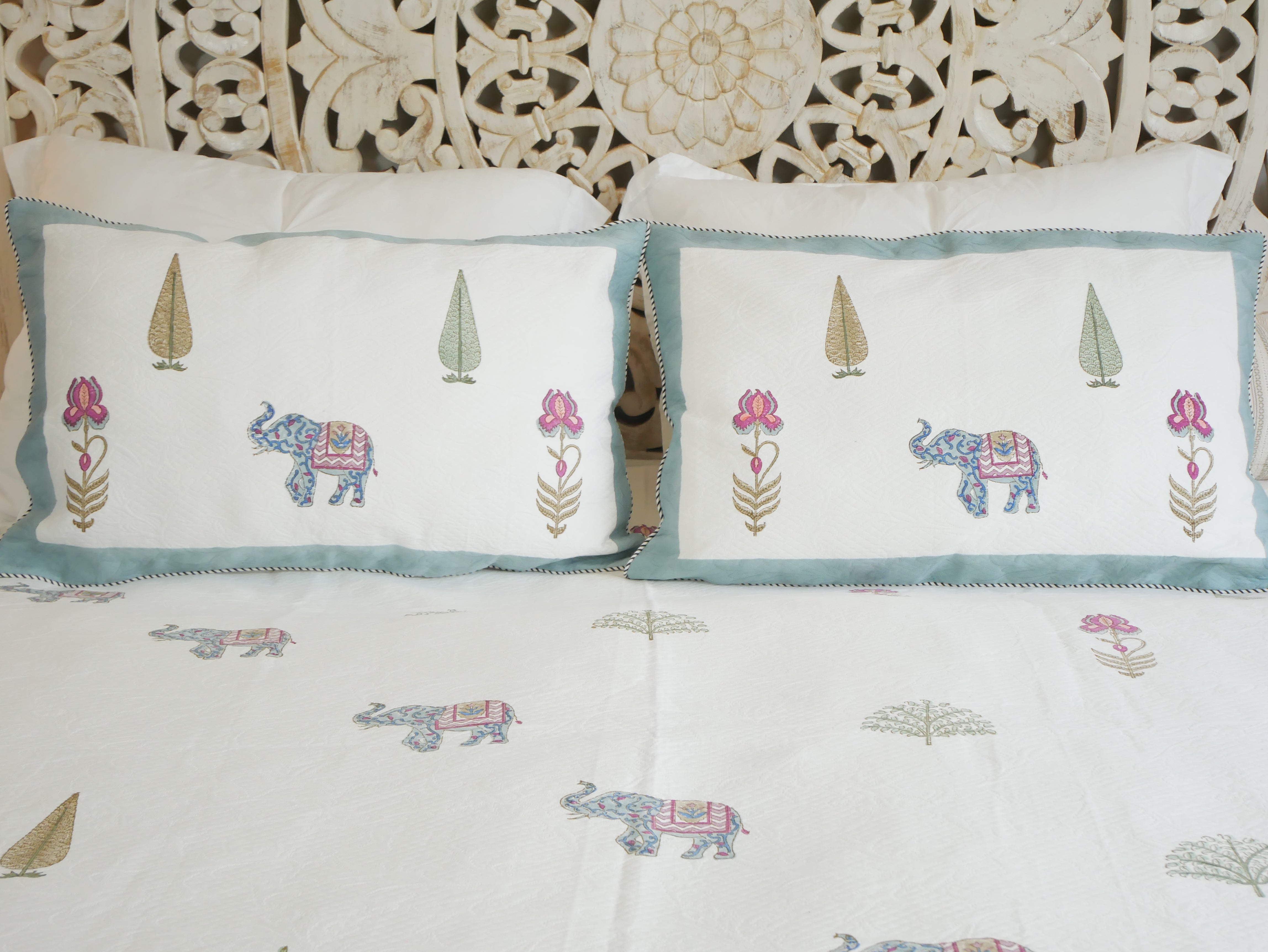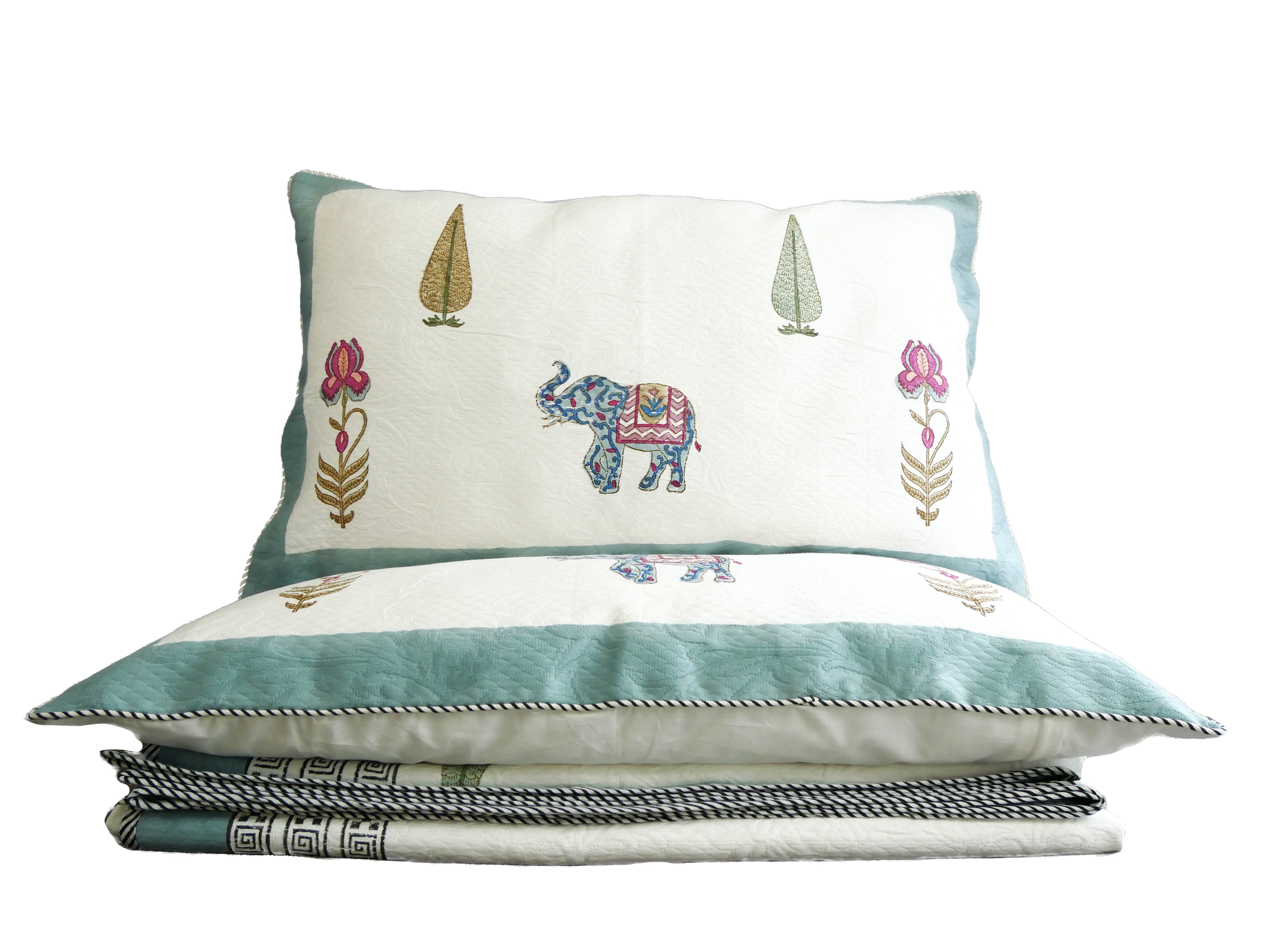 Dieses luxuriöse Bedcover Set, bestehend aus einer großen Bettdecke und 2 Kissenbezügen, ist aufwendig handgefertigt und das Design wurde mittels traditionellem Blockdruck aufgebracht.