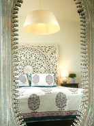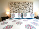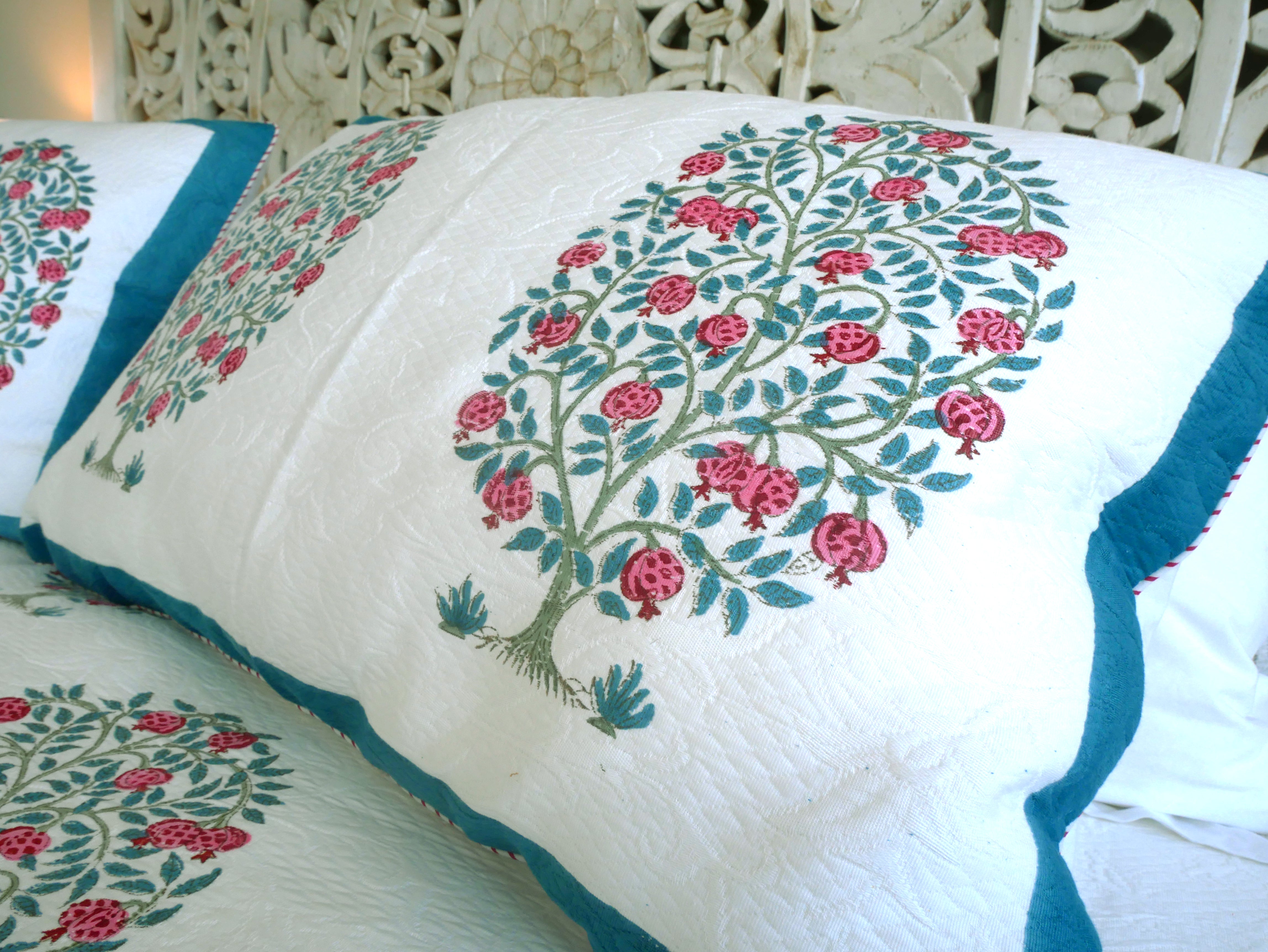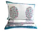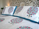 Dieses luxuriöse Bettwäscheset bestehend aus einer großen Bettdecke und 2 Kissenbezügen ist aufwendig handgefertigt und das Muster wurde mittels Blockdruck aufgebracht.