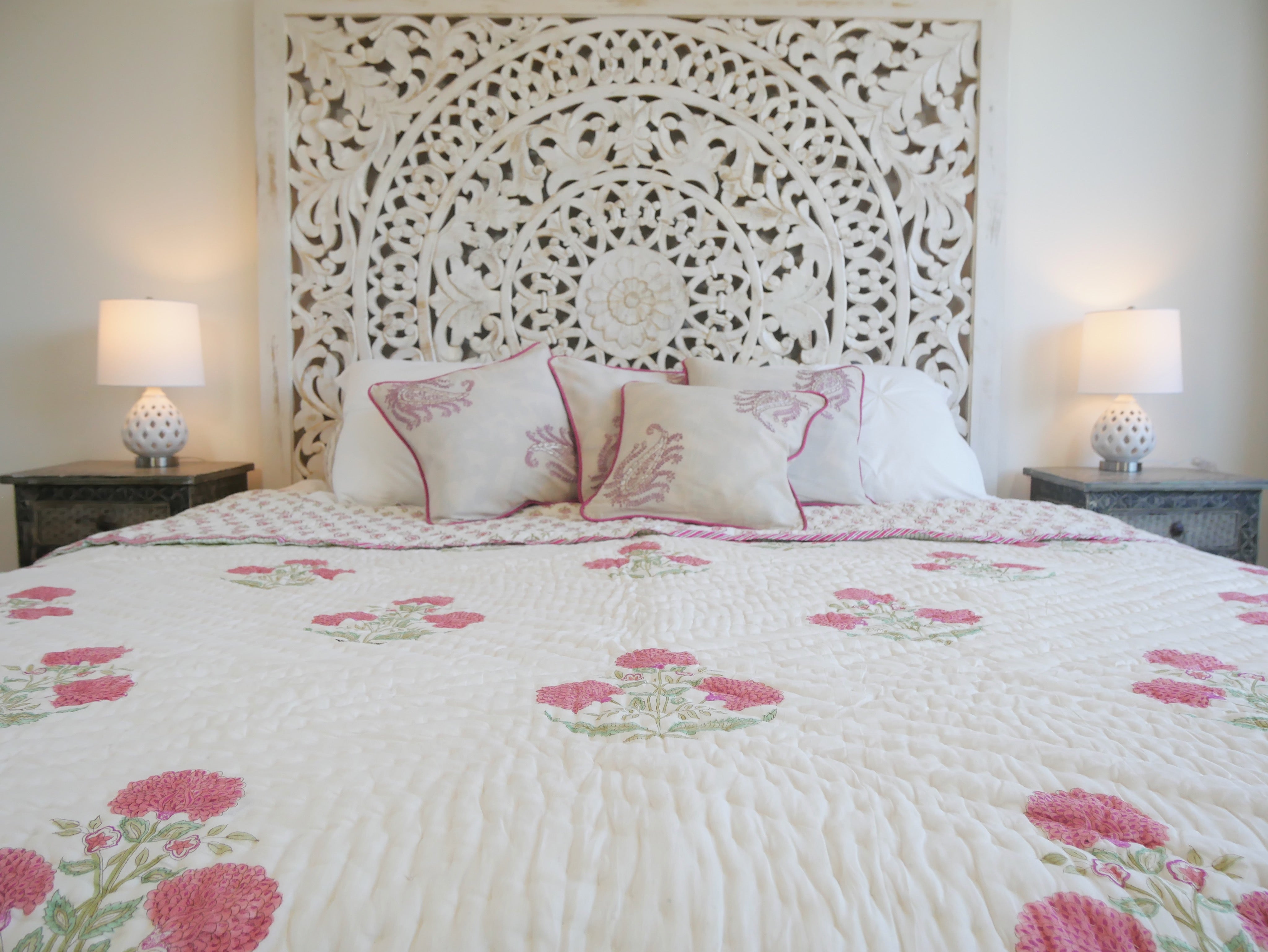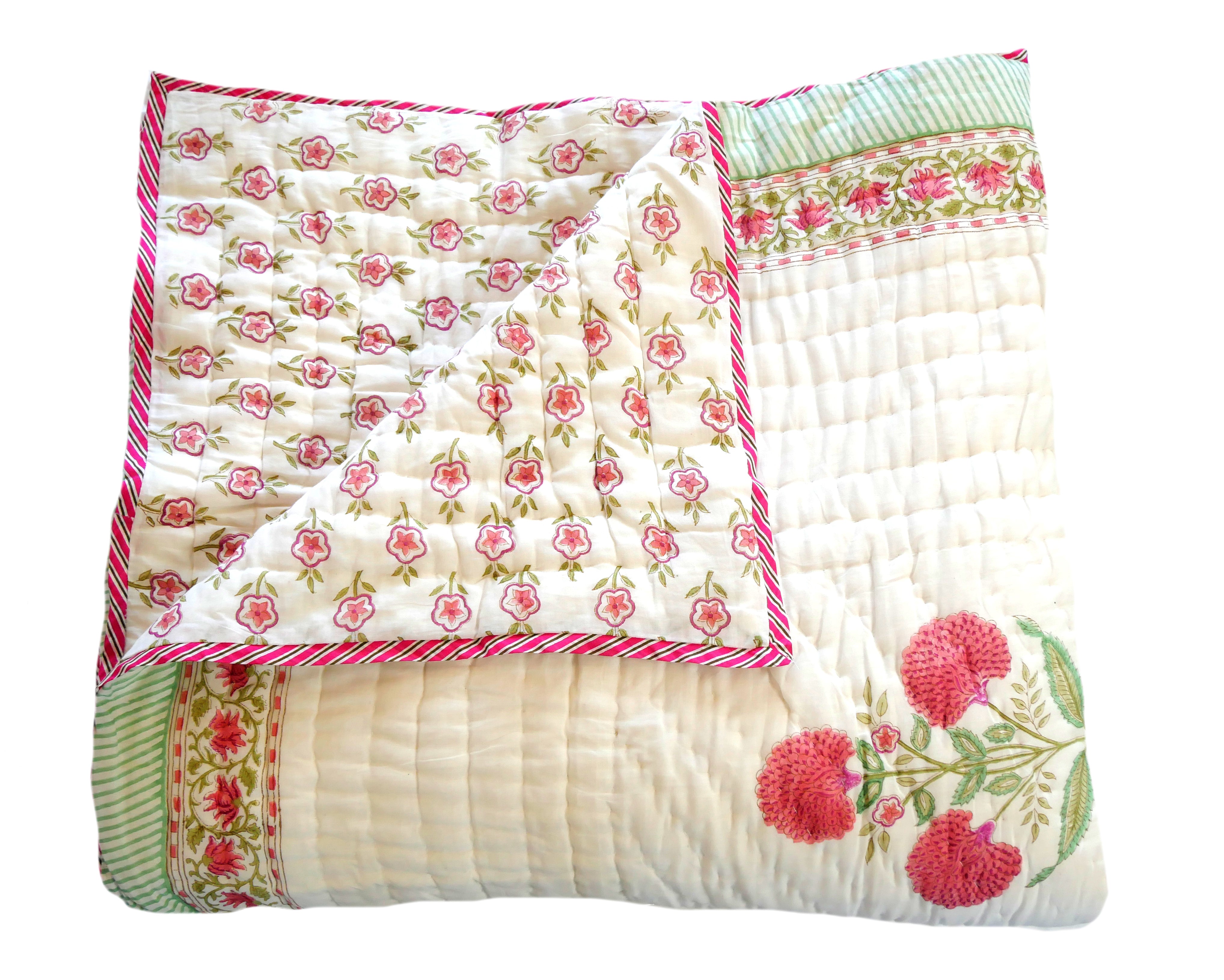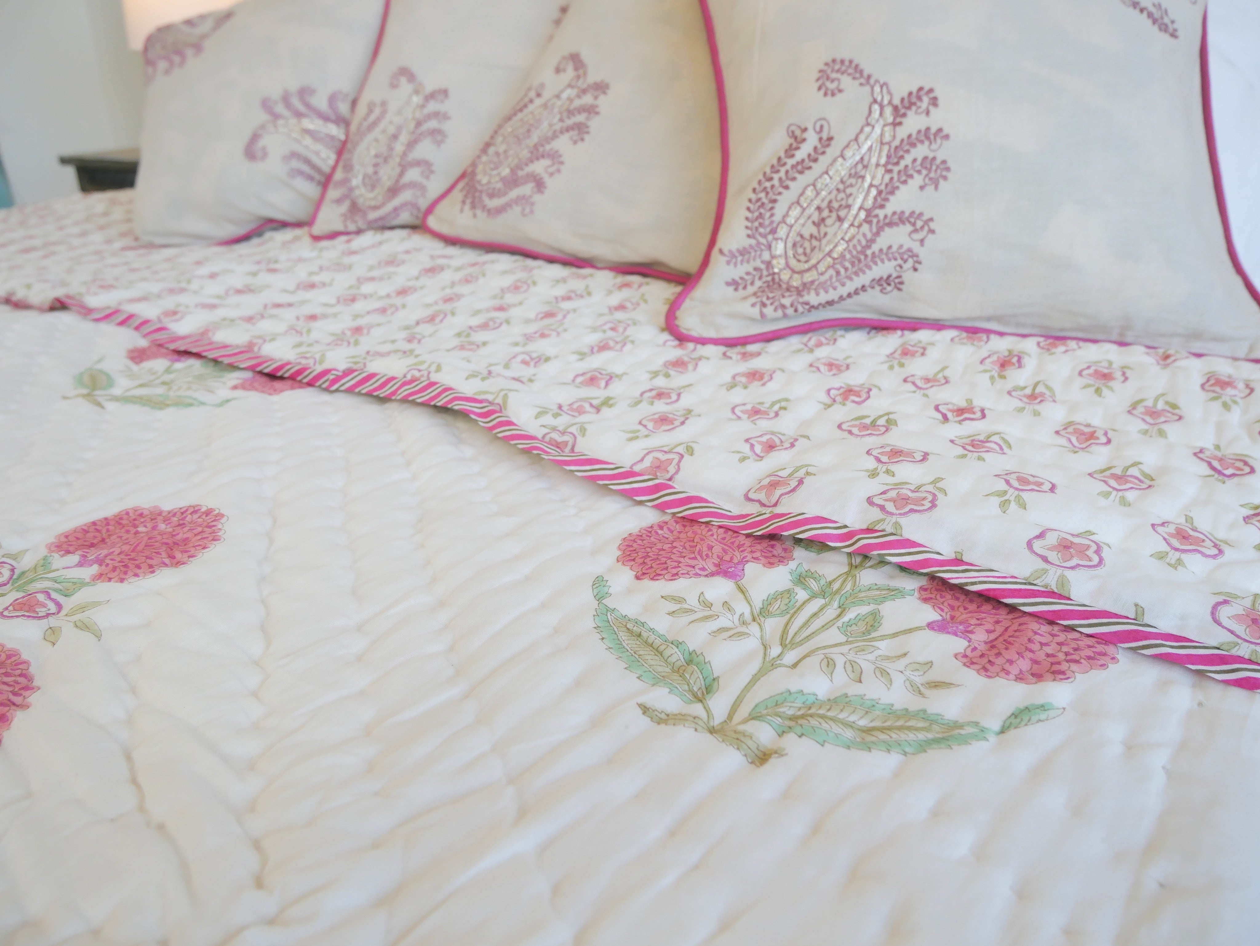 Der Quilt ist aufwendig von beiden Seiten mit unterschiedlichen Mustern in typischen Designs aus Rajasthan von Hand bedruckt und kann daher, wie auf unseren Fotos zu sehen, gewendet werden.