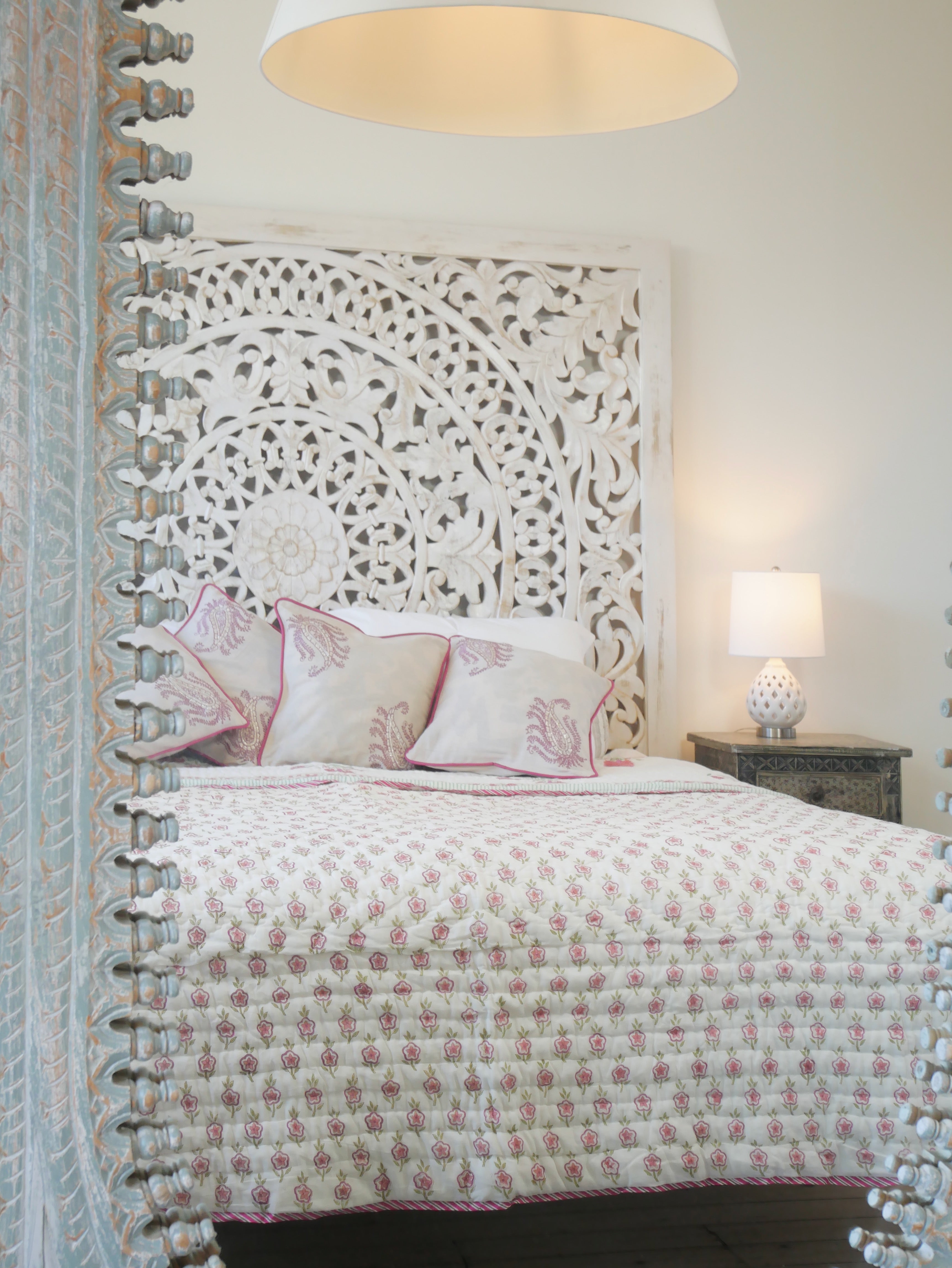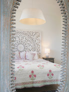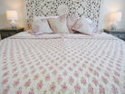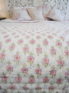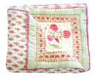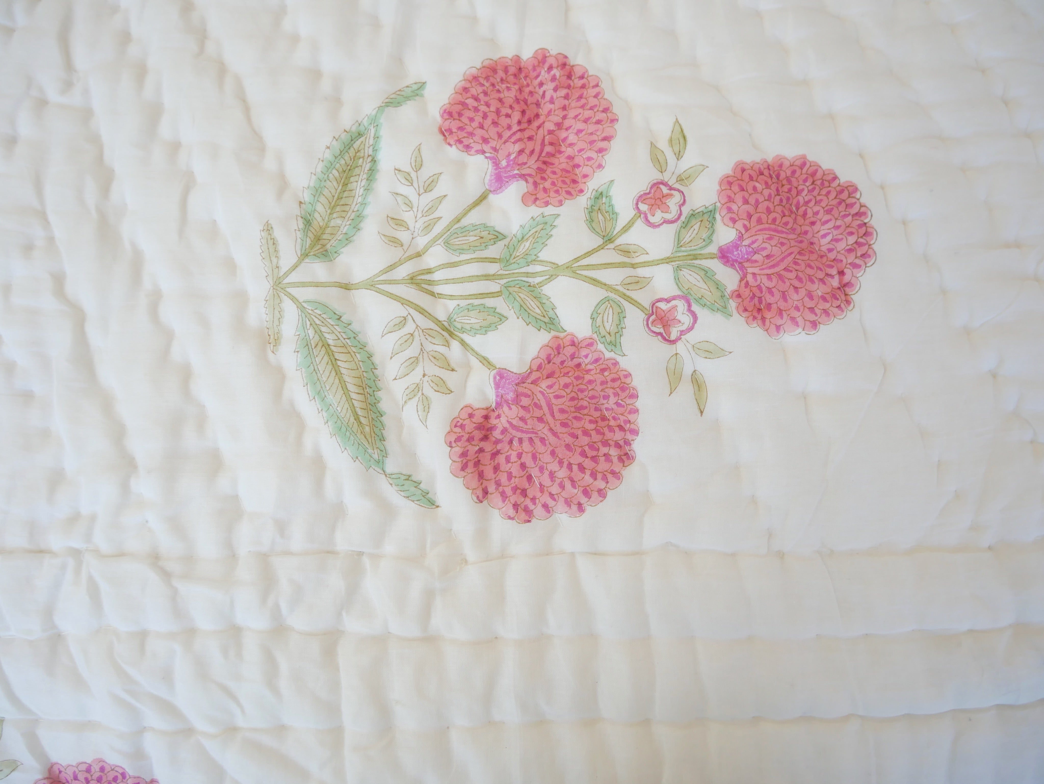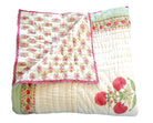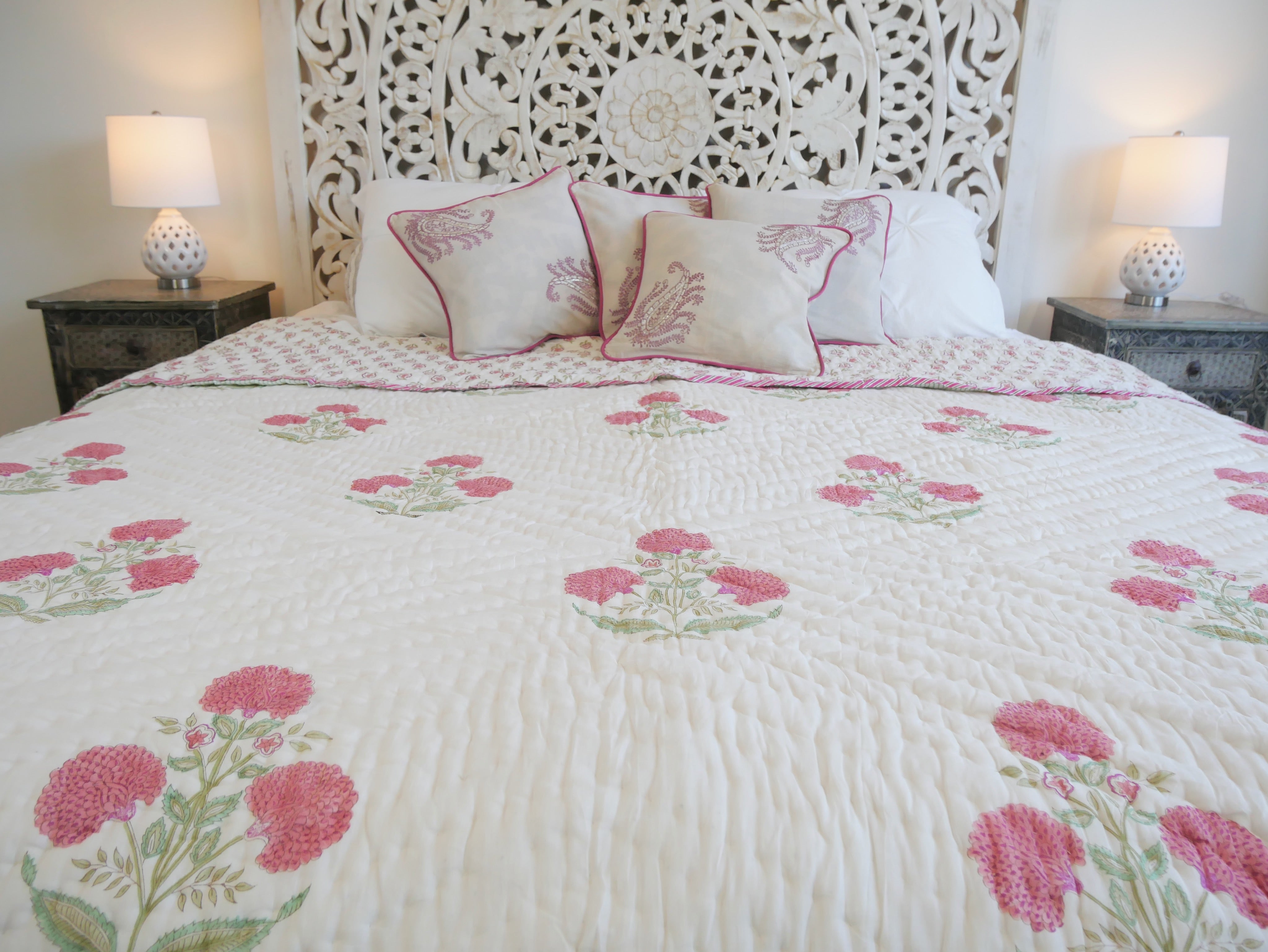 Der Quilt ist aufwendig von beiden Seiten mit unterschiedlichen Mustern in typischen Designs aus Rajasthan von Hand bedruckt und kann daher, wie auf unseren Fotos zu sehen, gewendet werden.