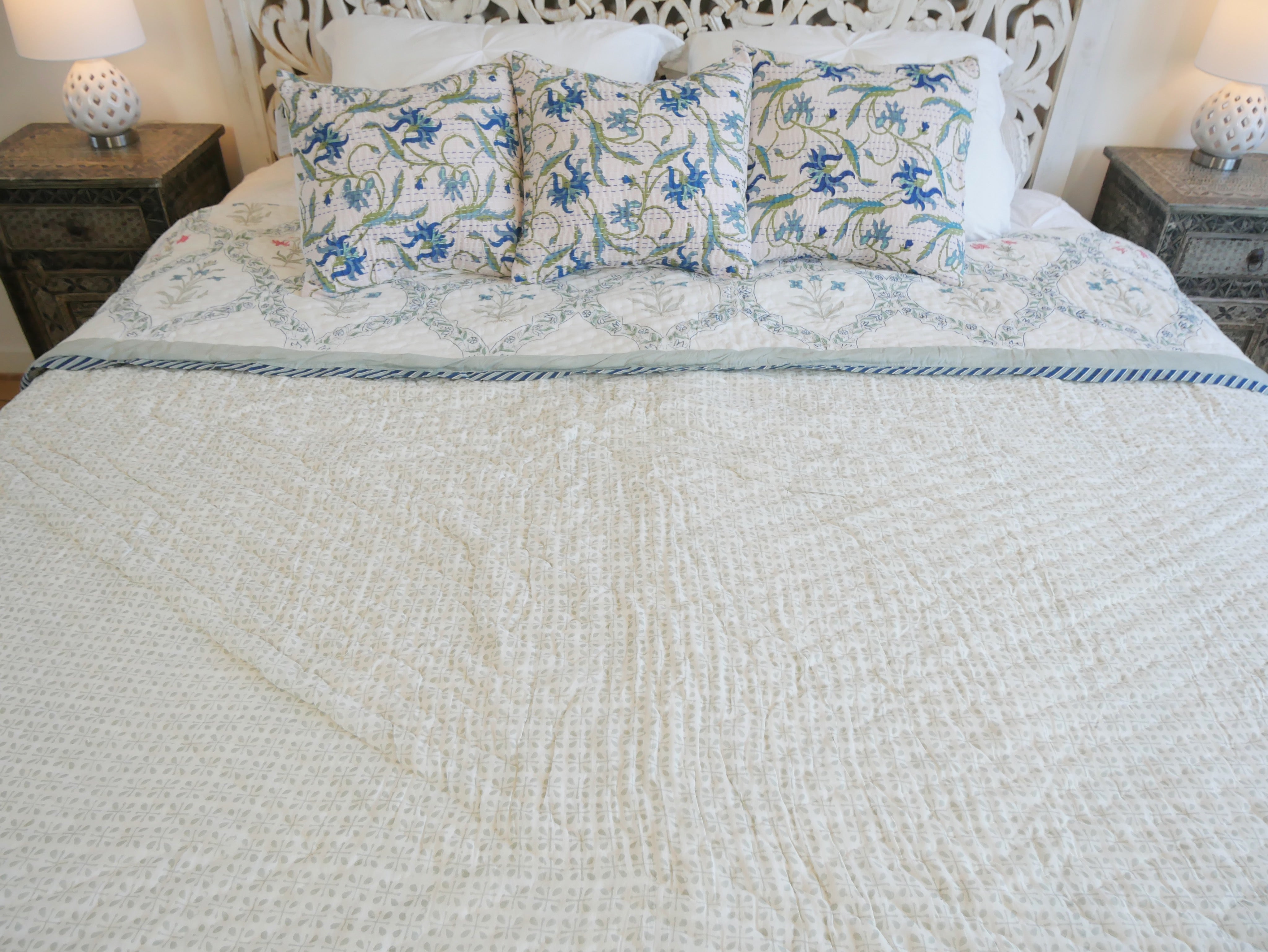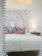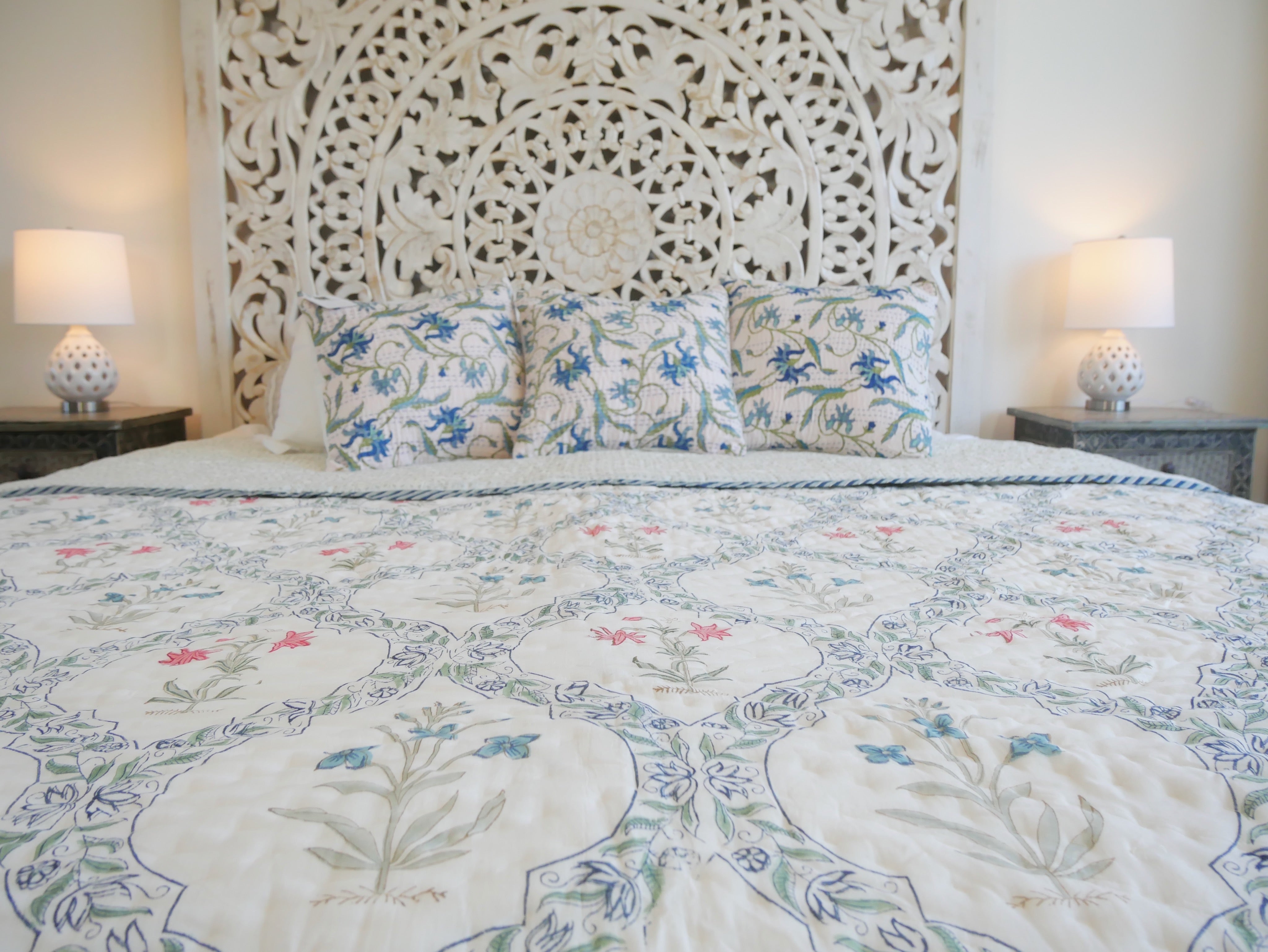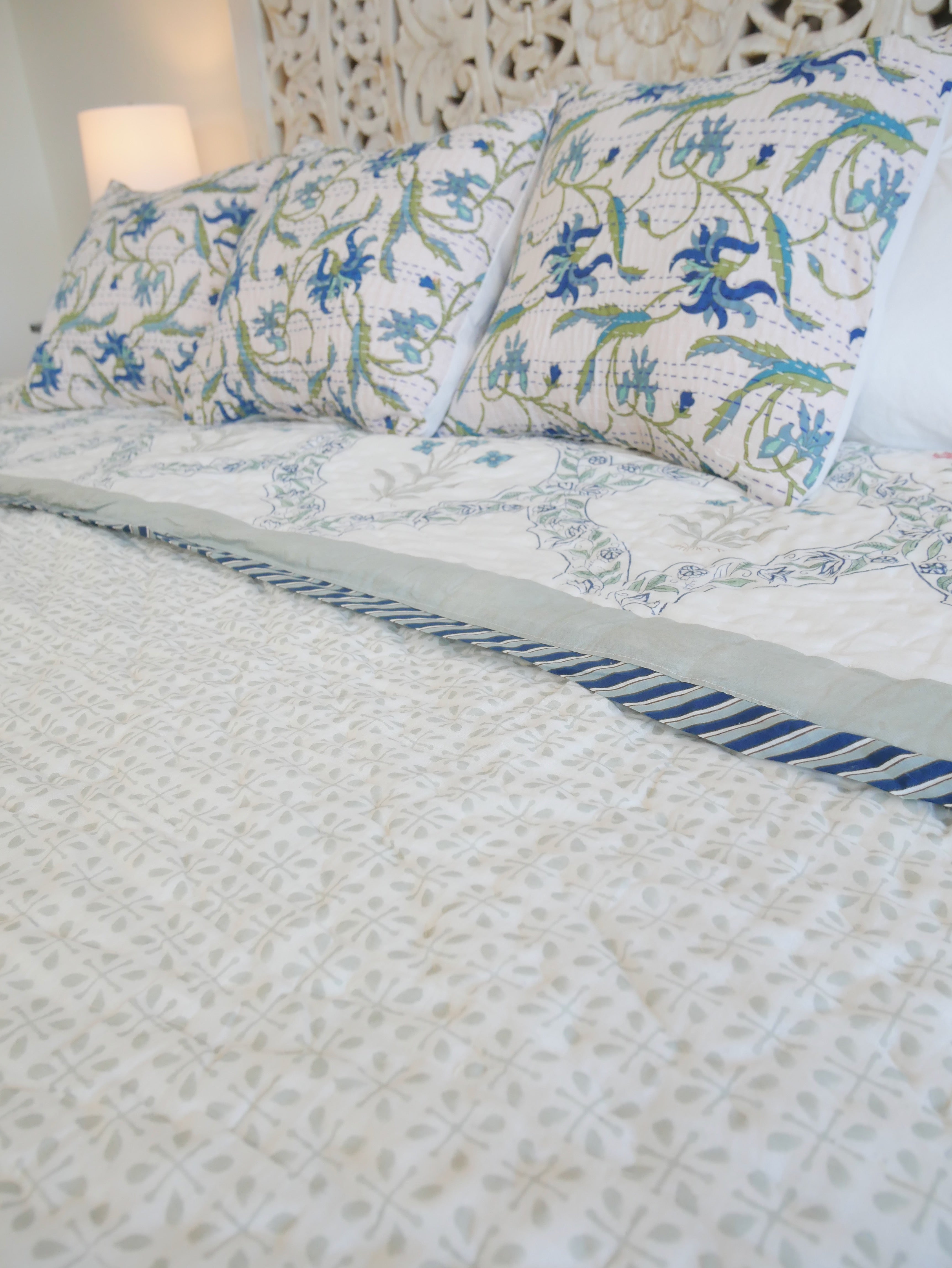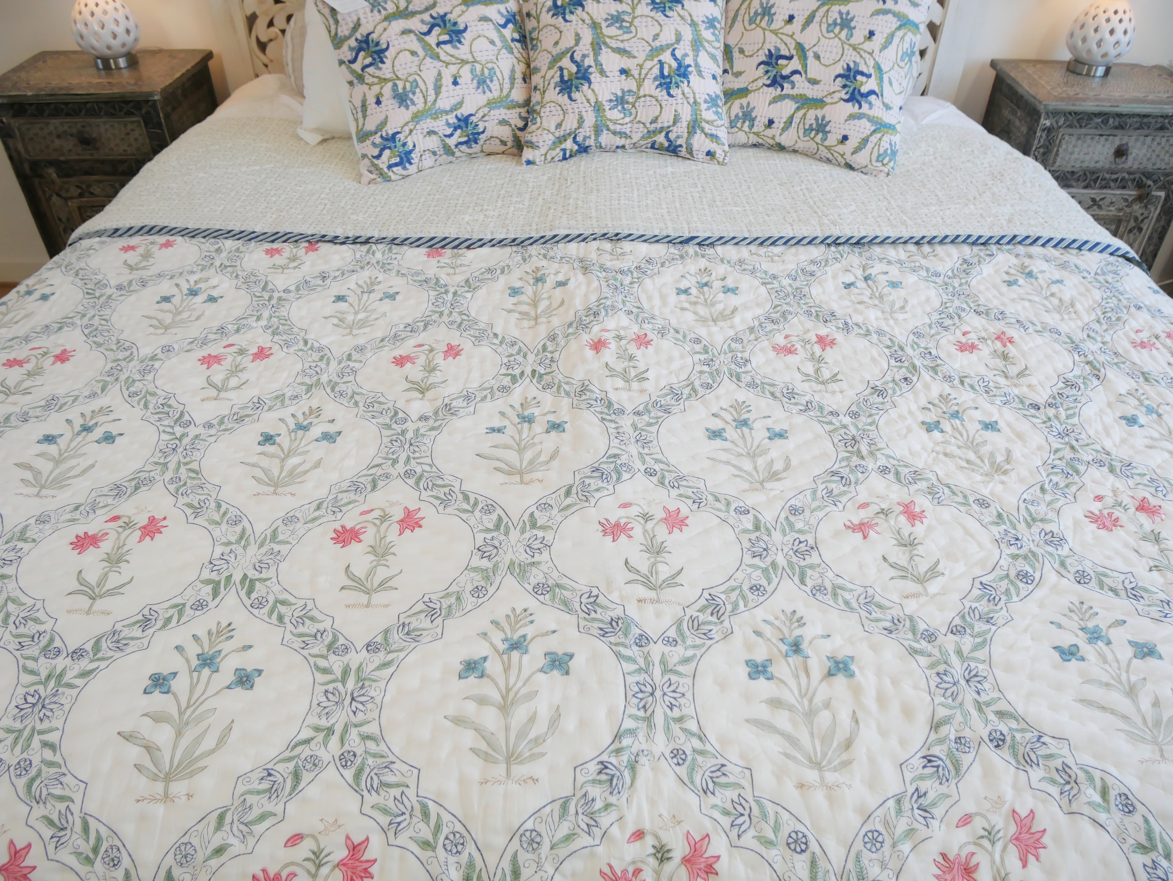 Der Quilt ist aufwendig von beiden Seiten mit verschiedenen Mustern in typischen Designs aus Rajasthan von Hand bedruckt und kann daher wie auf unseren Fotos gezeigt gedreht werden.