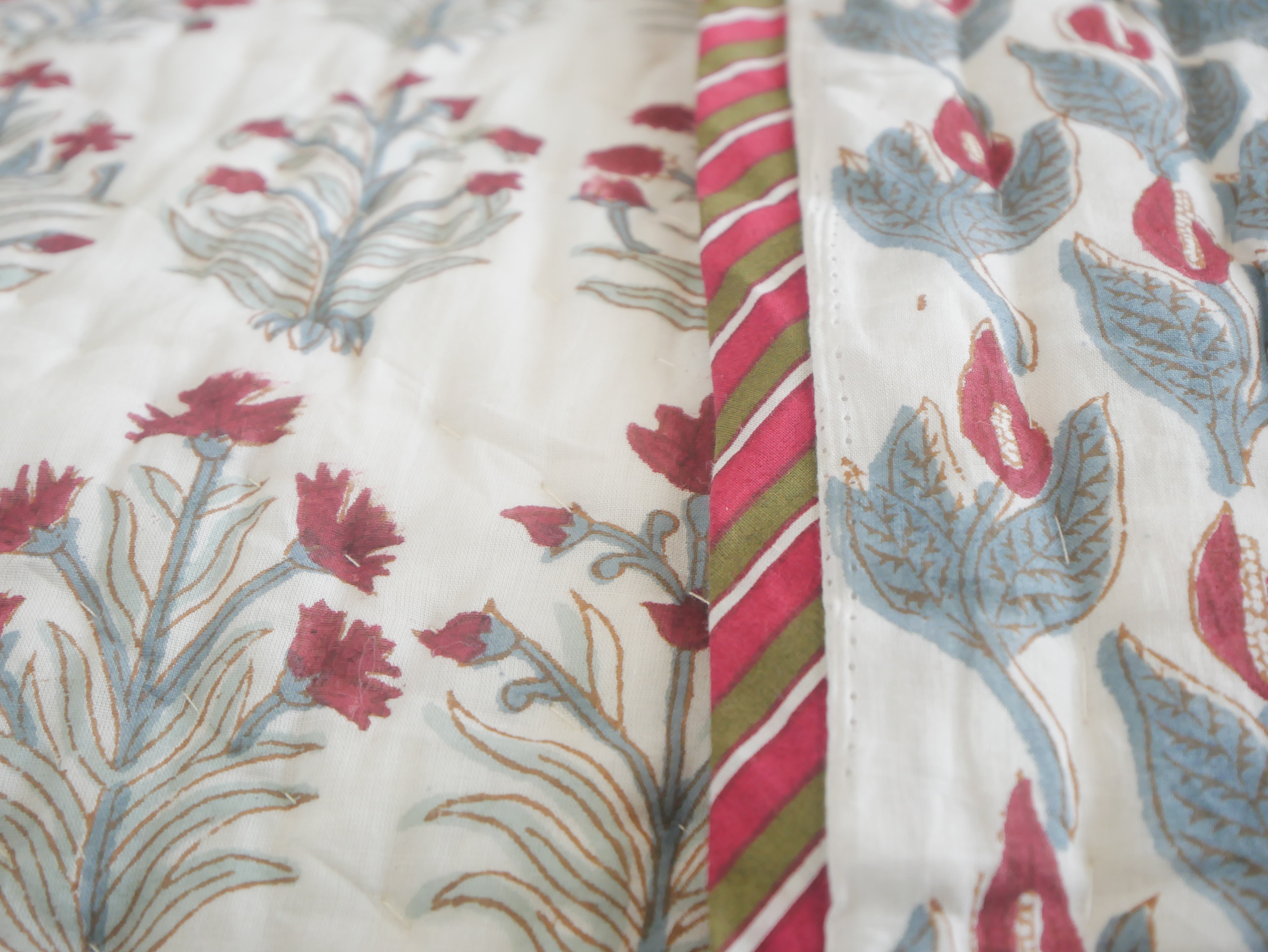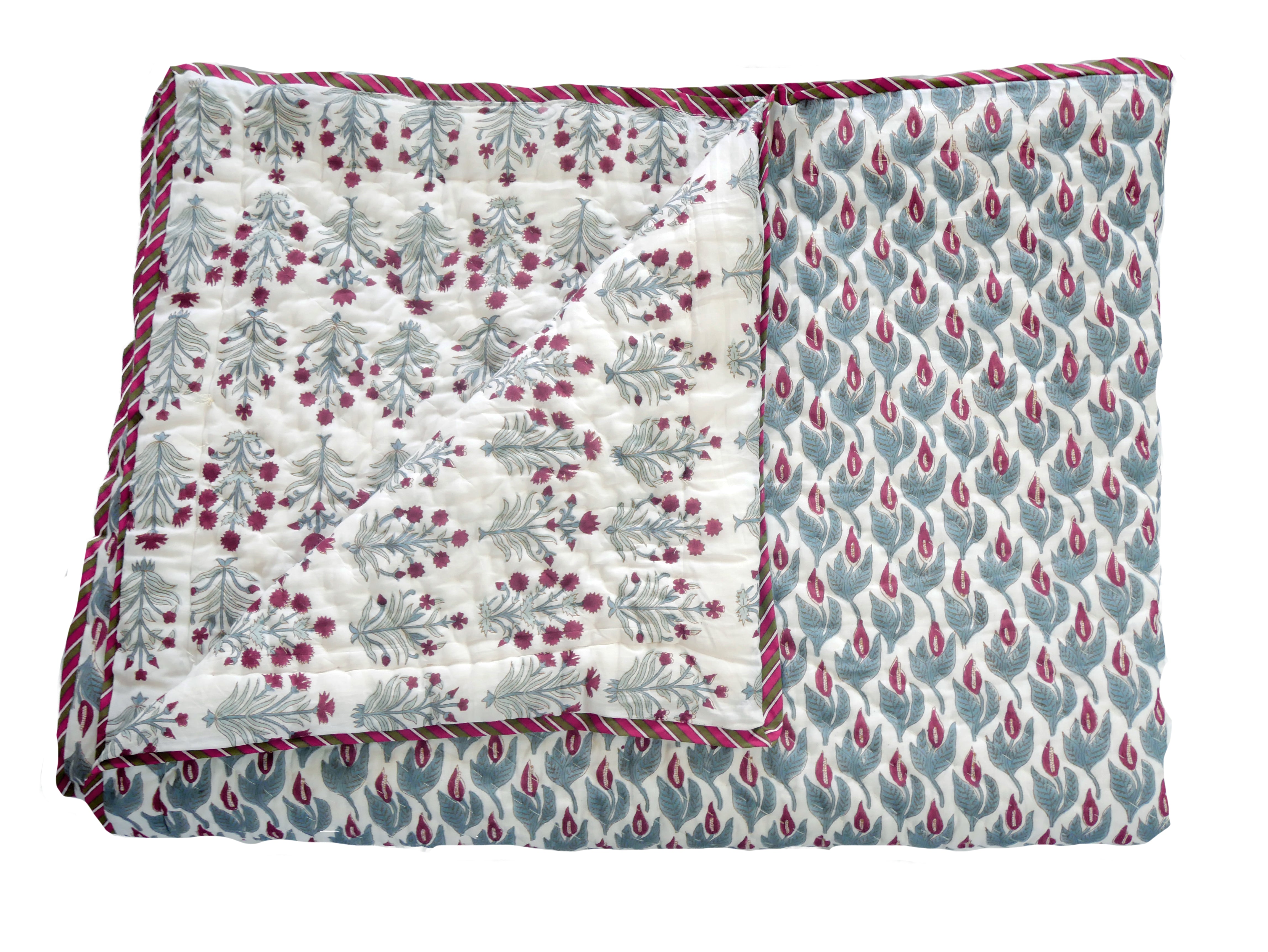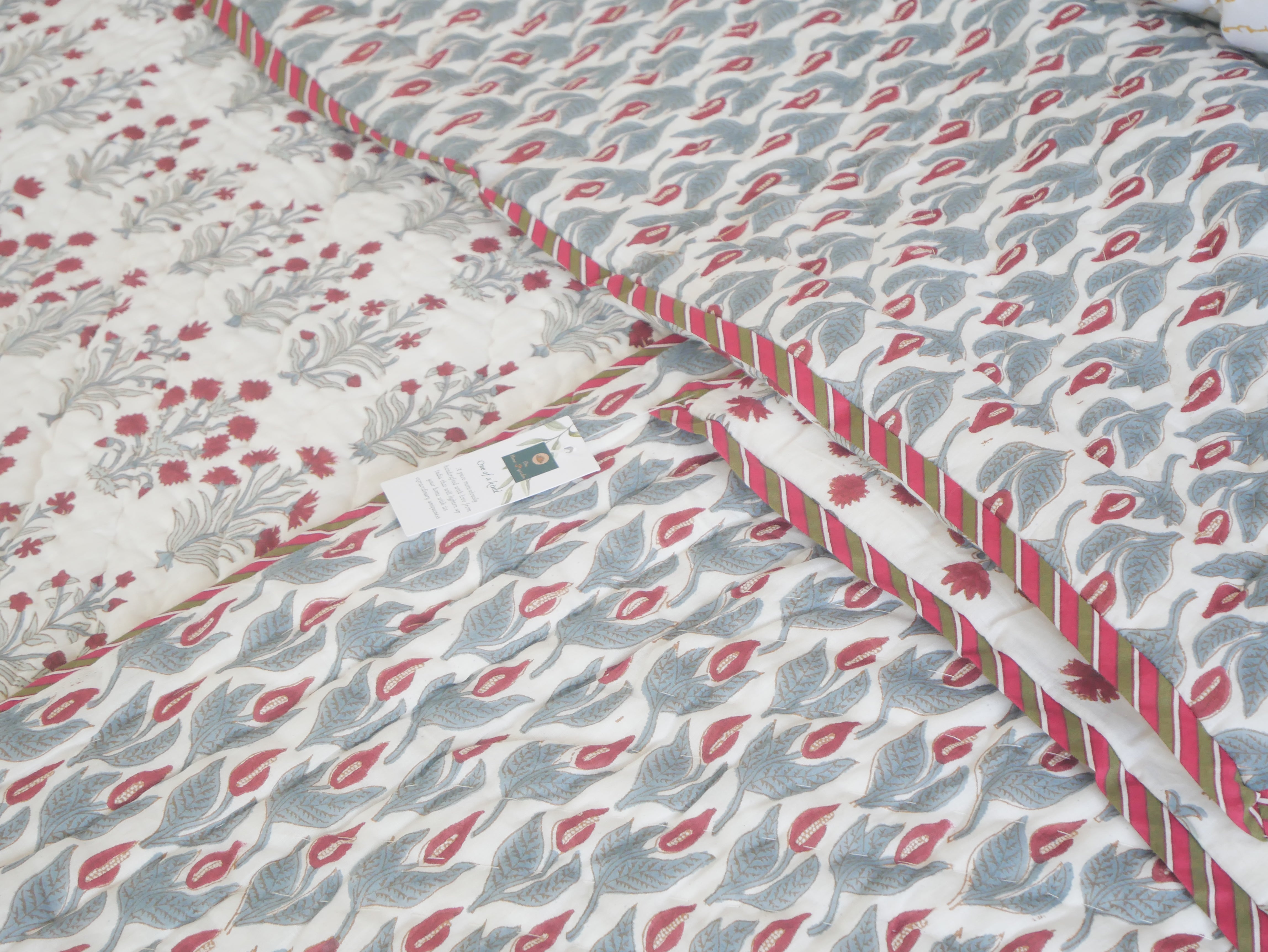 Diese wunderschöne Bettdecke besteht aus hochwertiger, ungebleichter Baumwolle, ist handgenäht und mit aufwendigen Blockdrucken versehen.