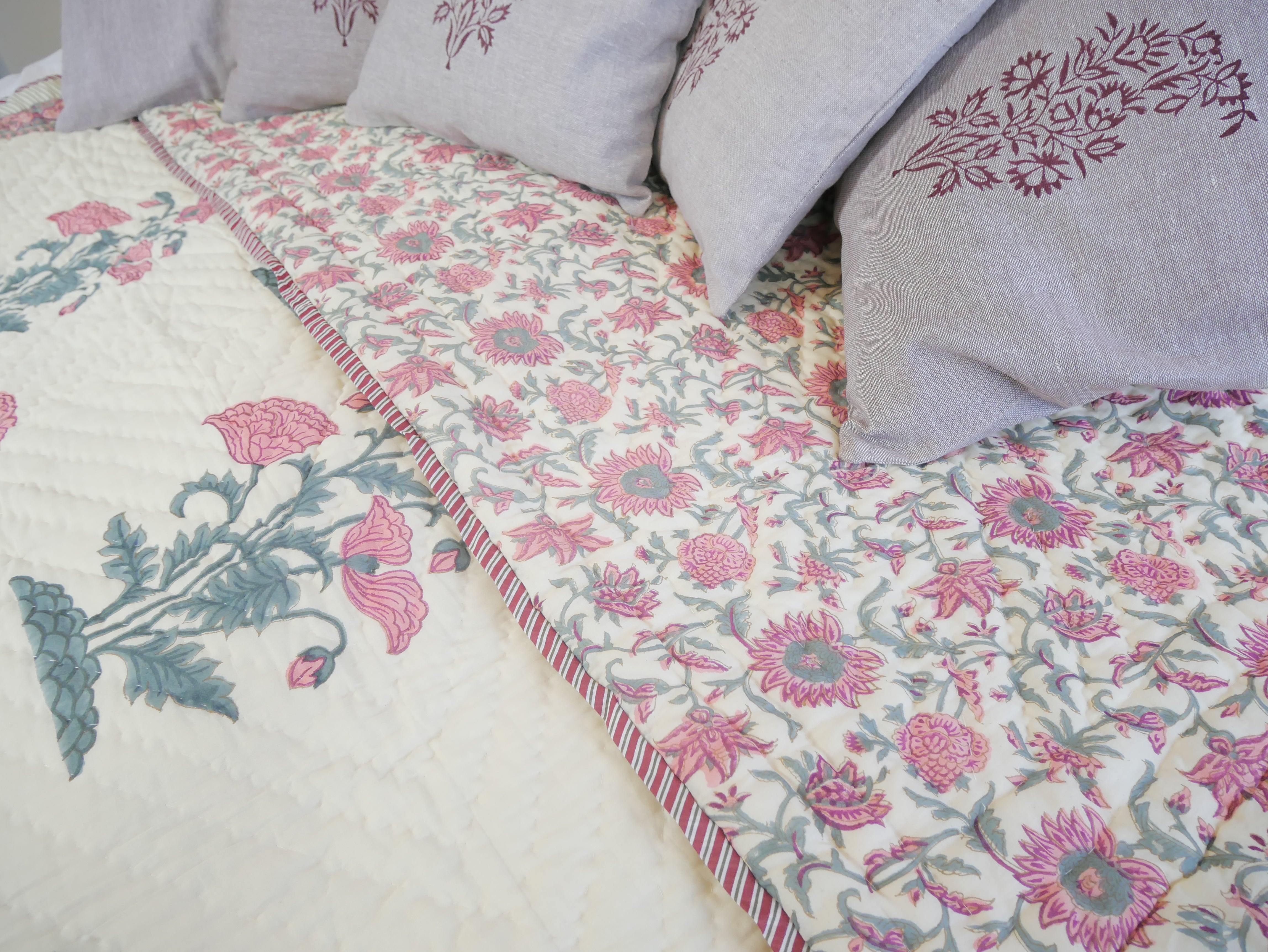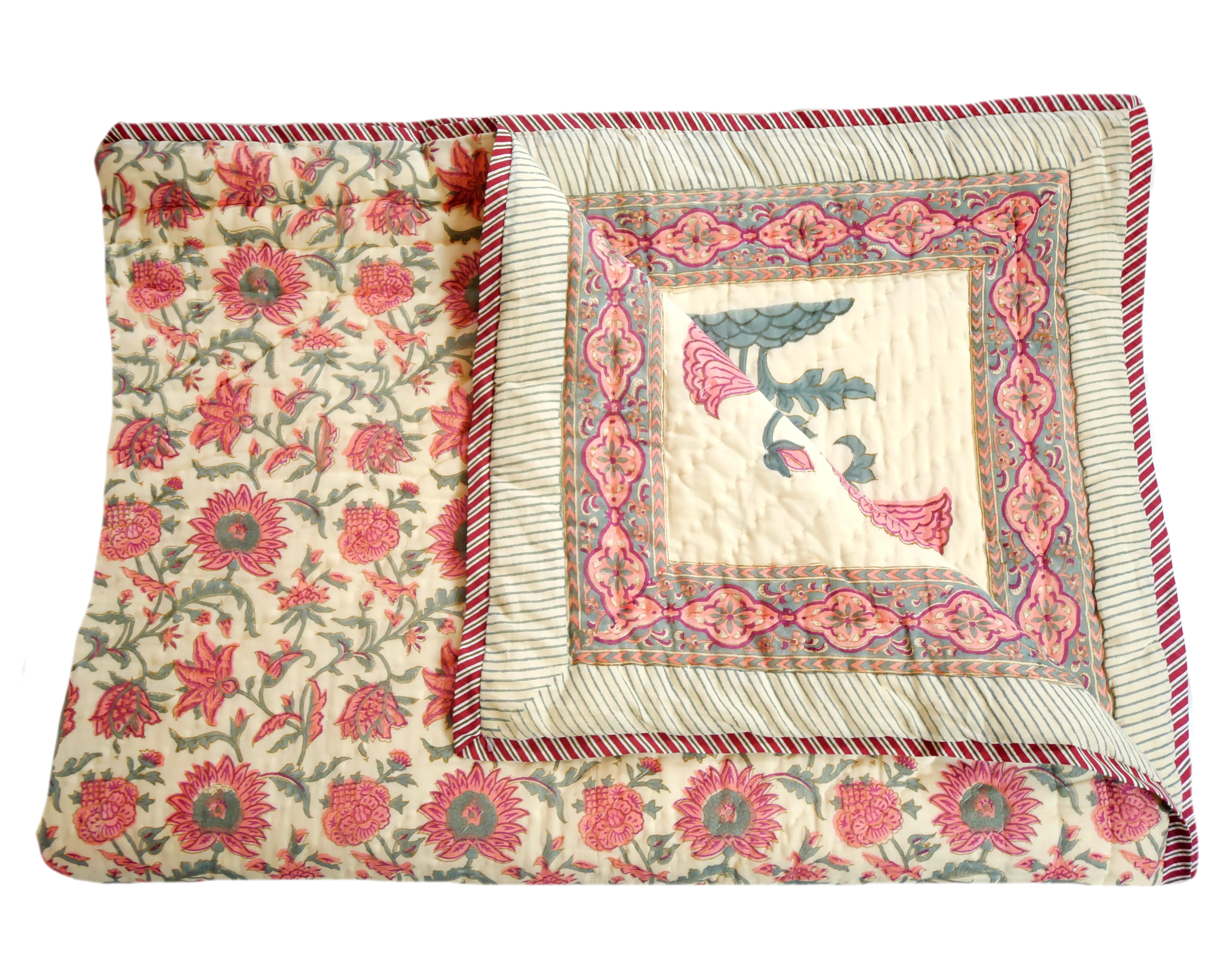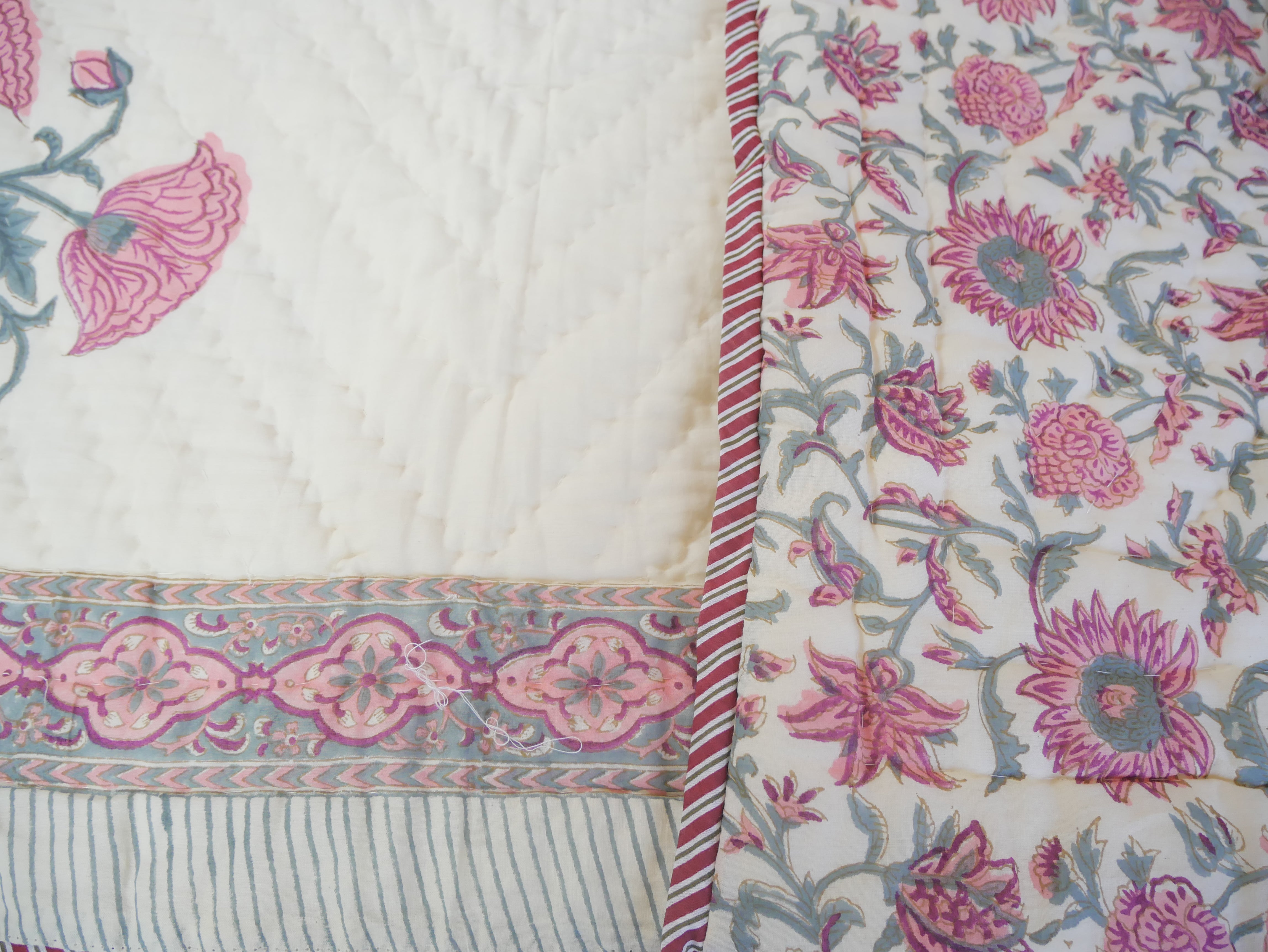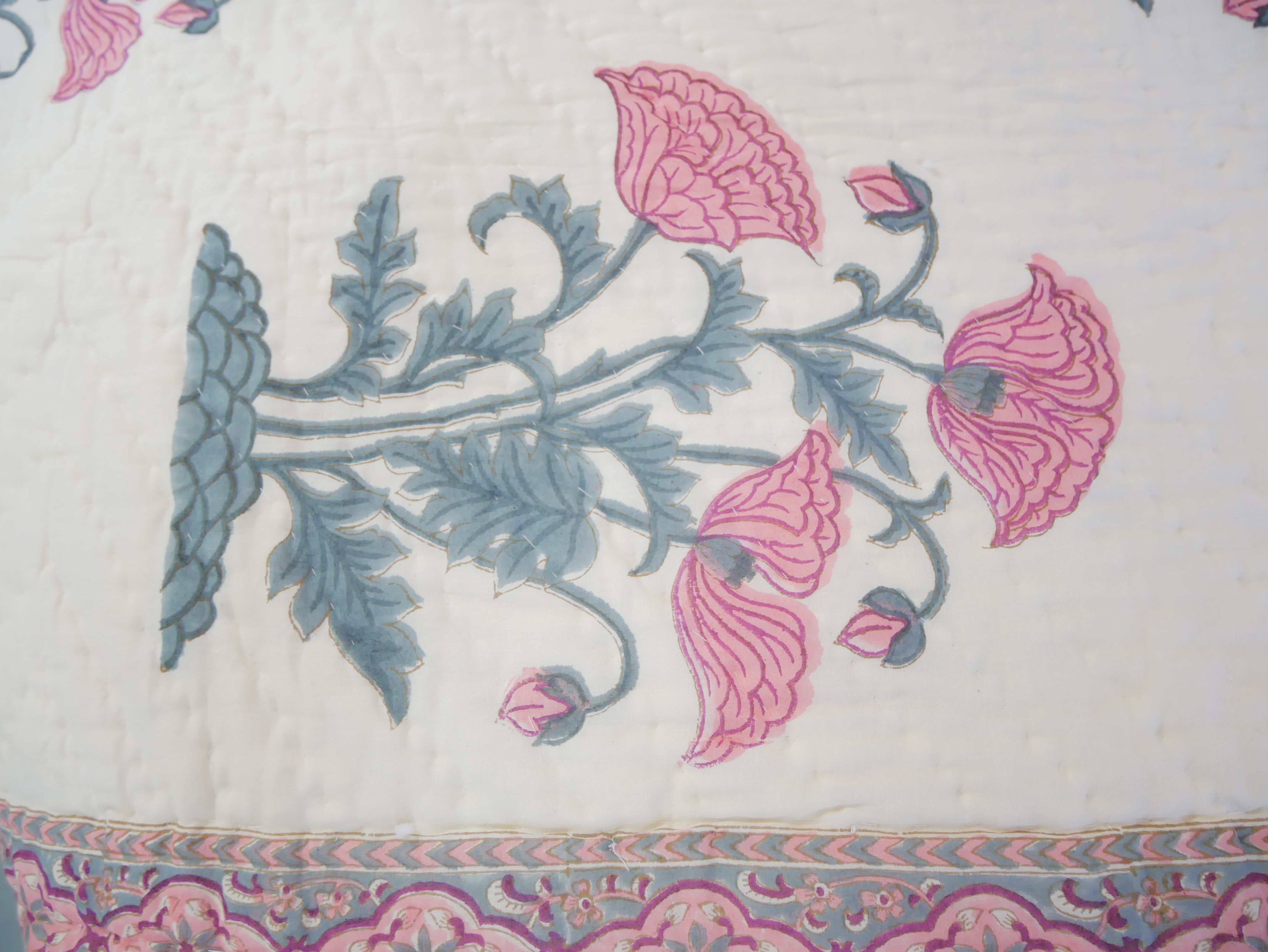 Es ist handgenäht und weist aufwendige handgemachte Blockdrucke aus Rajasthan auf.