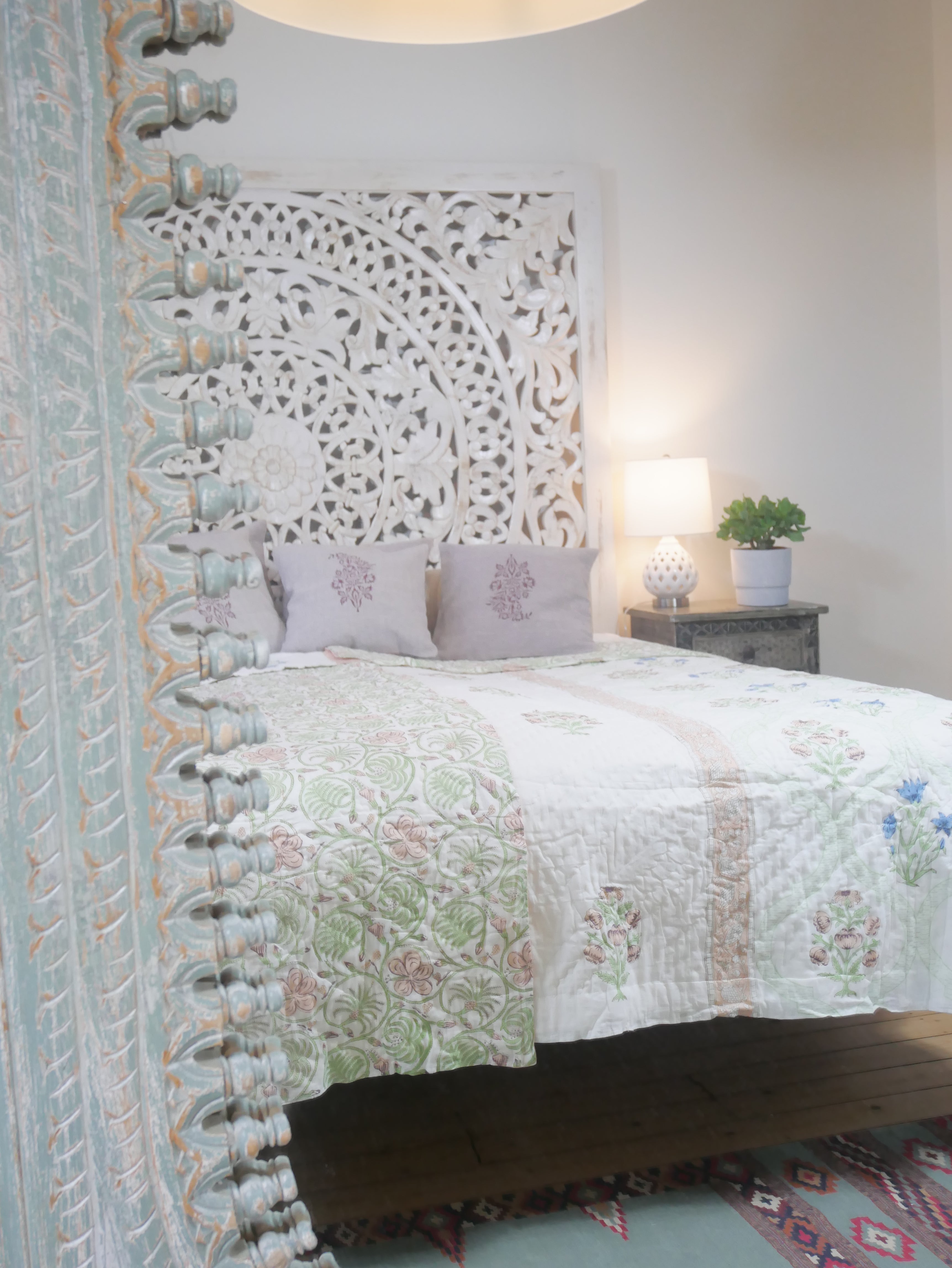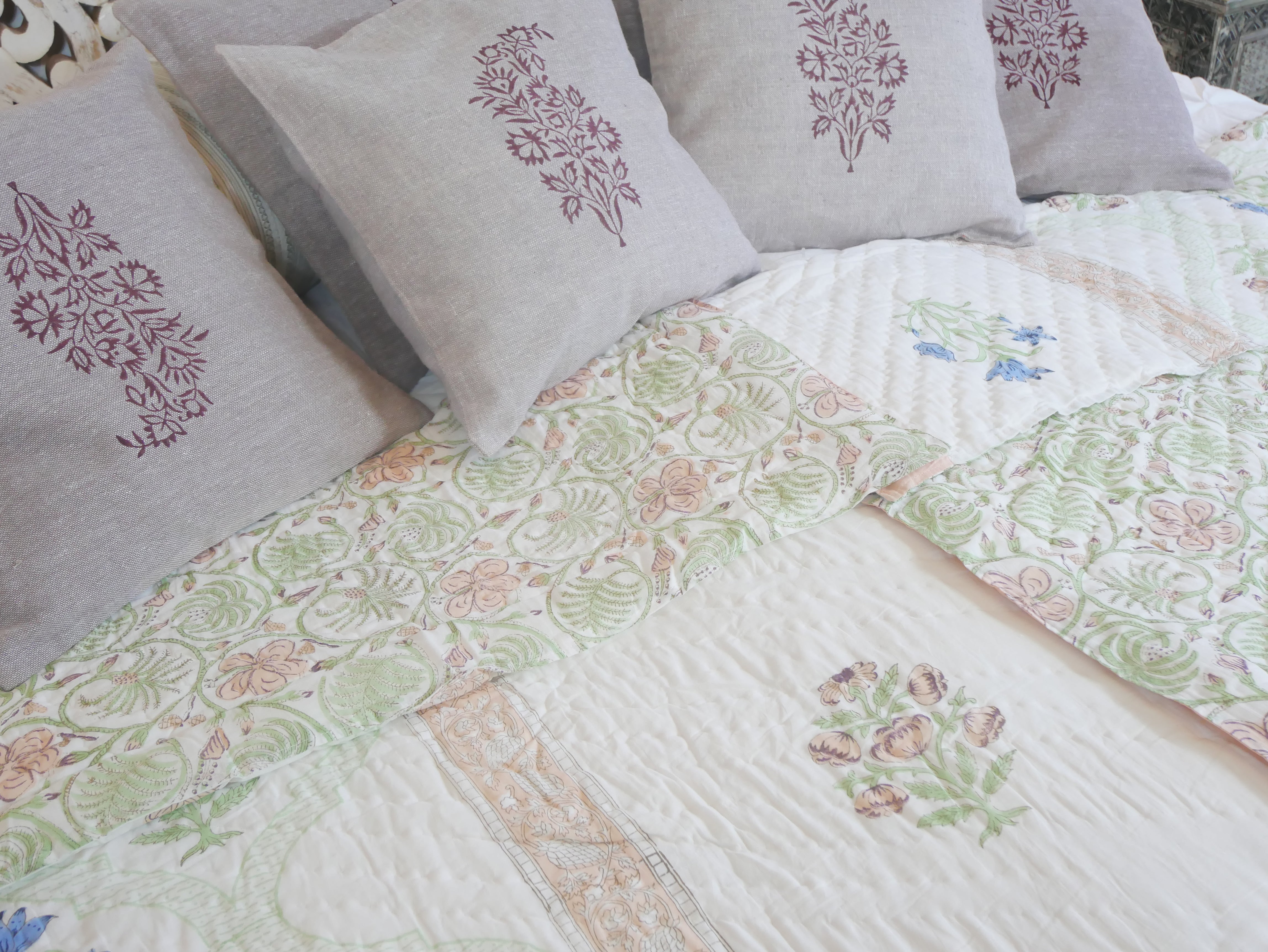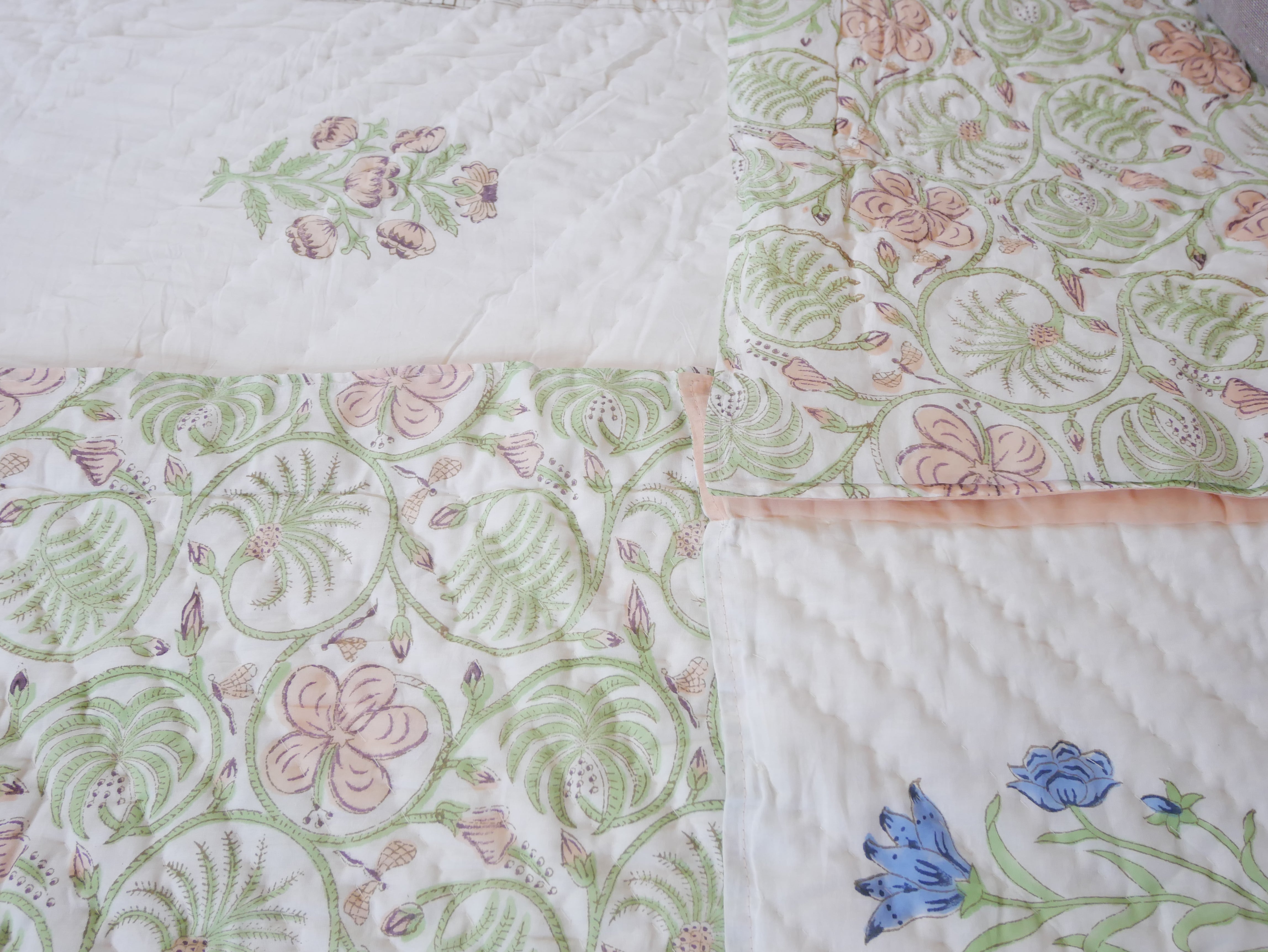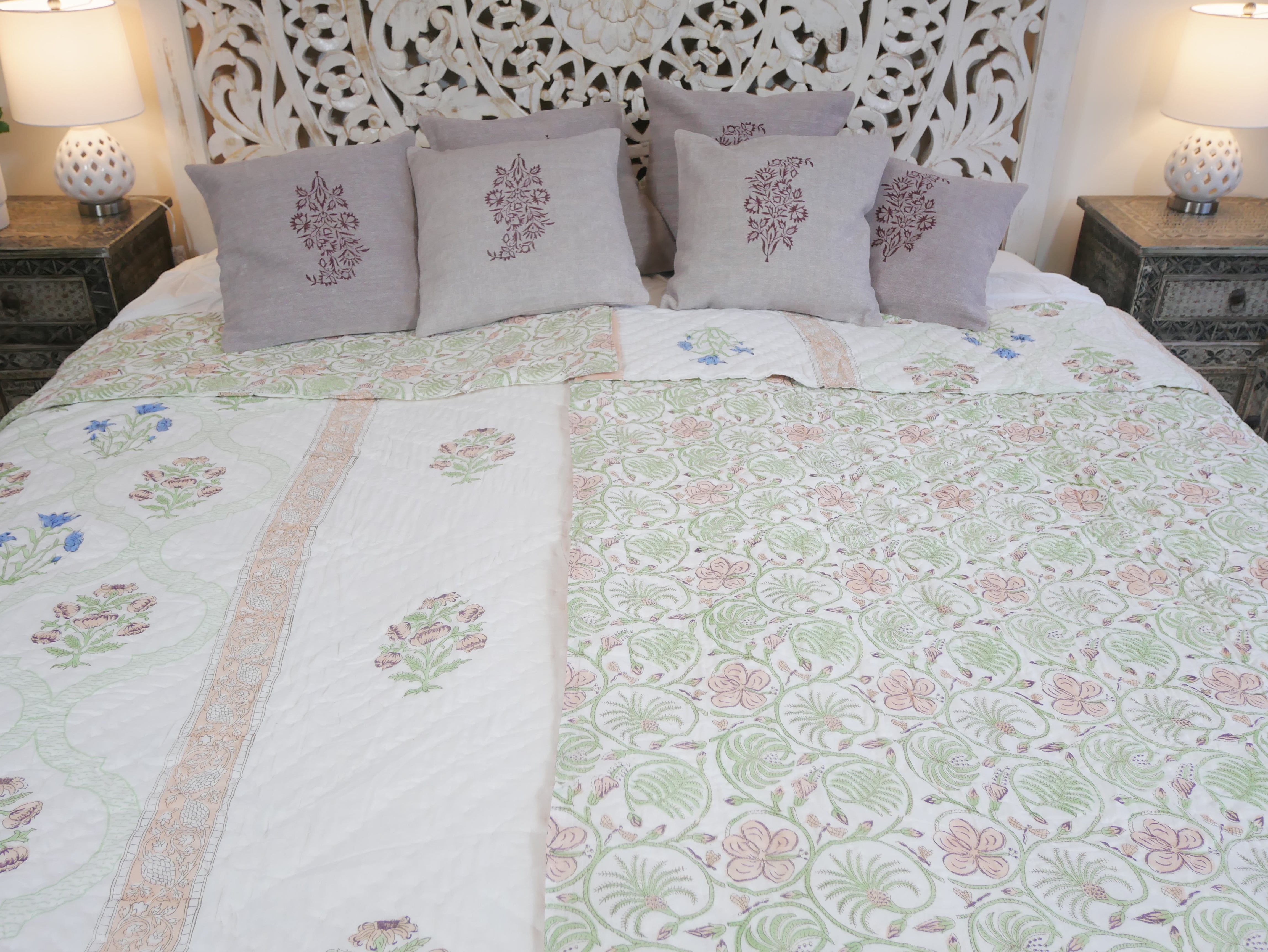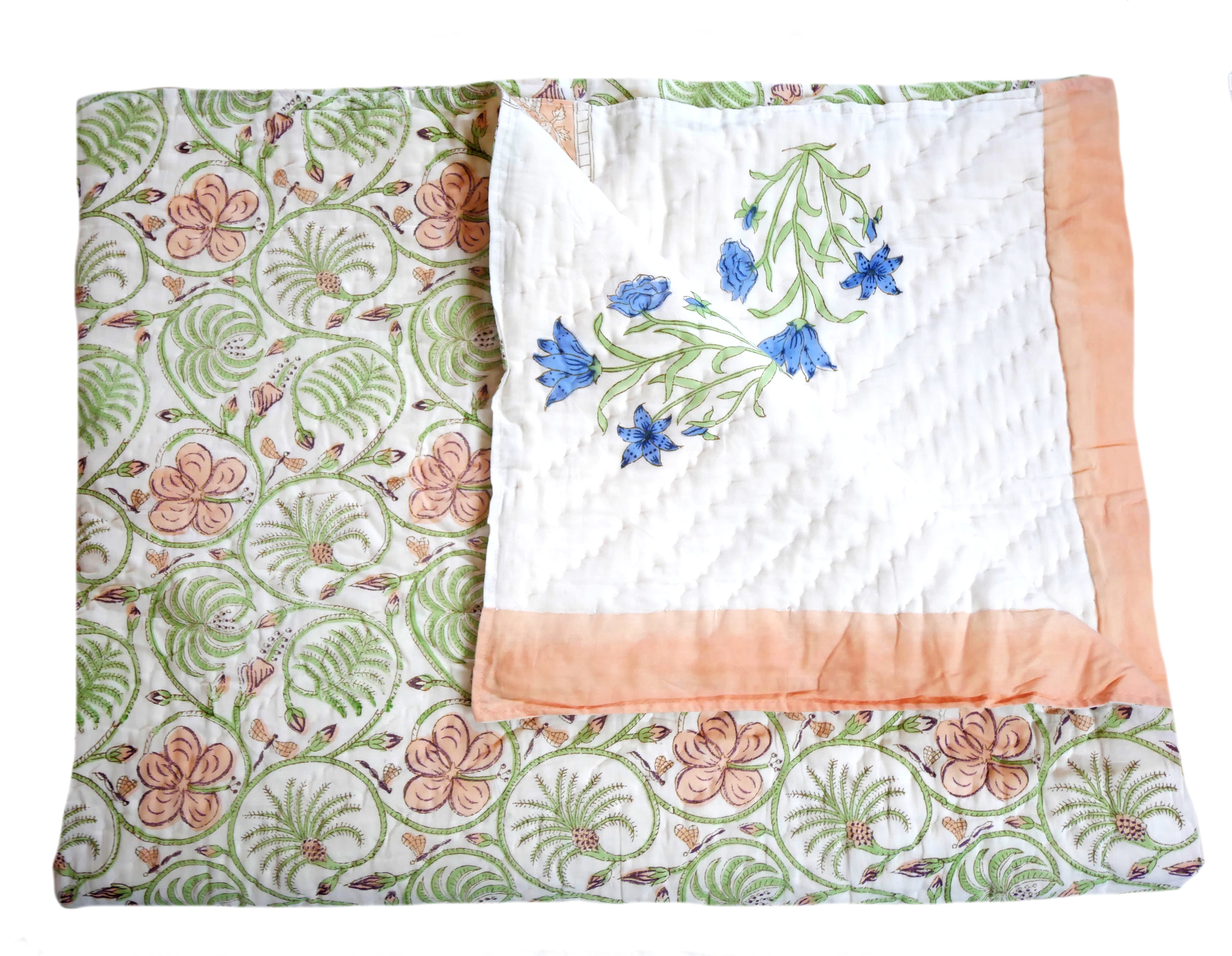 Es ist handgenäht und weist aufwendige handgemachte Blockdrucke aus Rajasthan auf.