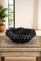 A sculptural statement in stone, this folded black marble bowl is a true celebration of form and craftsmanship. Hand-carved in India, its rhythmic, wave-like folds create an expressive silhouette that captures both shadow and light in dramatic fashion.