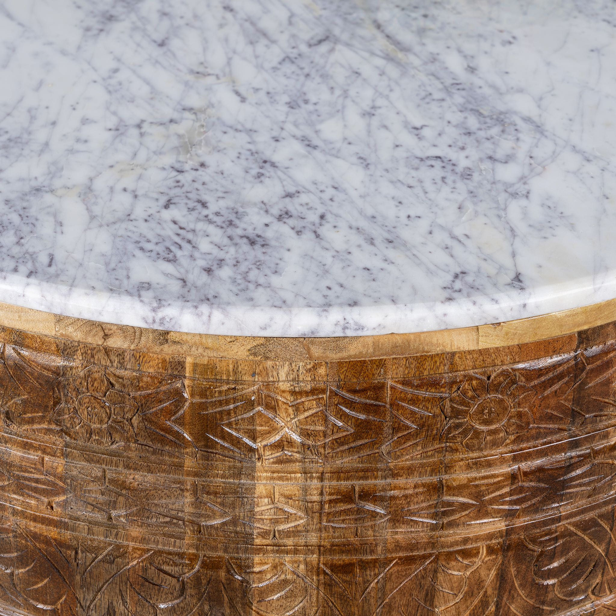 Werten Sie Ihren Wohnraum auf mit diesem handgeschnitzter Couchtisch aus Mangoholzmit einem atemberaubenden weiße Marmorplatte das einen schönen Kontrast zu den warmen Tönen des Holzes bildet. tonnenförmiger Sockel besteht aus massives Mangoholz, präsentiert aufwendige handgeschnitzte Details das einen Hauch von global inspiriertem Charme verleiht.