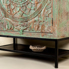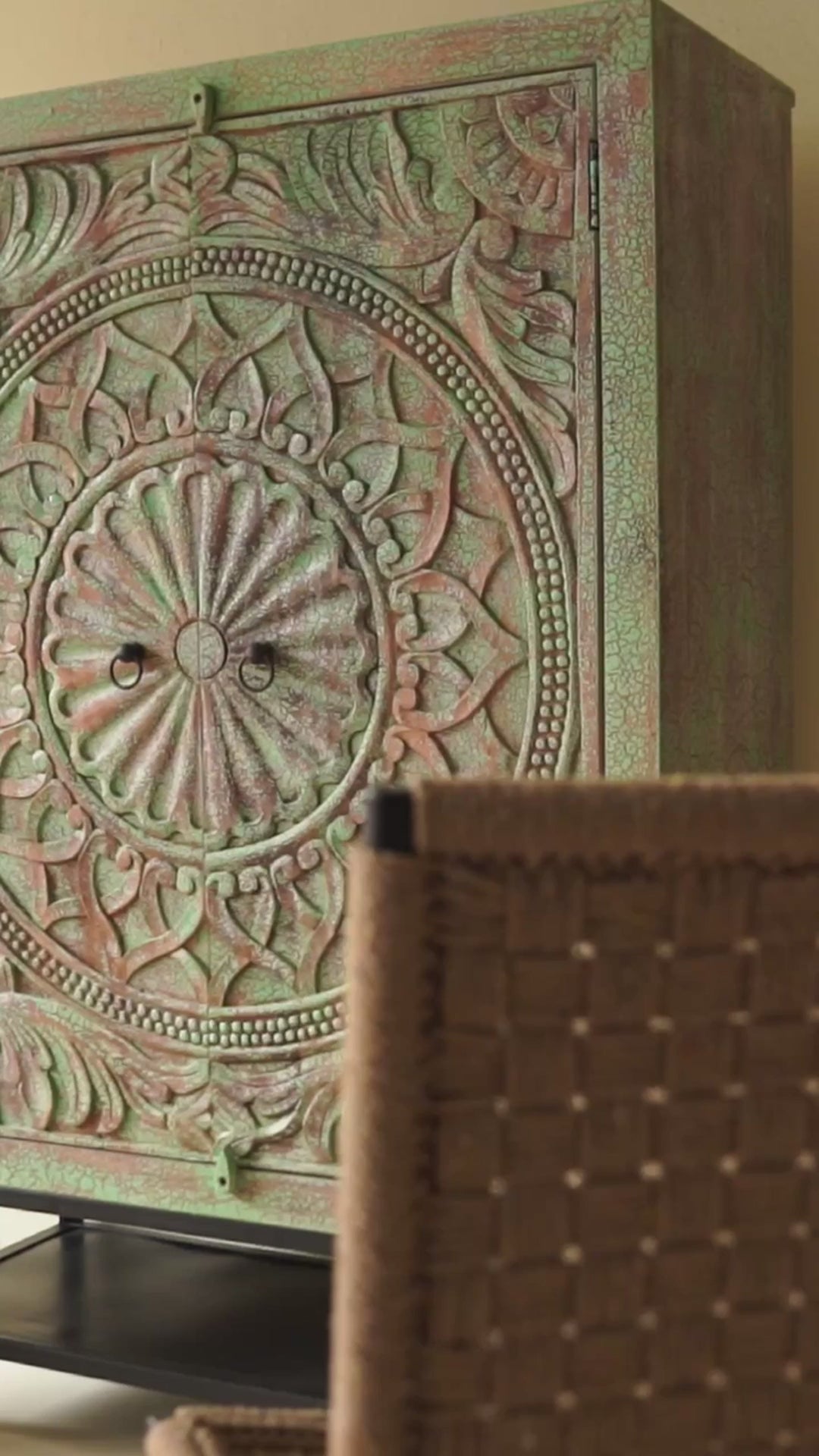 Dieser exquisite handgeschnitzte Schrank Puri vereint Kunstfertigkeit und Funktionalität und verleiht Ihrem Interieur eine unkonventionelle Note. Er ist fachmännisch aus massivem Mangoholz gefertigt und weist aufwendige florale Schnitzereien auf, die die Schönheit traditioneller Handwerkskunst widerspiegeln. Eine dreischichtige Farbbehandlung wertet die verwitterte Oberfläche auf und erzeugt einen lebendigen und doch erdigen Look, der die von Ibiza inspirierte Ästhetik einfängt.