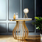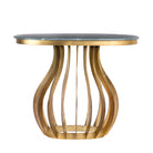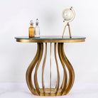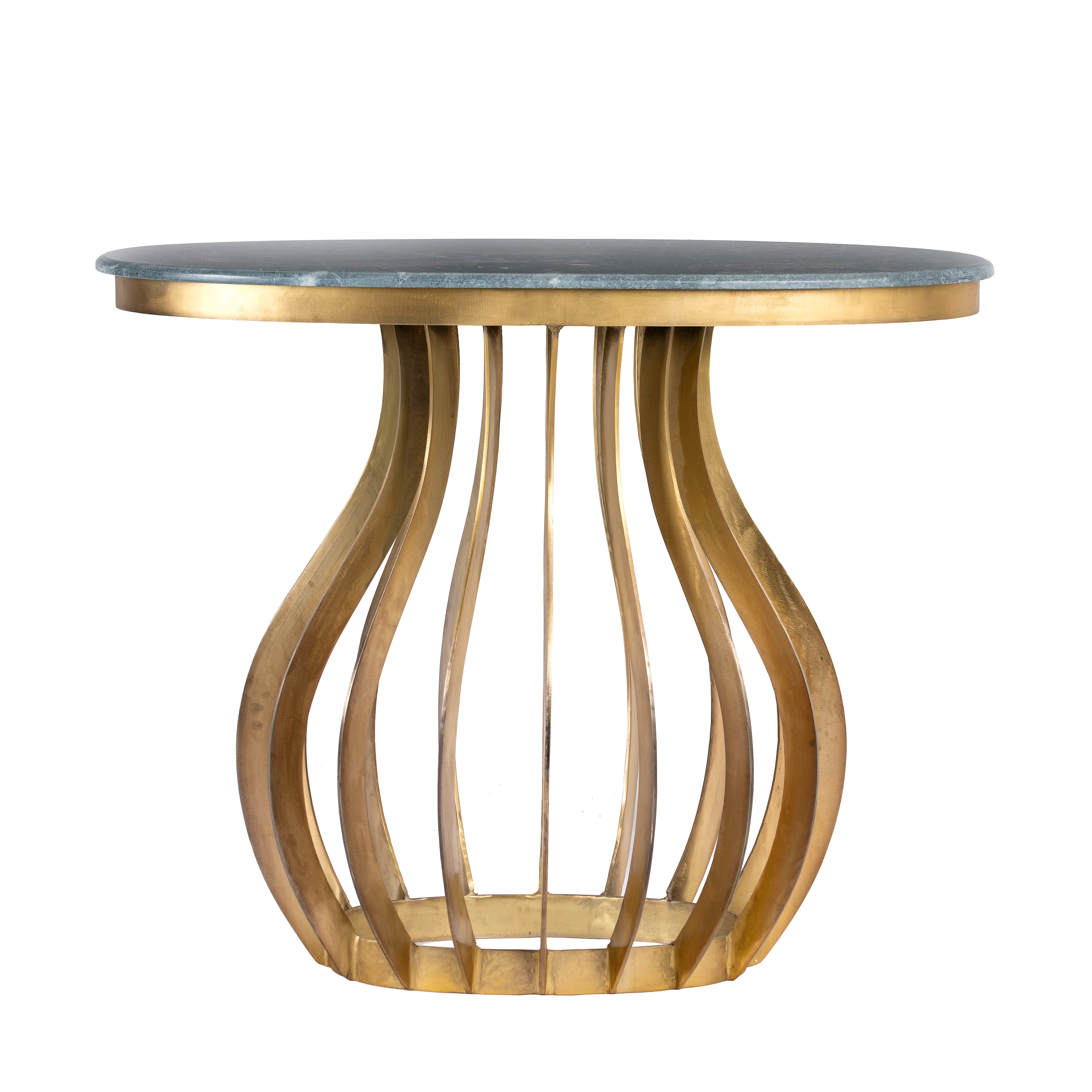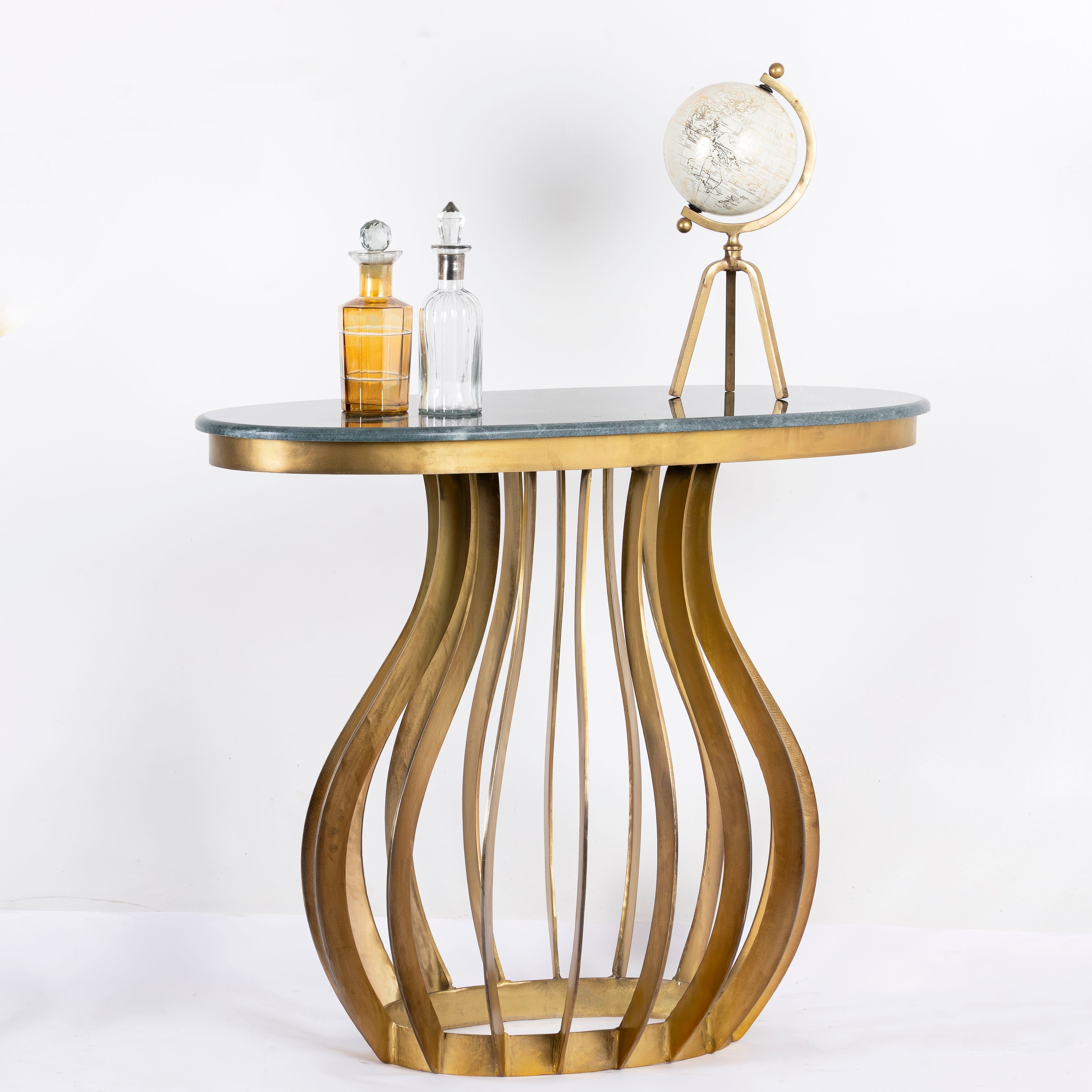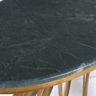 Der aus Schmiedeeisen gefertigte Tisch verfügt über ein auffälliges Streifendesign auf seinem ovalen Rahmen, das von sorgfältiger Handwerkskunst und Langlebigkeit zeugt. Die grüne Marmorplatte verleiht einen Hauch von Luxus und Raffinesse und bietet mit ihrer natürlichen Maserung und glatten Oberfläche den perfekten Hintergrund für Getränke, Bücher oder Dekorationsgegenstände.