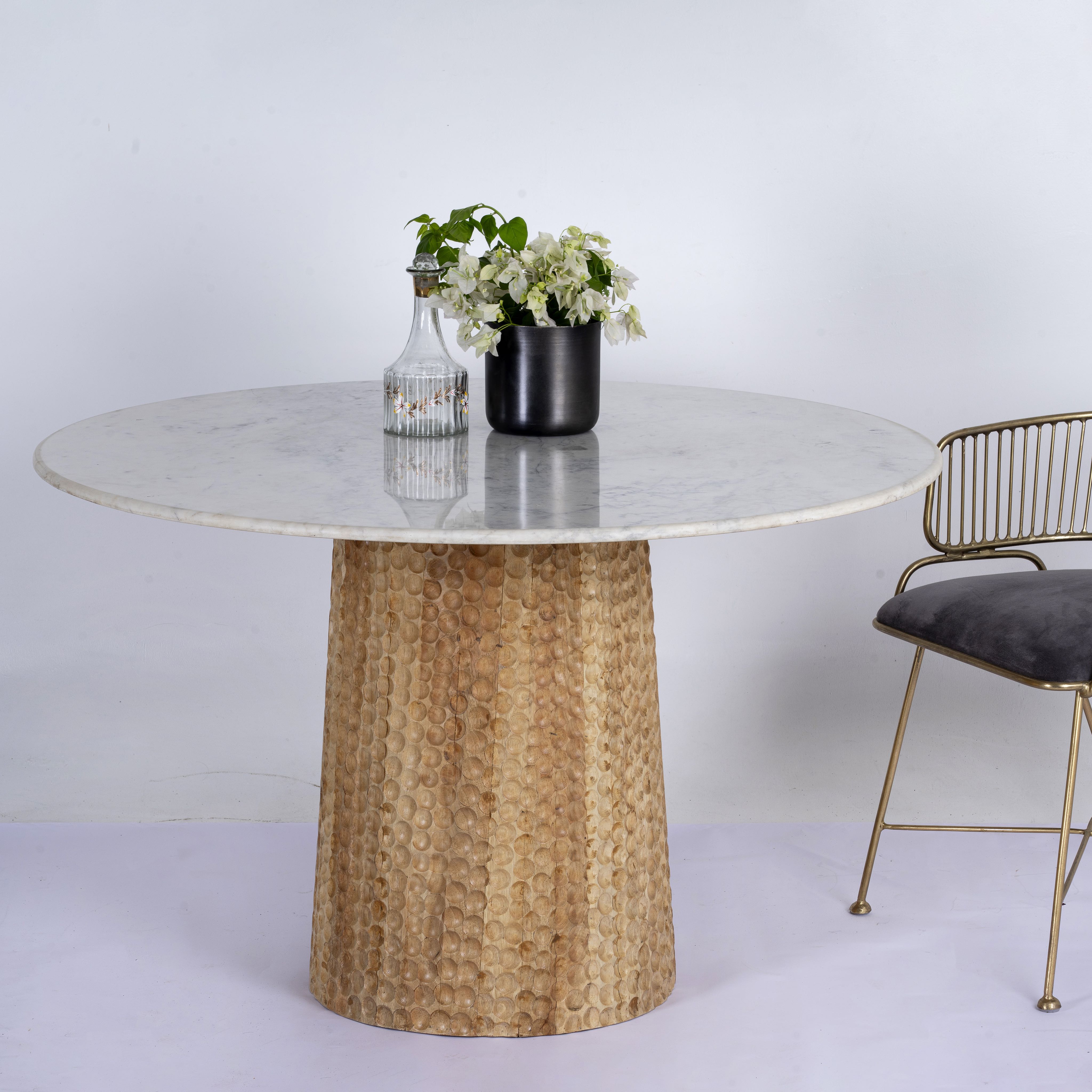 Dieser markante Designertisch ist nicht nur ein funktionales Möbelstück, sondern auch ein Statement für Stil und Handwerkskunst. Die Kombination aus natürlicher Marmorplatte und aufwendig gestaltetem Holzsockel schafft eine anspruchsvolle Ästhetik, die sowohl zu modernen als auch zu klassischen Inneneinrichtungen passt. Dieser Esstisch eignet sich perfekt für elegante Dinnerpartys oder den Genuss alltäglicher Mahlzeiten und bietet eine einzigartige und einladende Umgebung für all Ihre kulinarischen Erlebnisse.