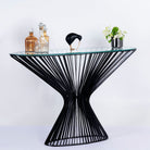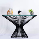 Wir präsentieren ein Statement-Stück für Ihren Flur oder Wohnraum: die schmiedeeiserne Konsole im ovalen Design mit abgeschrägtem Glas.