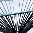 Der ovale Rahmen, sorgfältig aus Eisen geschmiedet, strahlt Stärke und Haltbarkeit aus. Die abgeschrägte Glasplatte verleiht Eleganz, reflektiert Licht und erzeugt ein Gefühl von Großzügigkeit.