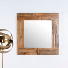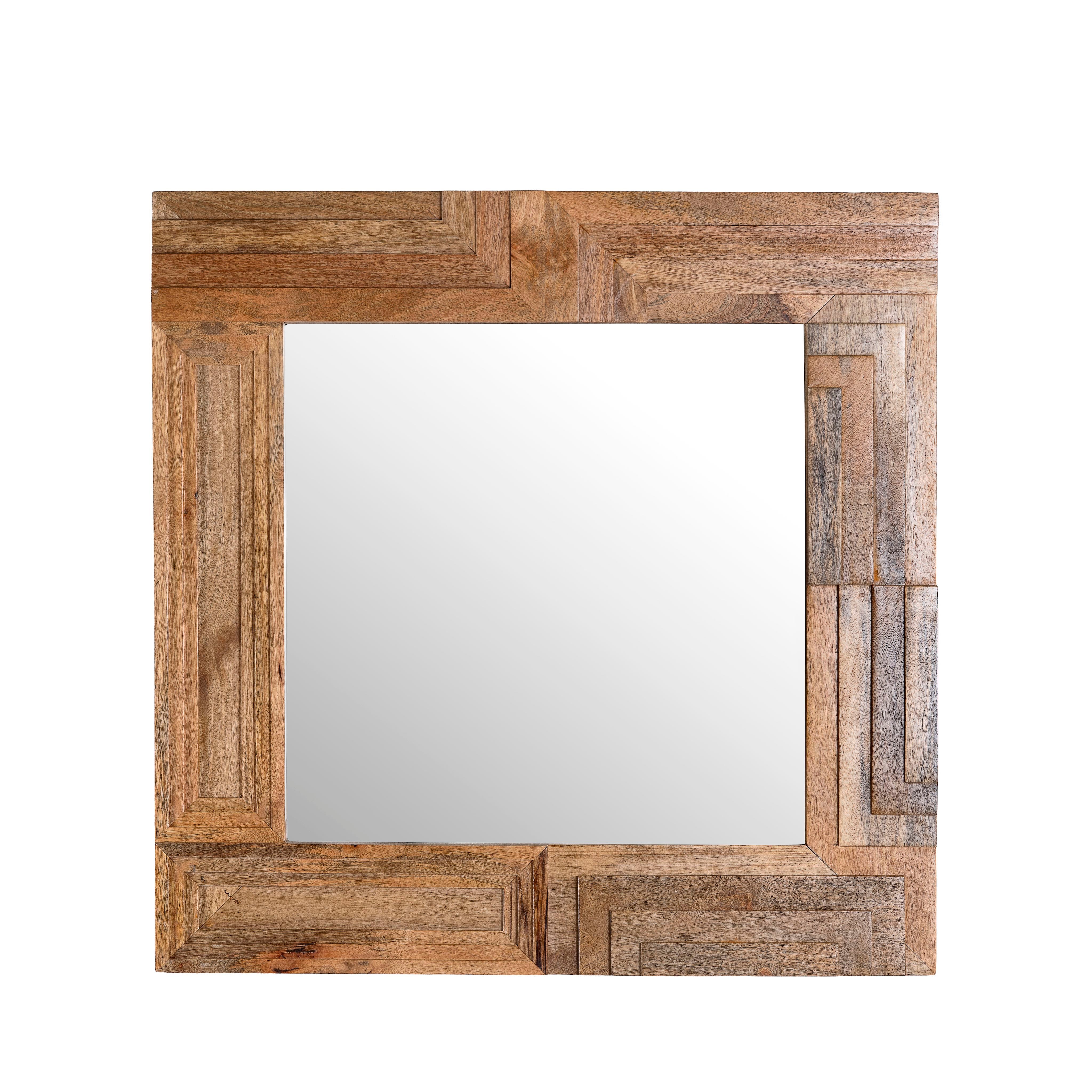 Dieser stilvolle Spiegel verfügt über ein quadratisches Holzdesign, sorgfältig handgefertigt aus natürlichem Mangoholz. Sein einzigartiges Muster und die hochwertige Verarbeitung machen es zu einem herausragenden Stück, das jedem Raum einen Hauch von Eleganz verleiht.