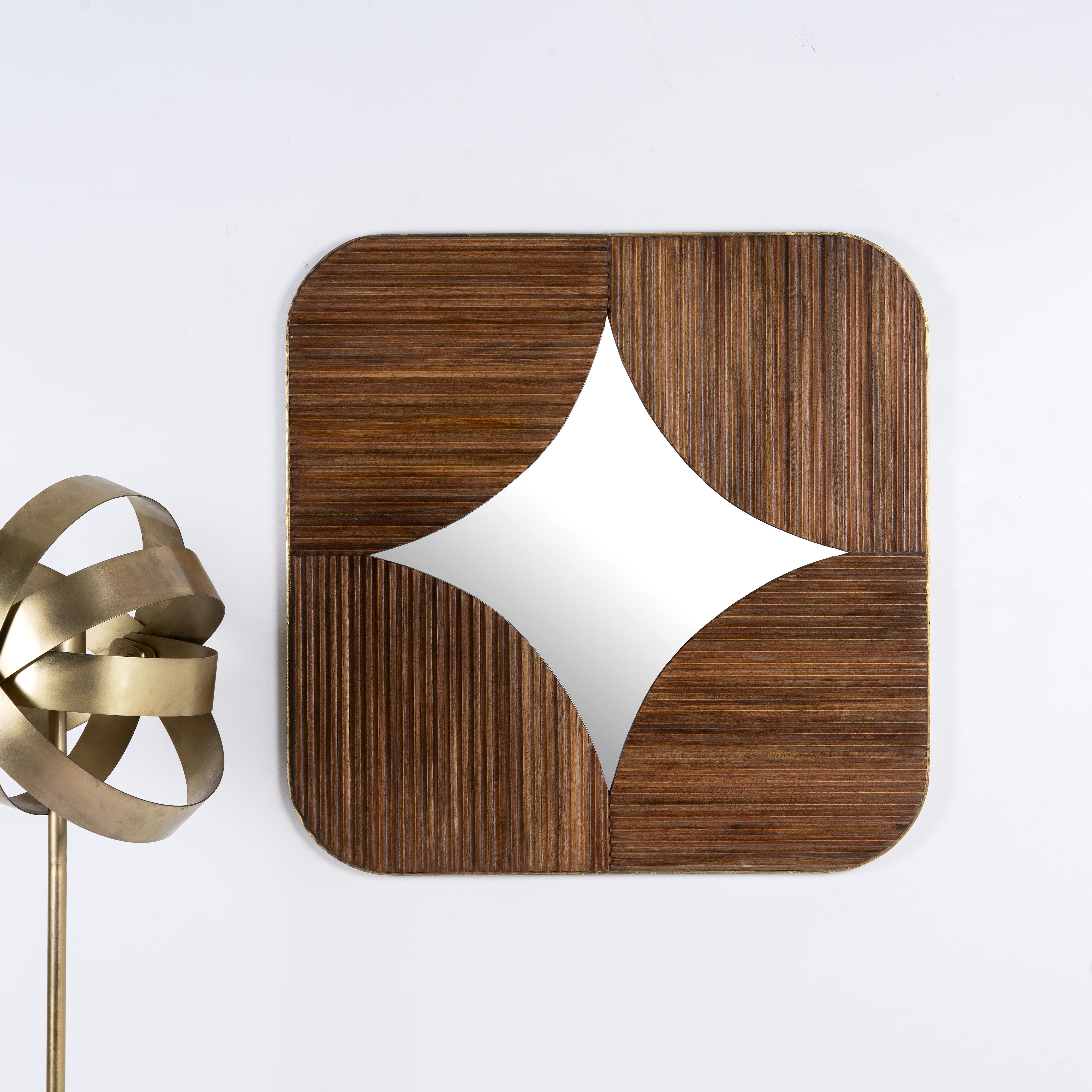 Lernen Sie unseren schönen großen Designerspiegel Mahadhyuta kennen, ein echtes Statement-Stück aus hochwertigem Mangoholz. Dieser elegante Spiegel kommt  in Braun, das die natürliche Holzmaserung hervorhebt und einen Hauch zeitgenössischen Charmes verleiht. Der Blickfang dieses Designs ist das gestreifte, geschwungene Muster.
