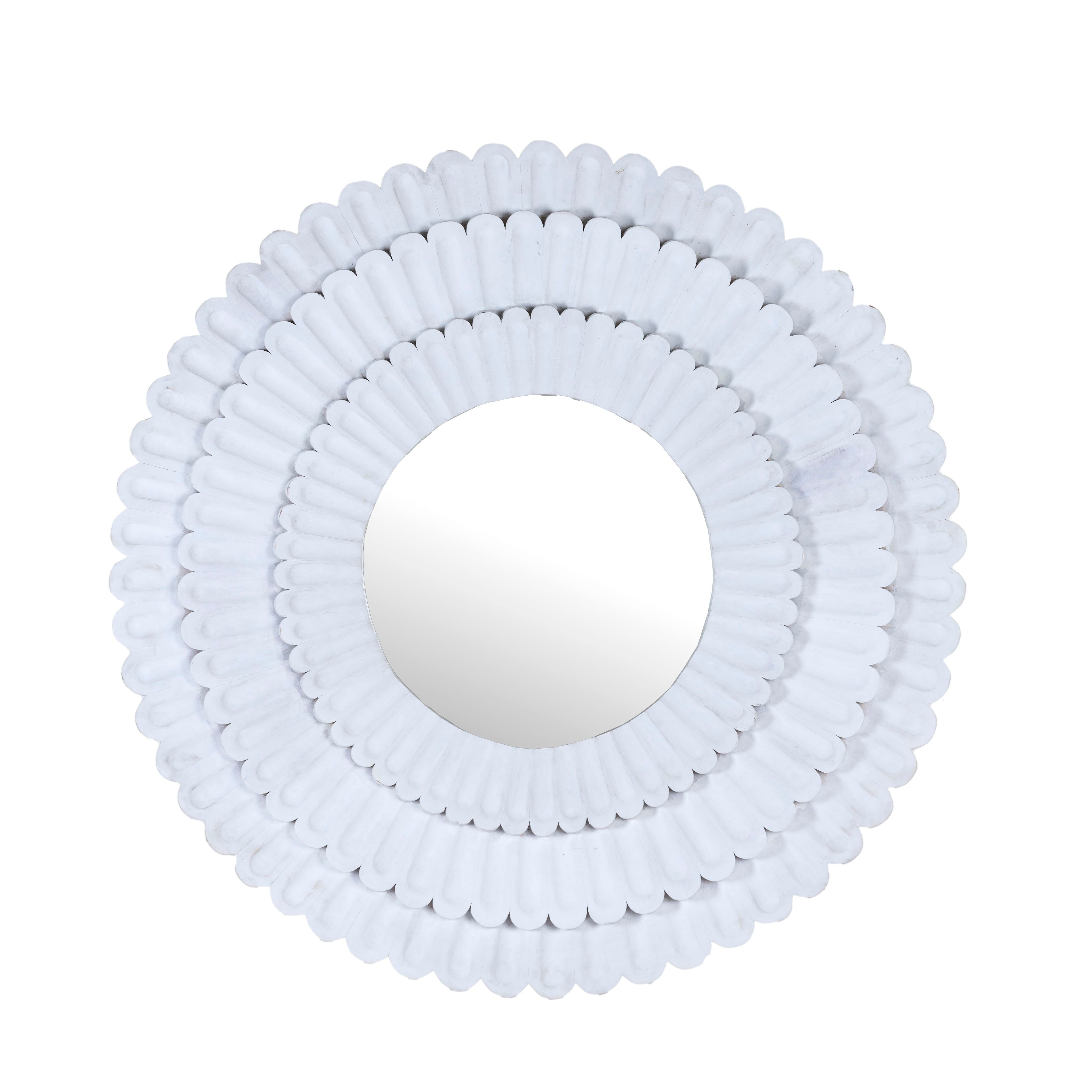 Verleihen Sie Ihrem Zuhause mit diesem weiß getünchten 3-Schicht-Designerspiegel mit ausgestanzten Blumen einen Hauch zeitloser Eleganz. Dieser handgefertigte Spiegel aus natürlichem Mangoholz strahlt einen rustikalen Charme aus und zeugt von exquisiter Handwerkskunst.