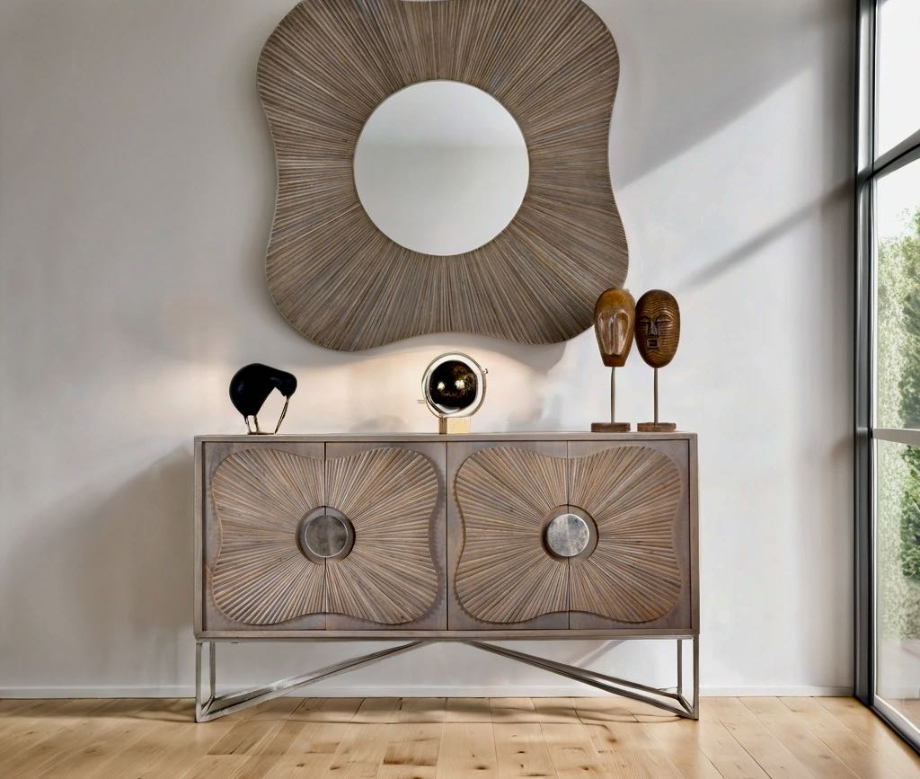 Lernen Sie unseren wunderschönen großen Designerspiegel kennen, ein echtes Statement-Stück aus hochwertigem Mangoholz. Dieser elegante Spiegel hat eine raffinierte graue Waschung, die die natürliche Holzmaserung hervorhebt und einen Hauch von modernem Charme verleiht. Im Mittelpunkt dieses Designs steht das faszinierende Wellen-Sonnenstrahlen-Muster.