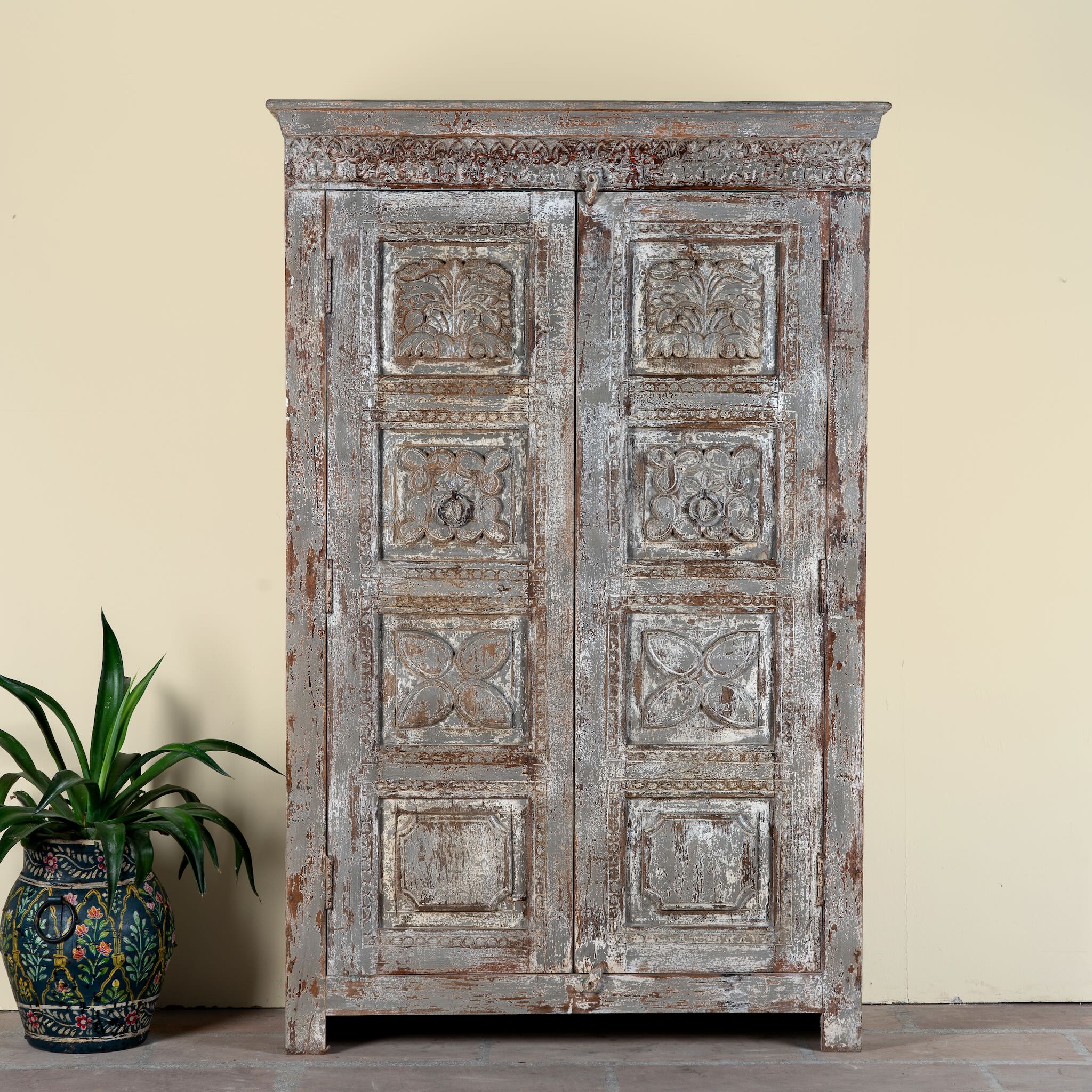 Introducing our cabinet Atharva, a striking example of reclaimed wood furniture that merges artistic detail with sustainable living. Crafted from reclaimed teak wood, this one-of-a-kind cabinet showcases hand-carved floral panels across both doors, beautifully aged in a vintage distressed finish that reveals layers of history, patina, and character.