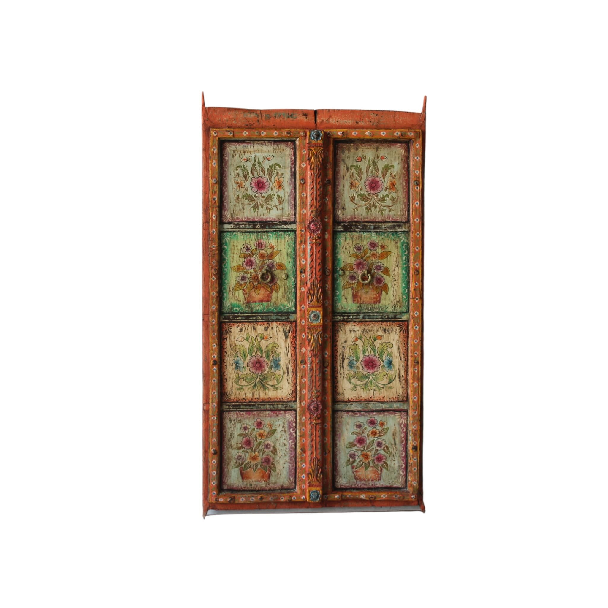 Introducing our wall panel Malhar, a delicate and romantic Indian door transformed into a floral Indian painted door decoration. Crafted from reclaimed solid teak wood and hand-painted in Rajasthan, Malhar features charming panels adorned with blooming flowers, ornate foliage, and decorative pots—each rendered in soft tones of cream, terracotta, and green.