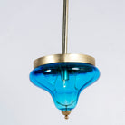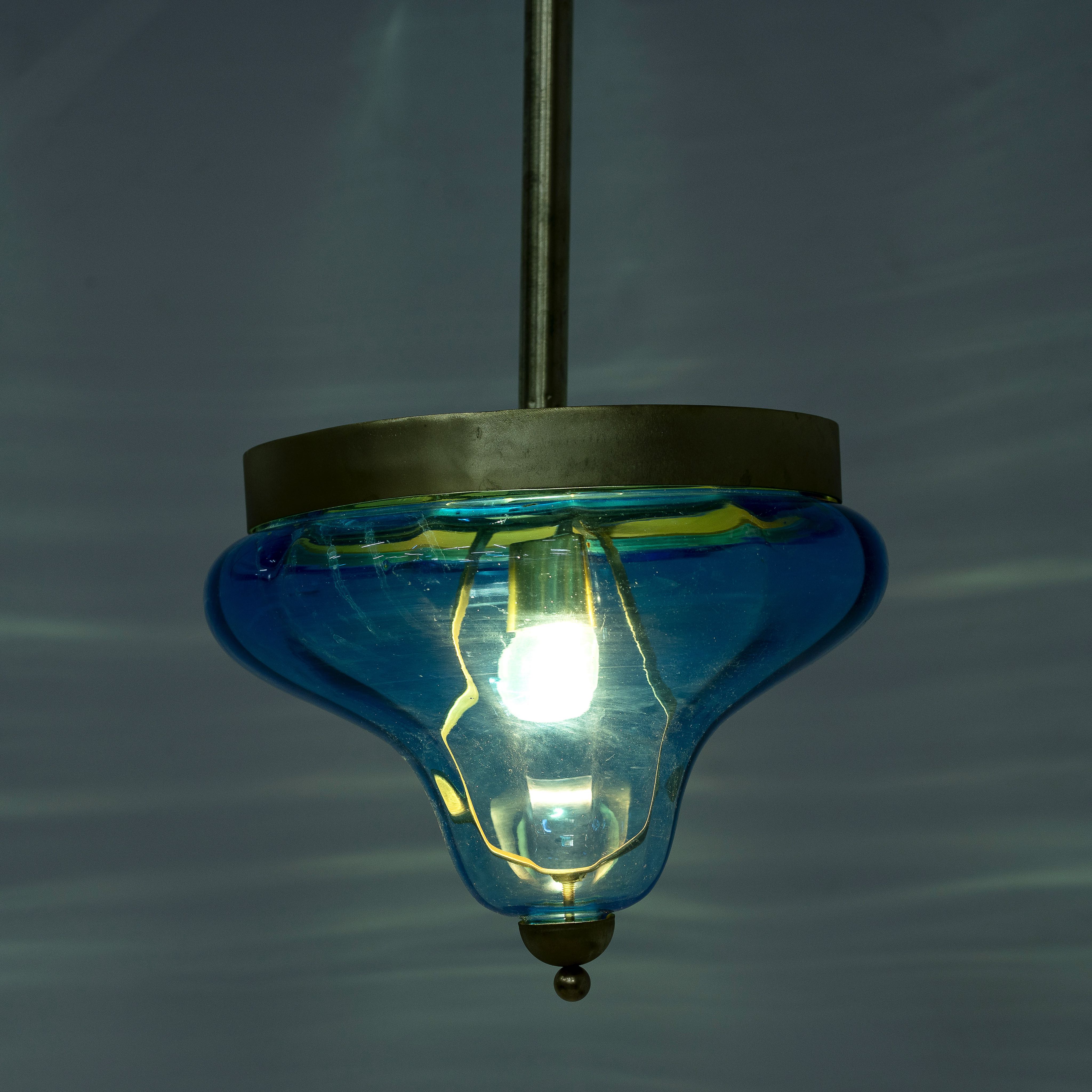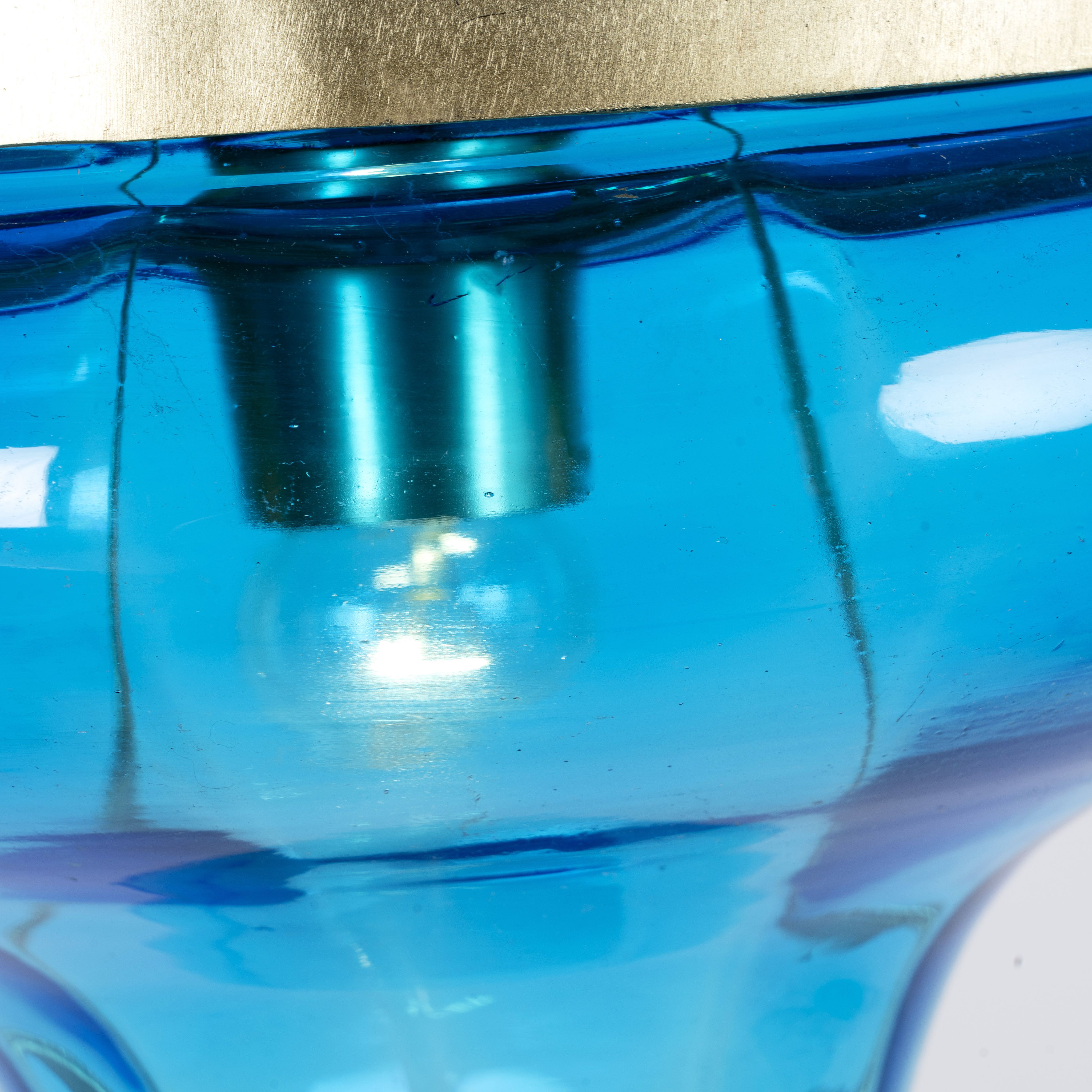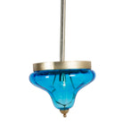 Wir stellen Ihnen unsere atemberaubende große Lampe Madhurima aus blauem Glas vor, eine perfekte Mischung aus zeitloser Eleganz und moderner Raffinesse. Diese exquisite Lampe verfügt über einen wunderschön gefertigten blauen Glasschirm und bietet einen lebendigen Farbtupfer, der jedem Innenraum eine erfrischende Note verleiht. Der Glasschirm wird durch einen stabilen Rahmen ergänzt, der sorgfältig mit luxuriösem Messing beschichtet ist, was seine optische Attraktivität unterstreicht und einen Hauch von Opulenz verleiht.