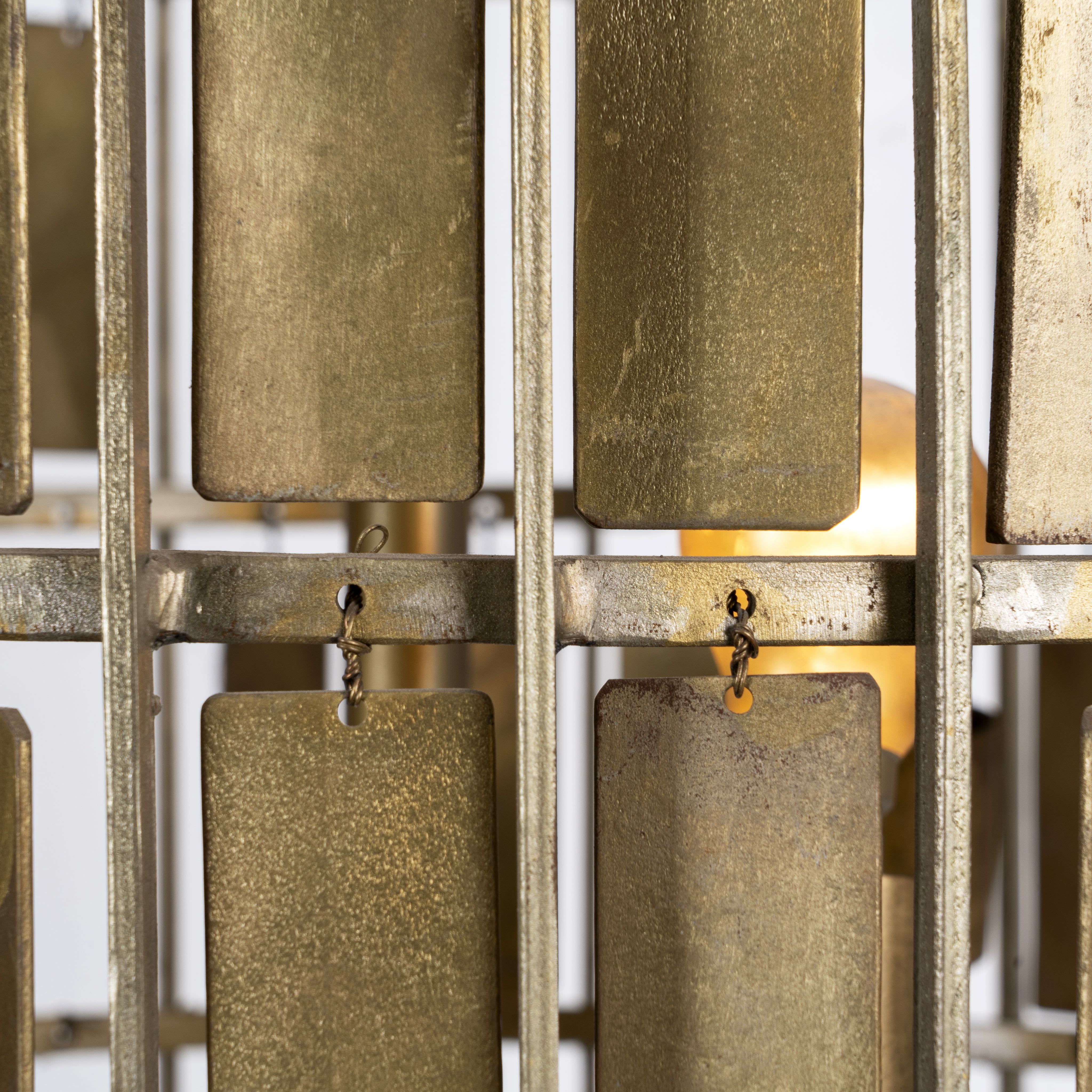 Die Lampe ist mit drei Leuchten ausgestattet, die für reichlich Beleuchtung sorgen und gleichzeitig durch das aufwendige Fliesendesign ein faszinierendes Spiel aus Licht und Schatten erzeugen. Diese Kombination aus robuster Eisenkonstruktion und Messingbeschichtung sorgt nicht nur für Langlebigkeit, sondern verleiht der Gesamtästhetik auch eine raffinierte Note.