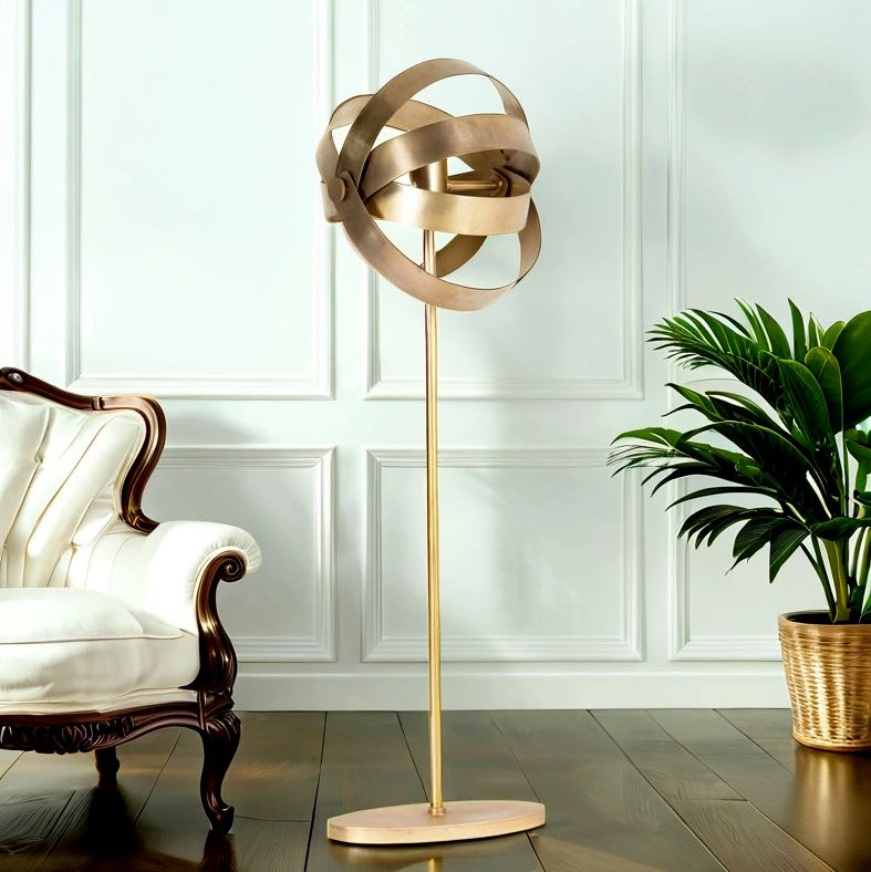 Wir stellen Ihnen unsere markante große Design-Stehleuchte Brinda in Kuppelform aus Eisen vor, eine perfekte Mischung aus Industrie Stil und luxuriöser Eleganz. Diese beeindruckende Stehleuchte verfügt über einen großen, kuppelförmigen, faltbaren Schirm, der sorgfältig aus hochwertigem Eisen gefertigt ist. Die gesamte Lampe ist mit einer Messingbeschichtung versehen, die ihr einen satten, warmen Glanz verleiht, der jeden Innenraum mit einem Hauch von Opulenz aufwertet.