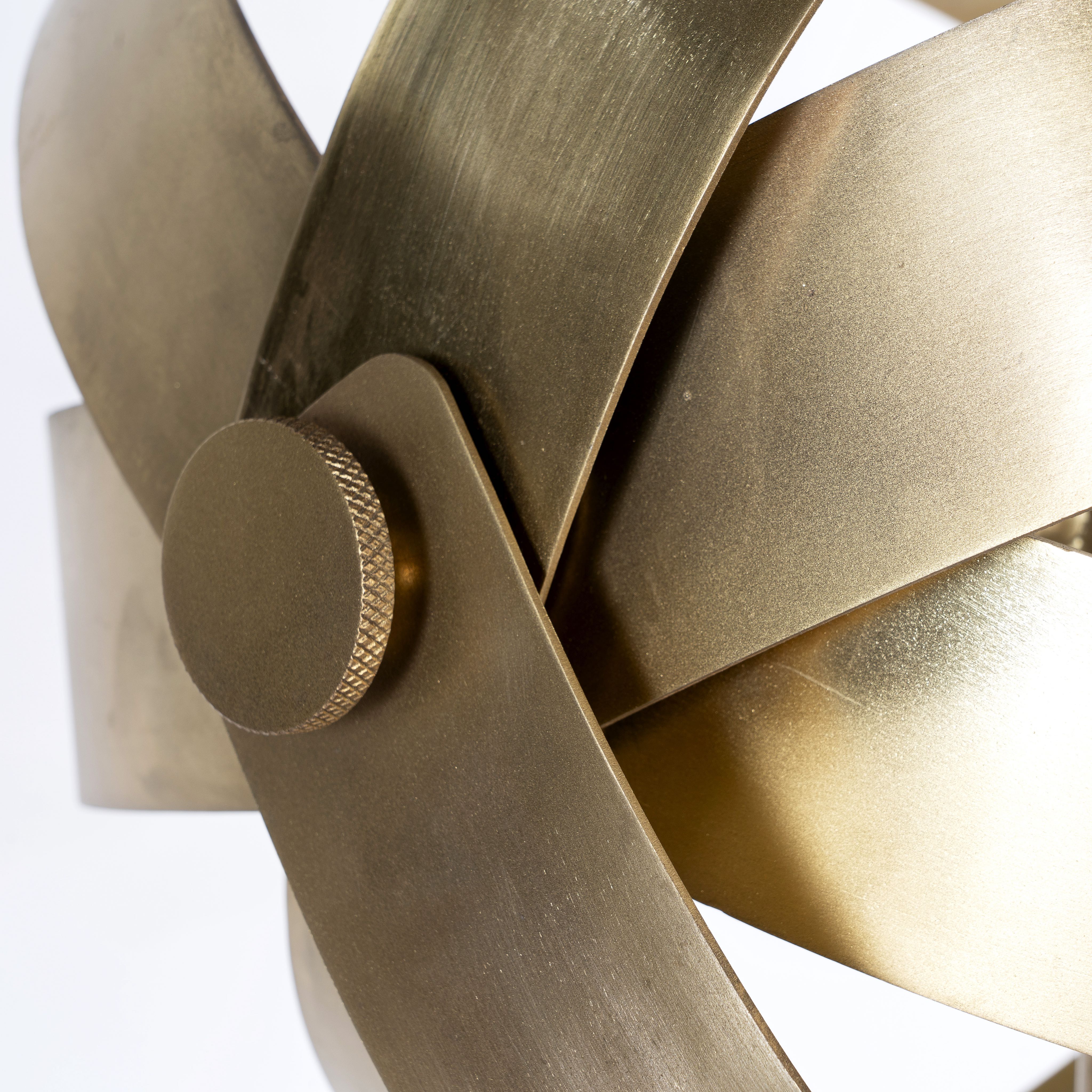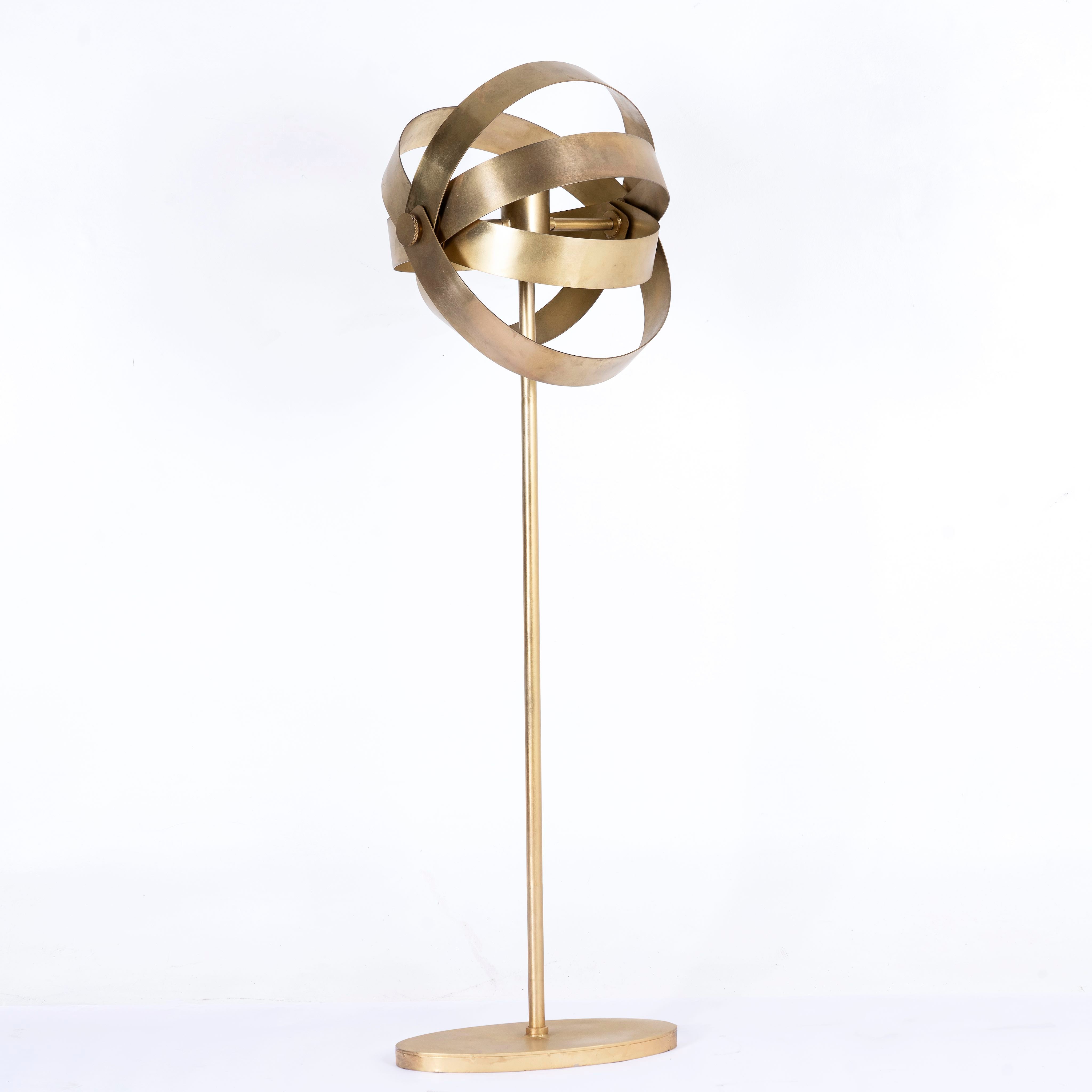 Die robuste Eisenkonstruktion sorgt für Langlebigkeit und Stabilität, während die messingbeschichtete Oberfläche für einen raffinierten Kontrast sorgt und die Gesamtästhetik der Lampe aufwertet. Ihre hohe, eindrucksvolle Präsenz macht sie zum idealen Blickfang in jedem Raum und schafft mit ihrem warmen, diffusen Licht eine einladende Atmosphäre.