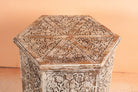 Dieser exquisite handgeschnitzte Couchtisch ist ein wahres Meisterwerk. Er ist aus robustem Mangoholz gefertigt und mit einem dezenten Weißtüncheffekt versehen. Inspiriert vom traditionellen marokkanischen Design verleihen die sechseckige Form und die aufwendigen floralen und geometrischen Schnitzereien jedem Raum ein Gefühl von Eleganz und kulturellem Charme.