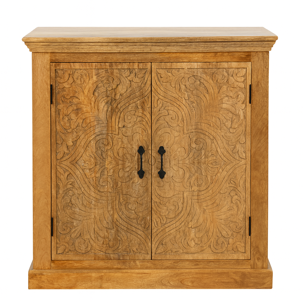 Unser Schrank „Ajmer“ ist im mediterranen Stil gehalten und wird in Ihrem Wohnzimmer, Schlafzimmer oder Badezimmer zum Blickfang. Es bietet mit seinen 2 großen Fächern viel Stauraum. Die Türen sind reich mit handgeschnitzten indischen Schnitzereien verziert.