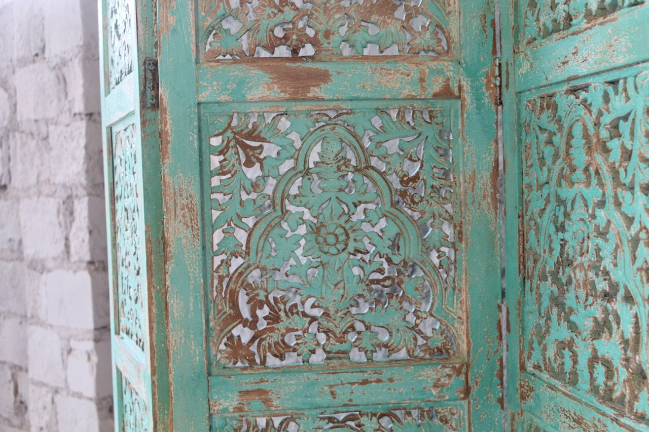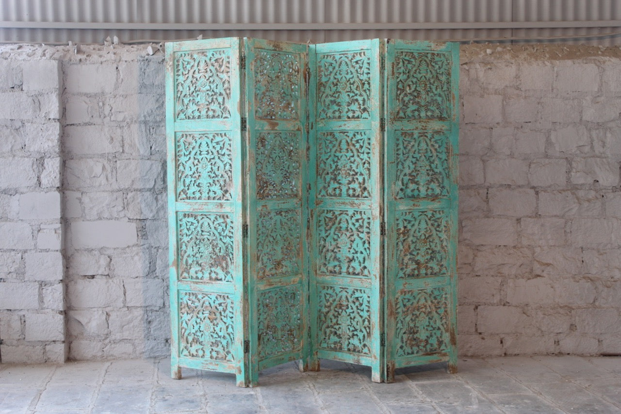 Unser handgeschnitzter faltbarer Raumteiler Alag verwandelt mit seinen filigranen handgeschnitzten Schnitzereien und wunderschönen Farben jeden Raum in einen Urlaubsort.