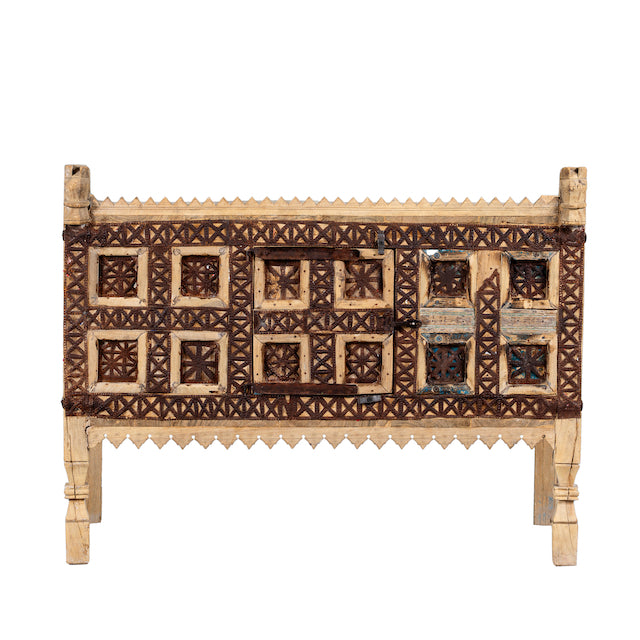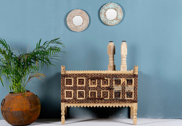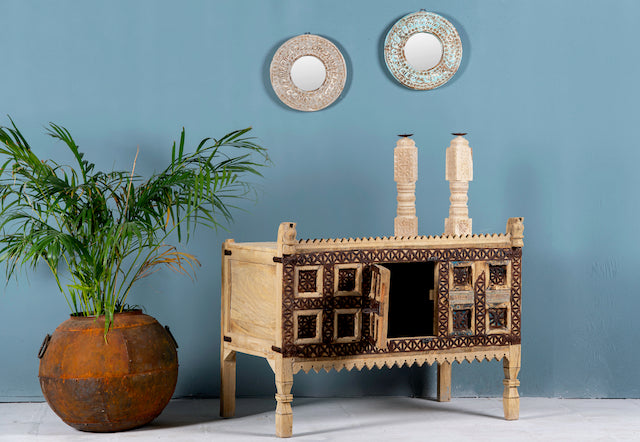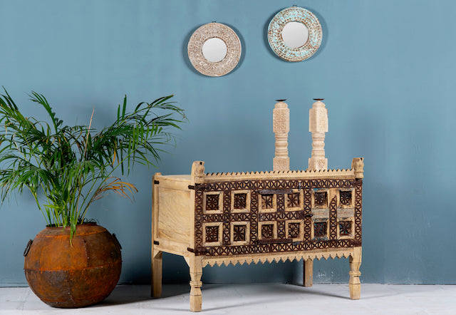 Dieses einzigartige Möbelstück lässt sich mühelos im Ibiza-Stil dekorieren und wird schnell zum Blickfang in jeder Umgebung. Seine zeitlose Anziehungskraft und die aufwendigen Details verleihen jedem Raum einen Hauch exotischen Charmes. Ob als Aufbewahrungstruhe oder als dekorativer Akzent verwendet, dieser restaurierte Damchya strahlt die reiche Geschichte und Handwerkskunst Indiens aus und weckt bei jedem, der ihn sieht, Bewunderung und Ehrfurcht.