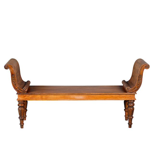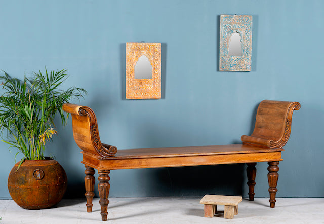 Diese antike indische Teakholzbank Swabi beeindruckt mit einem wunderschön geschnitzten Rahmen und elegant gedrechselten Beinen. Die Bank wurde fachmännisch restauriert und mit Bienenwachs behandelt, was ihr eine warme Honigfarbe und eine glatte Oberfläche verleiht.